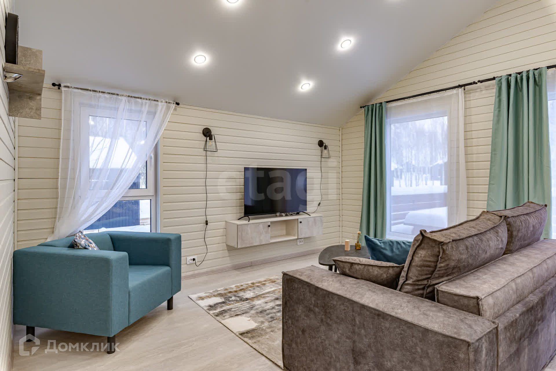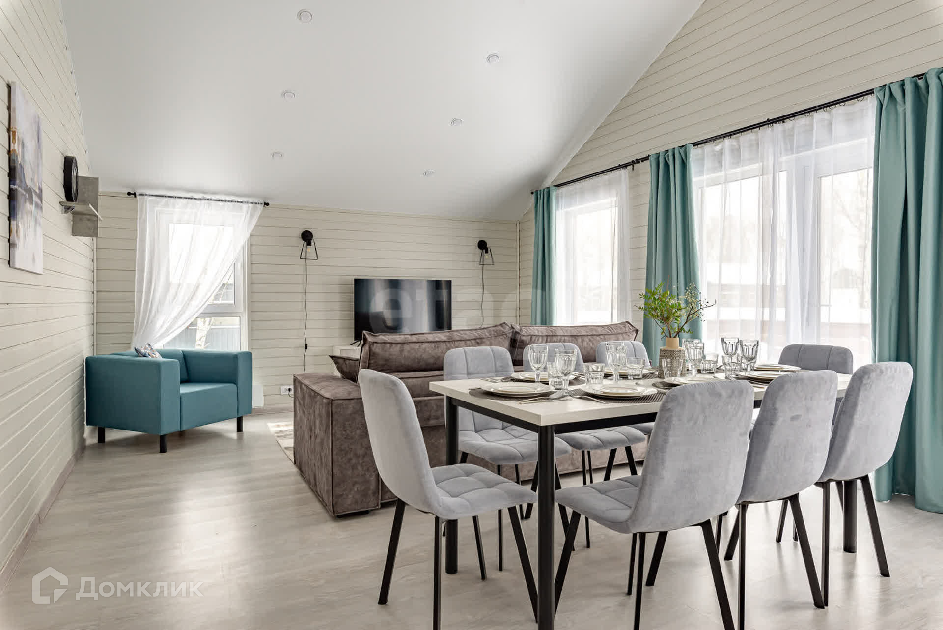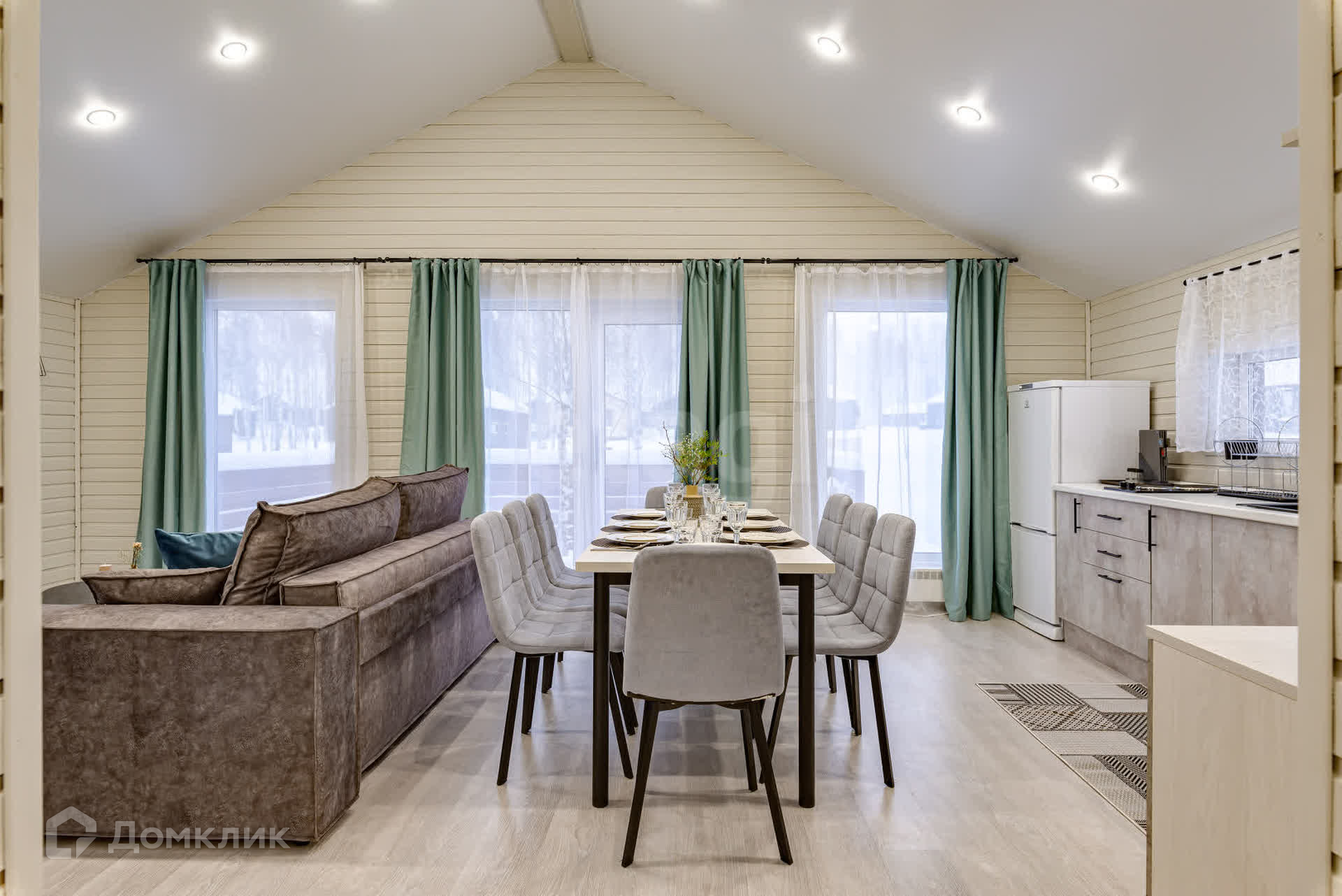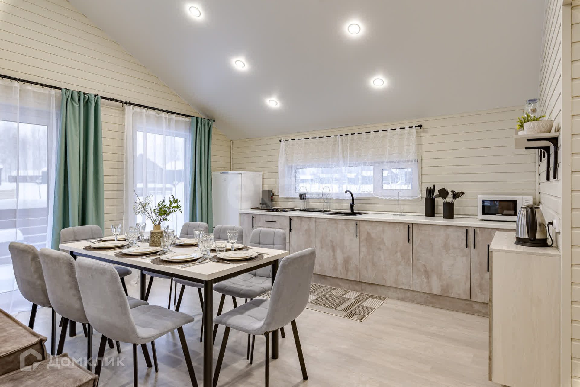 В этом доме можно устраивать встречи с друзьями и не переживать за детский сон - спальни находятся в отдалении от просторной кухни-гостиной. Общая зона светлая - окна выходят на 3 стороны, а пейзаж за окном приятен глазу.