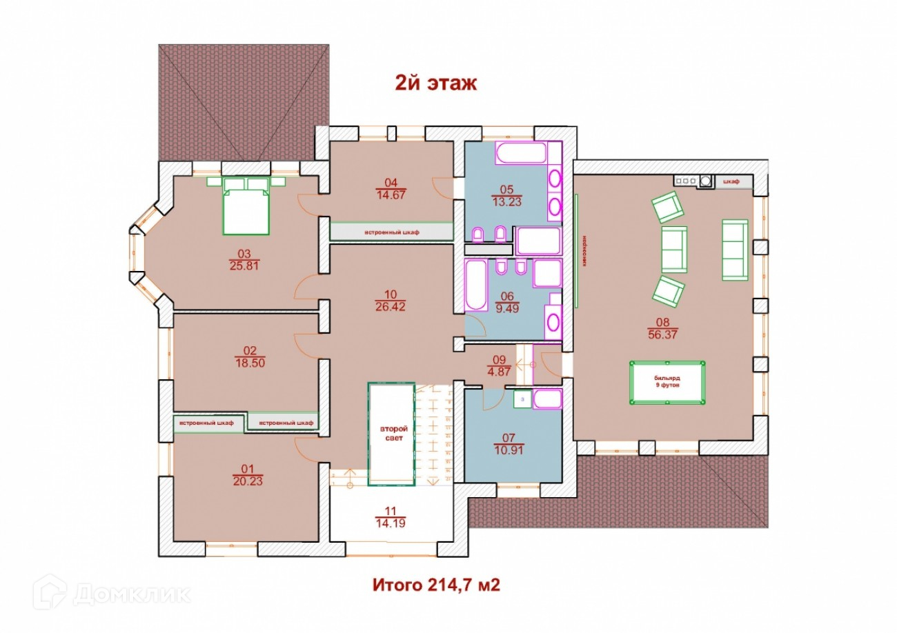 2 этаж: мастер-спальня с просторной гардеробной и с/у, 2 спальни, с/у, бильярдная/кинозал, постирочная.