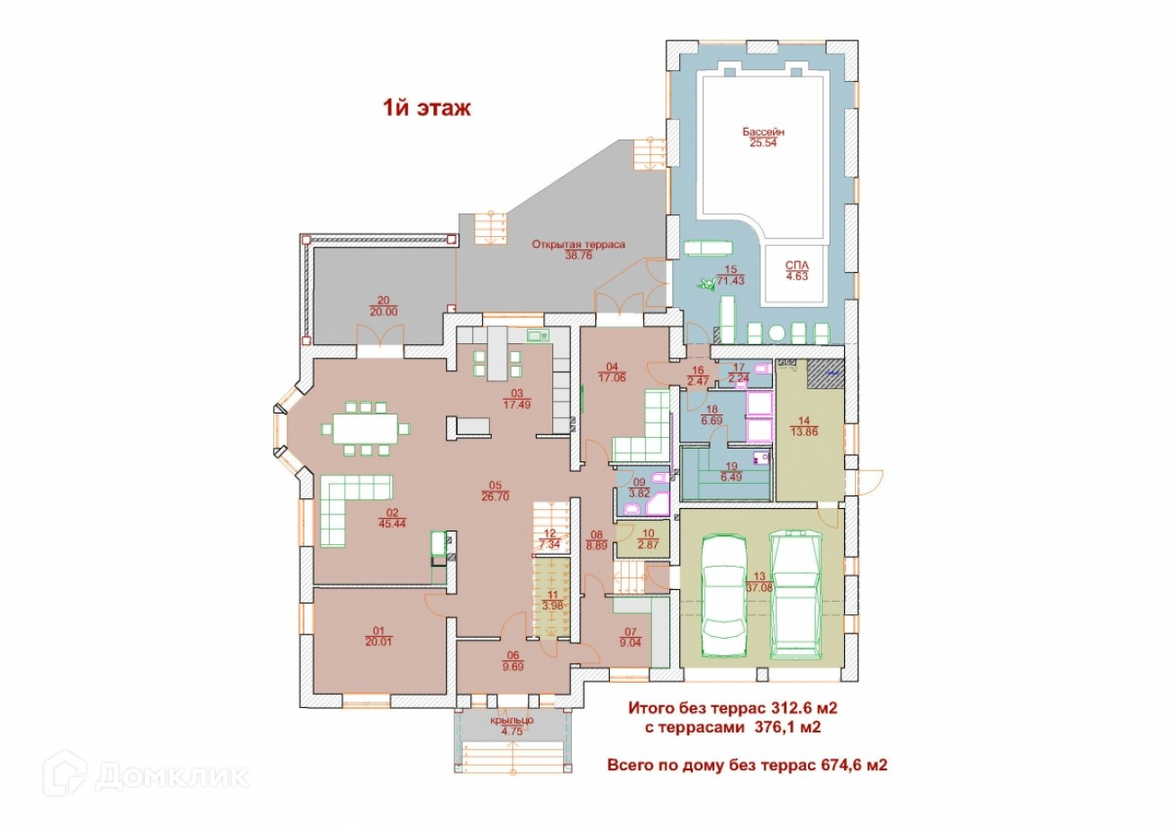 1 этаж: гардеробная, прихожая, холл, кухня, гостиная, комната отдыха, спальня, 2 с/у, СПА зона с бассейном, сауной, душевой, кладовые, гараж, бойлерная.