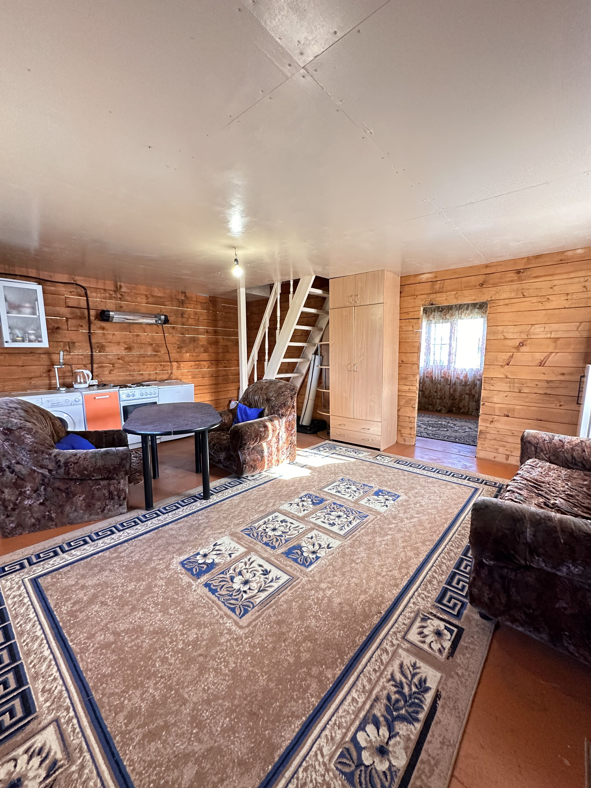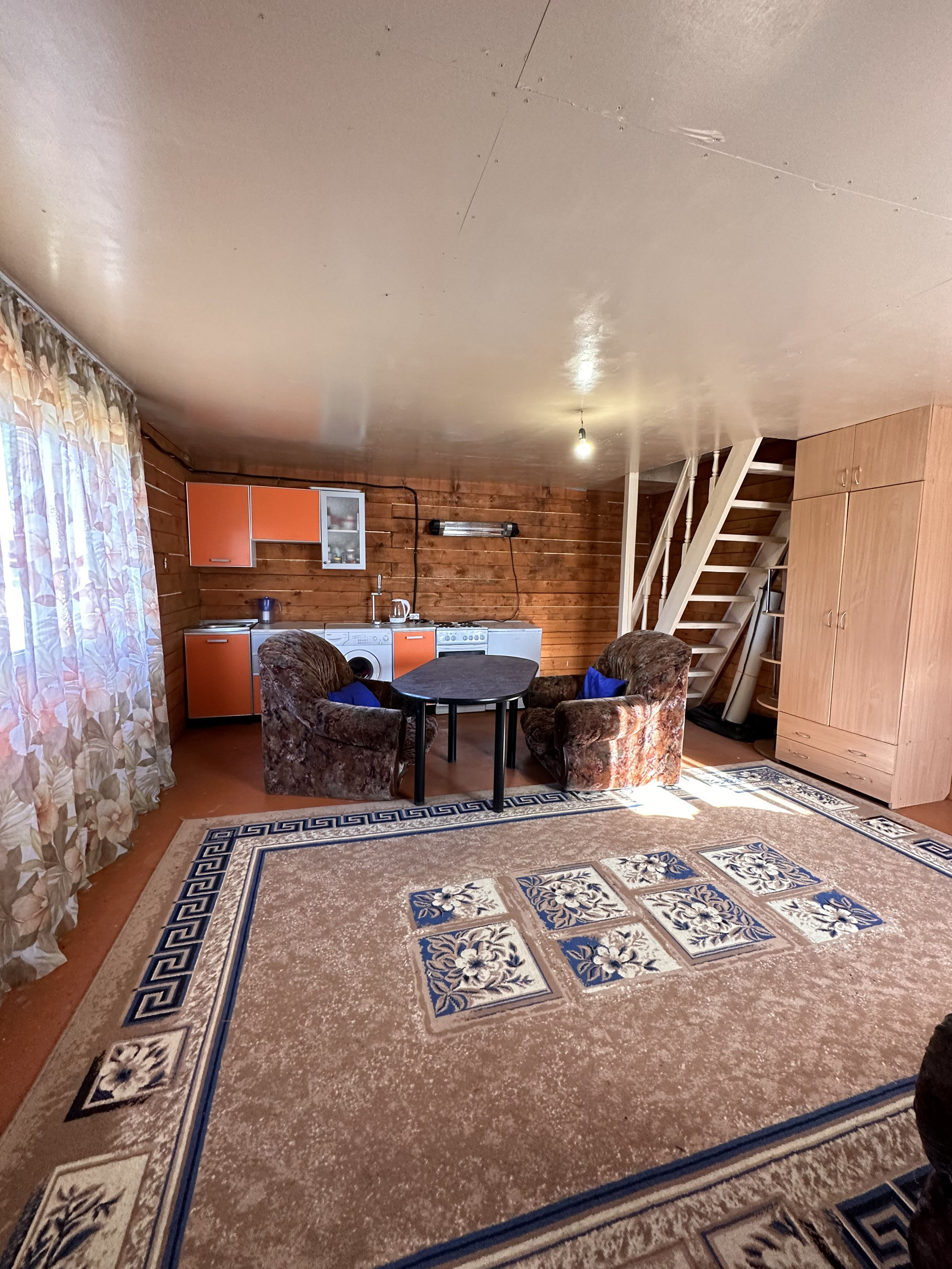 На первом этаже две комнаты: кухня-гостиная с двумя окнами и спальня