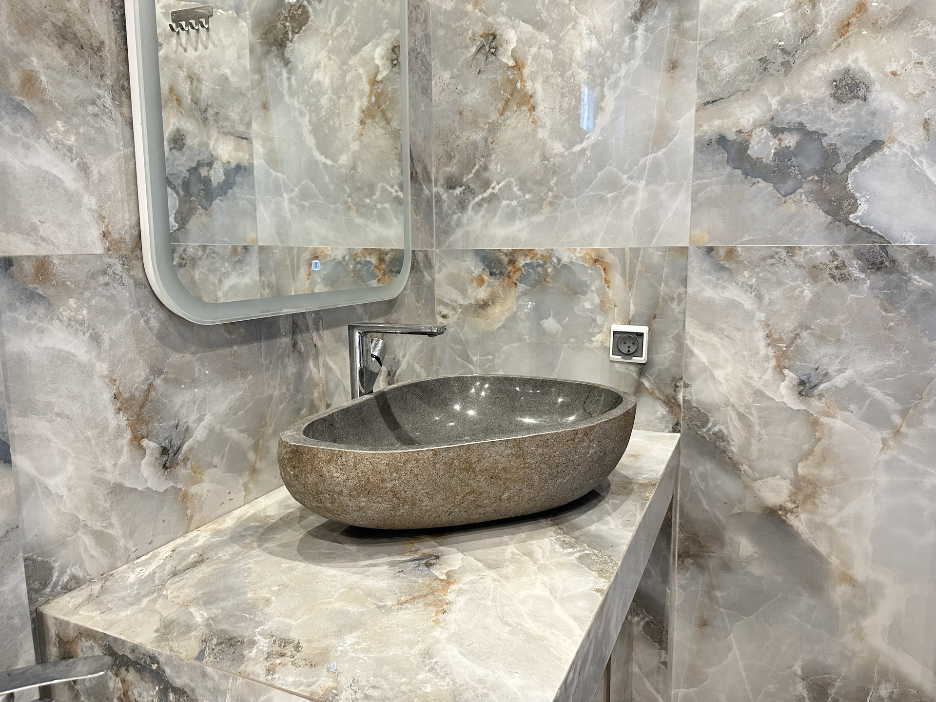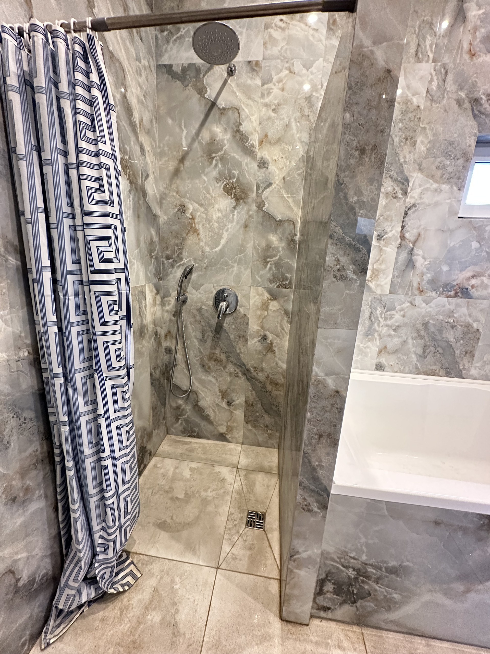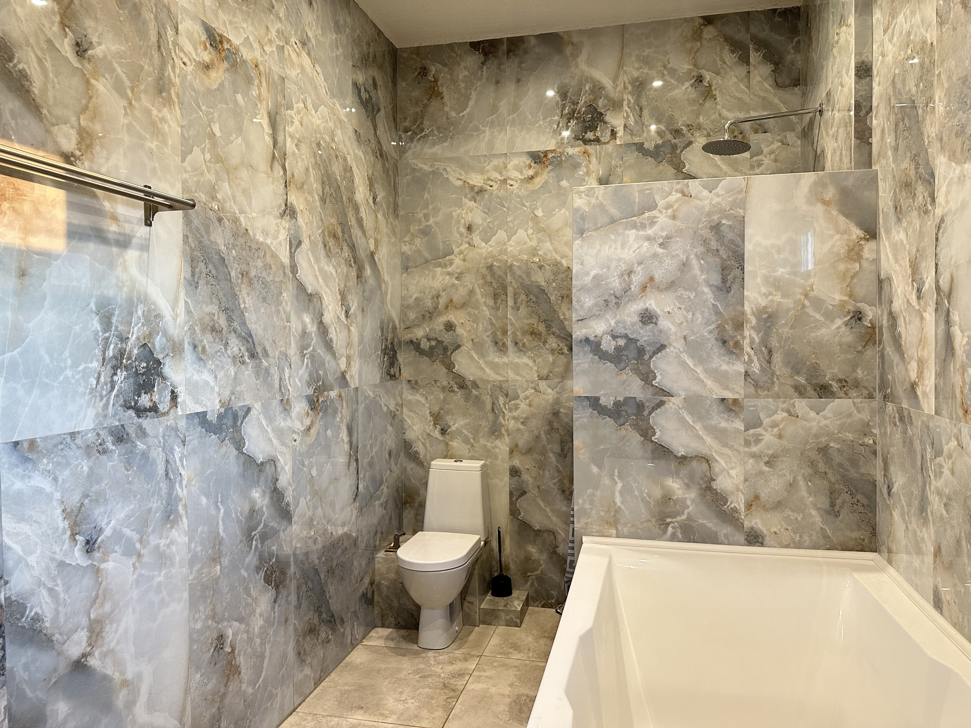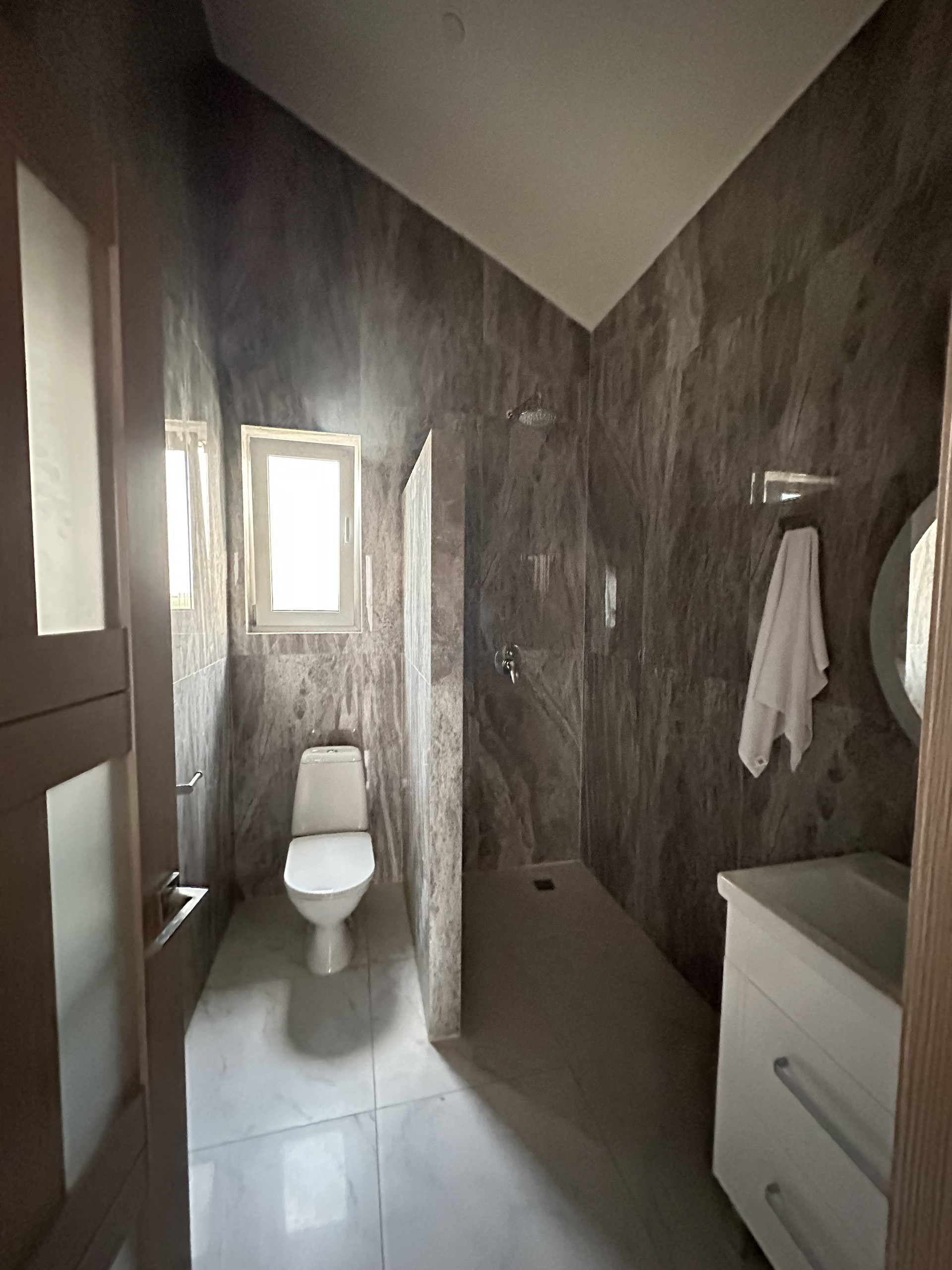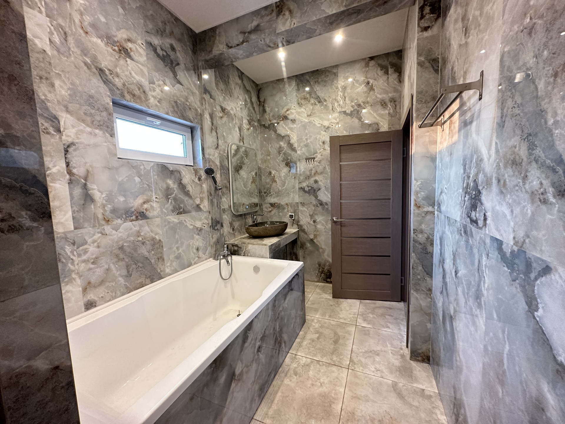 Роскошная ванная комната с душем и двухместной ванной восхищает своим элегантным дизайном, а мраморная раковина добавляет шарма и изыска. Кроме того, на первом этаже вы найдете отдельное помещение с котельной и просторную прихожую со вместительным шкафом-купе для хранения вашей одежды и обуви.