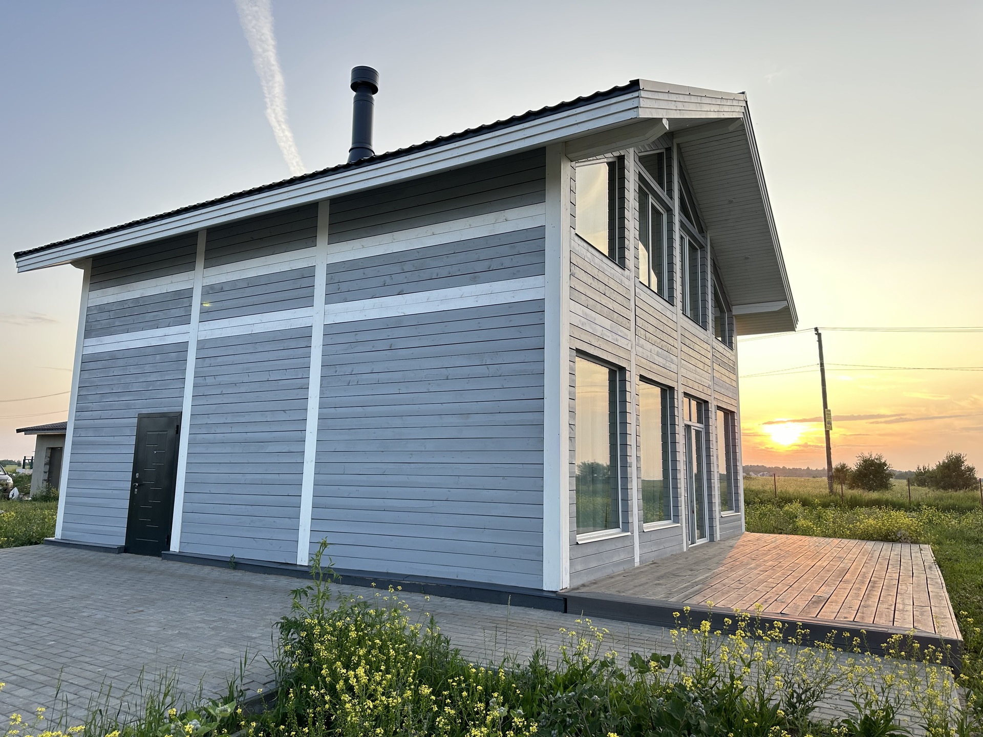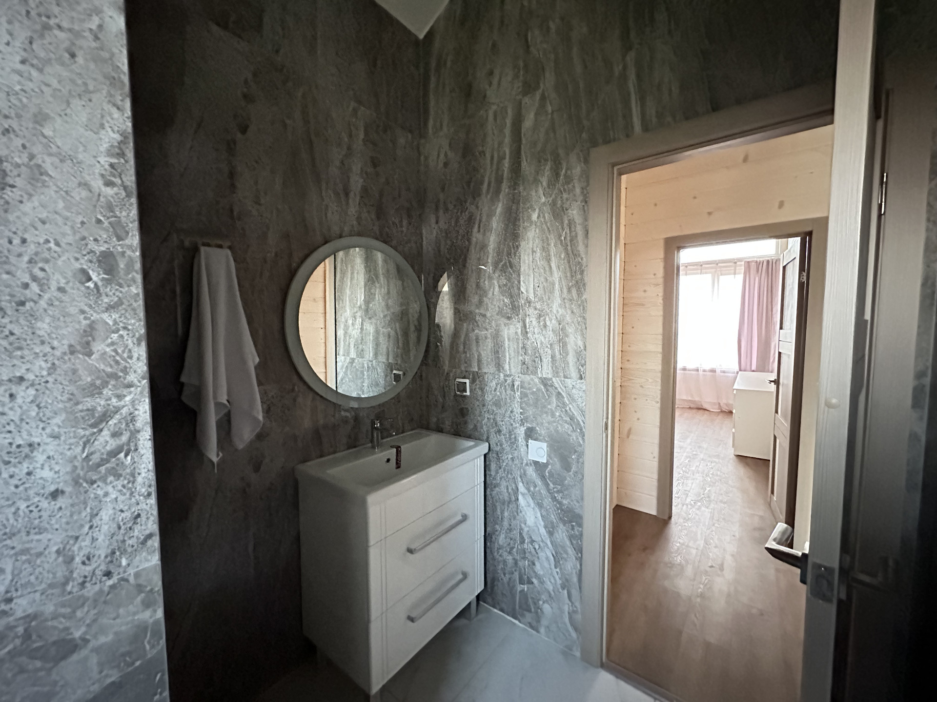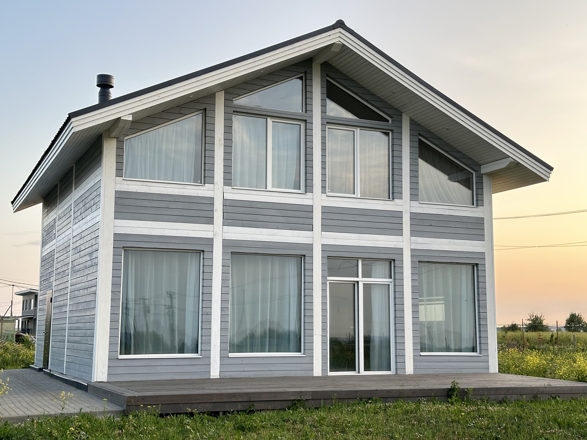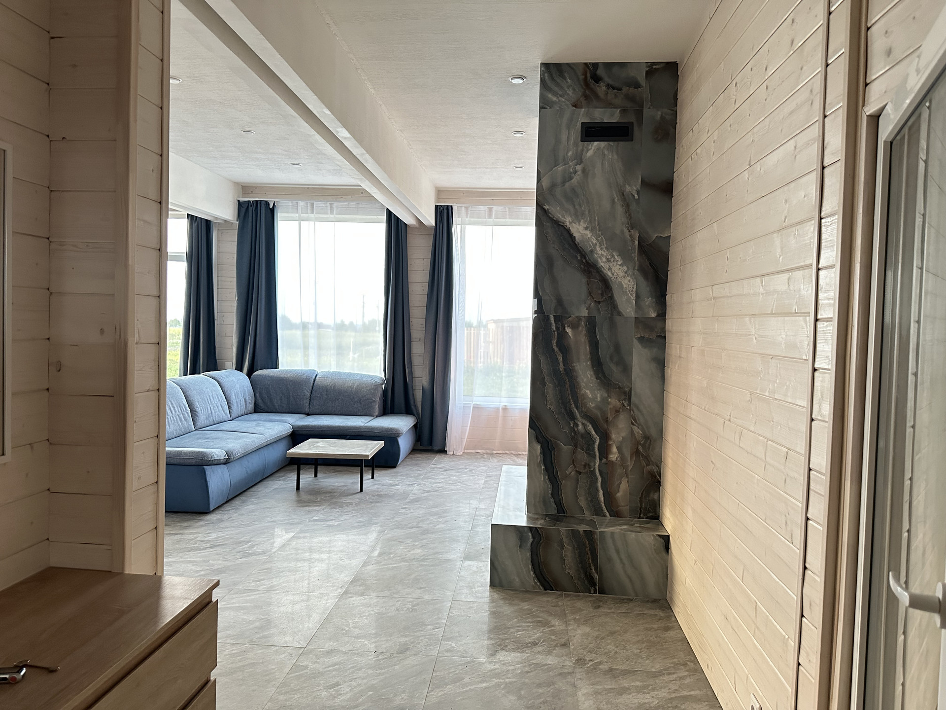 Дом выполнен из качественных материалов, создавая внешний вид имитации бруса, покрытого финским воском. Ванные комнаты оформлены с использованием крупноформатного керамогранита высокого качества, полы на первом этаже керамогранитом, а на втором этаже – кварцевым ламинатом, подчеркивающим элегантность интерьера.