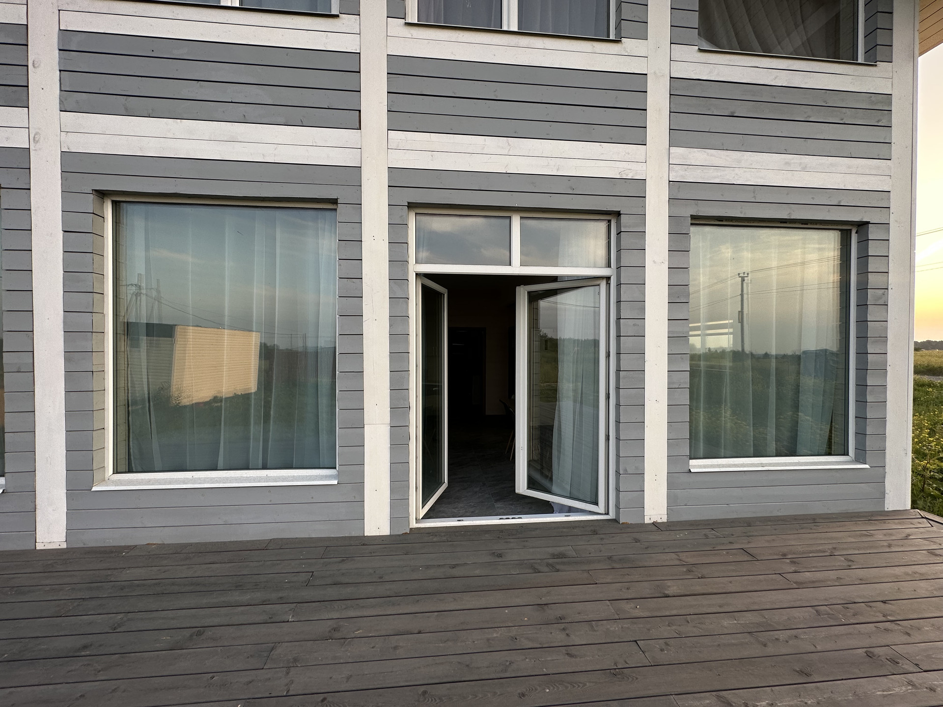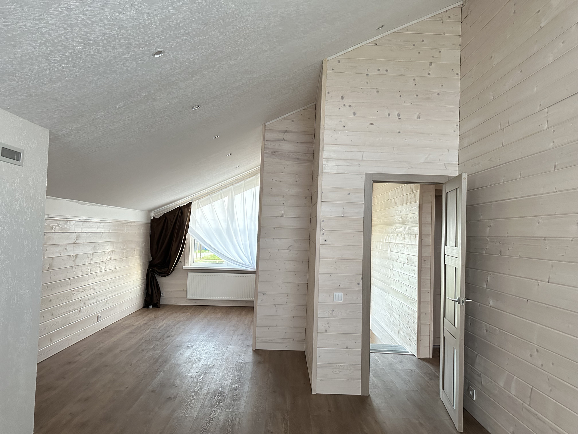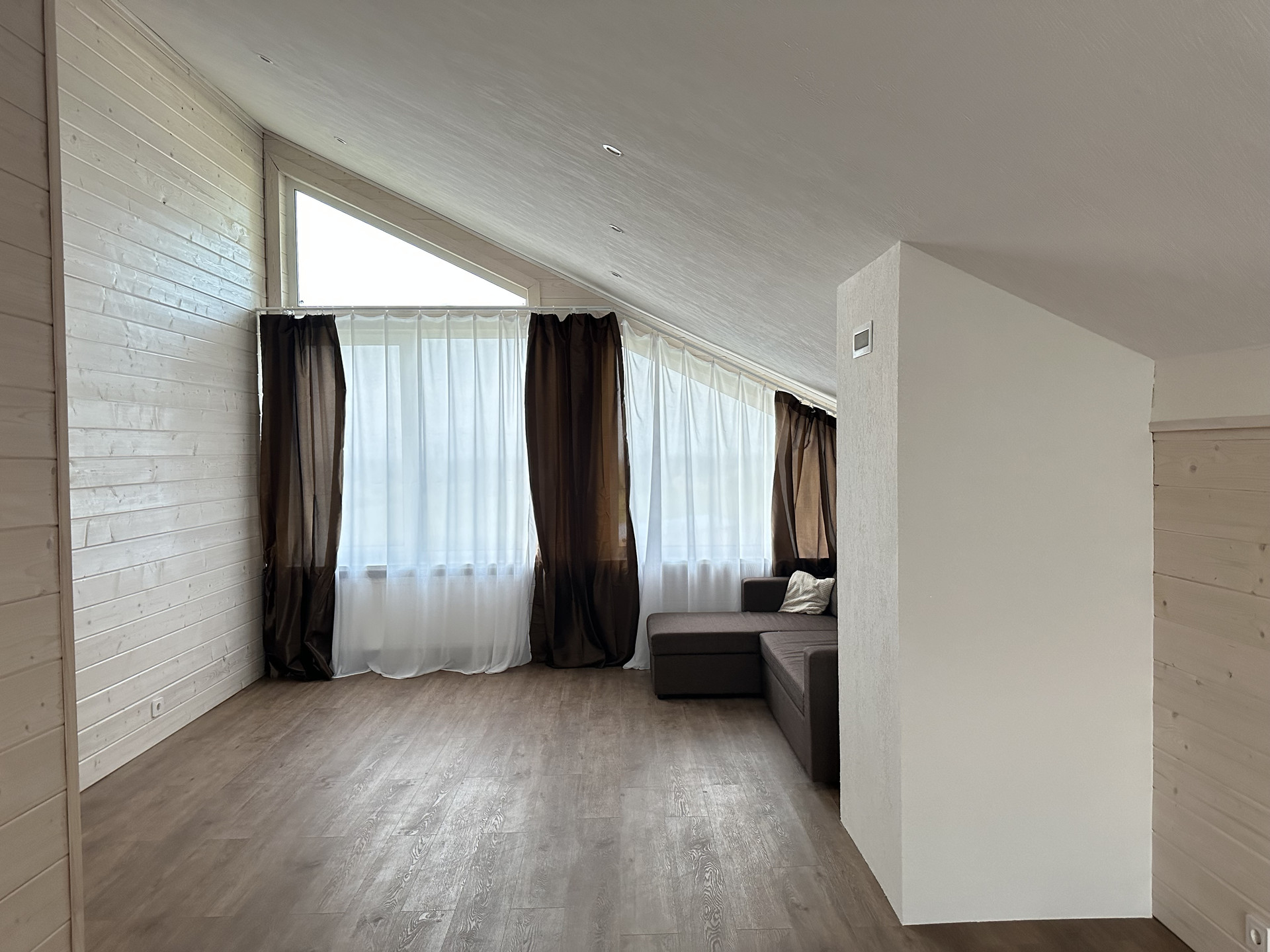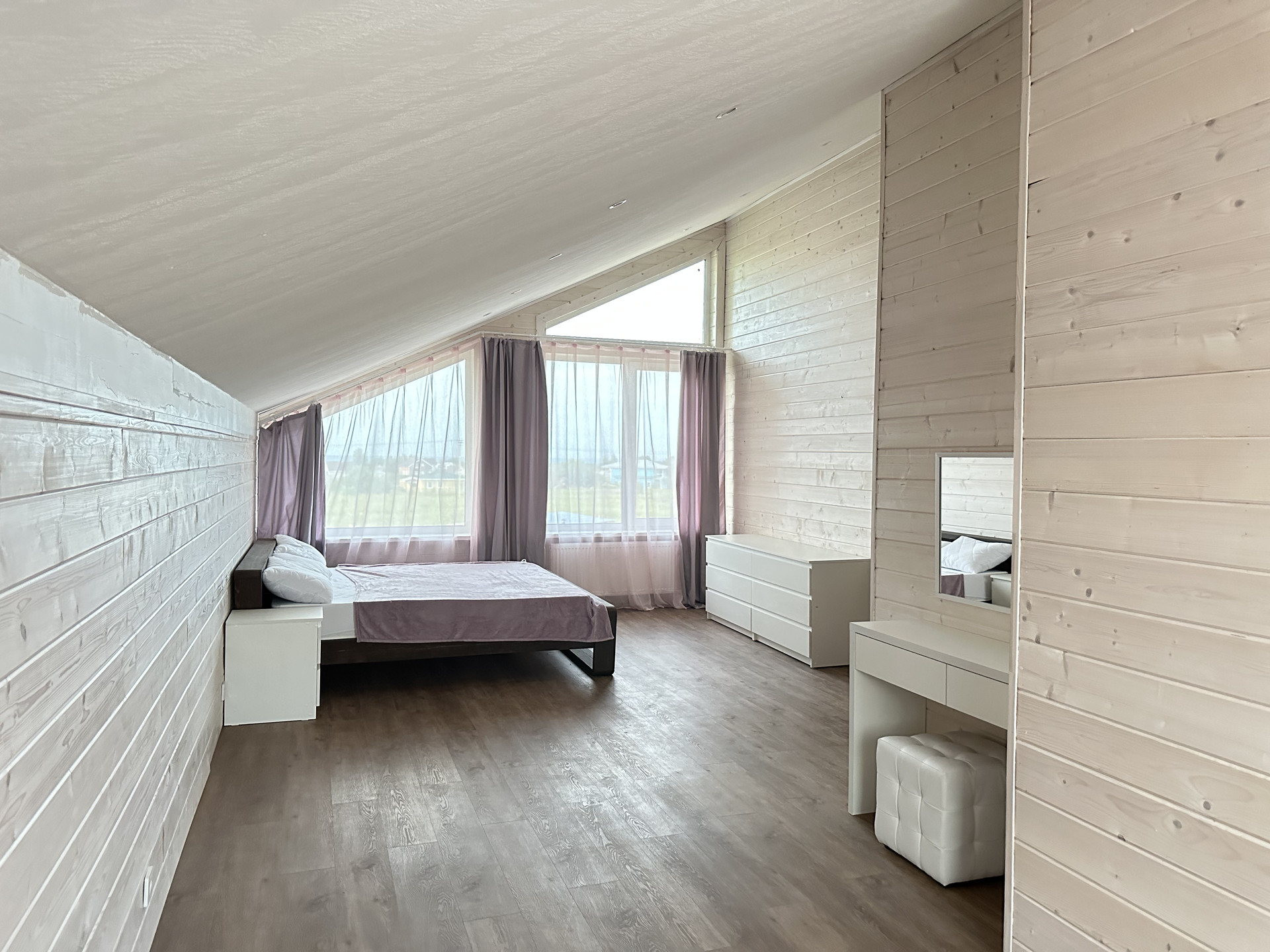 Дом выполнен из качественных материалов, создавая внешний вид имитации бруса, покрытого финским воском. Ванные комнаты оформлены с использованием крупноформатного керамогранита высокого качества, полы на первом этаже керамогранитом, а на втором этаже – кварцевым ламинатом, подчеркивающим элегантность интерьера.