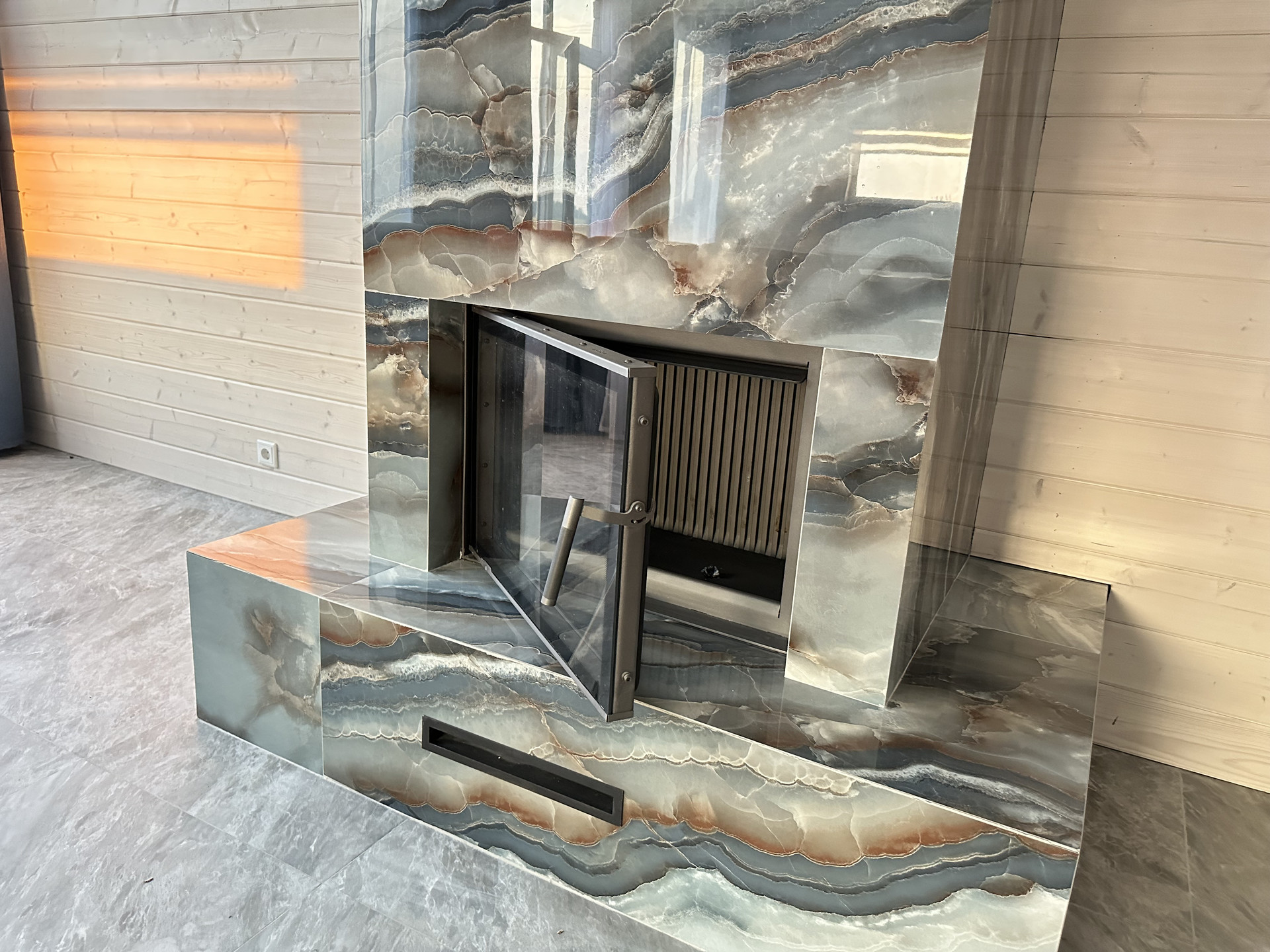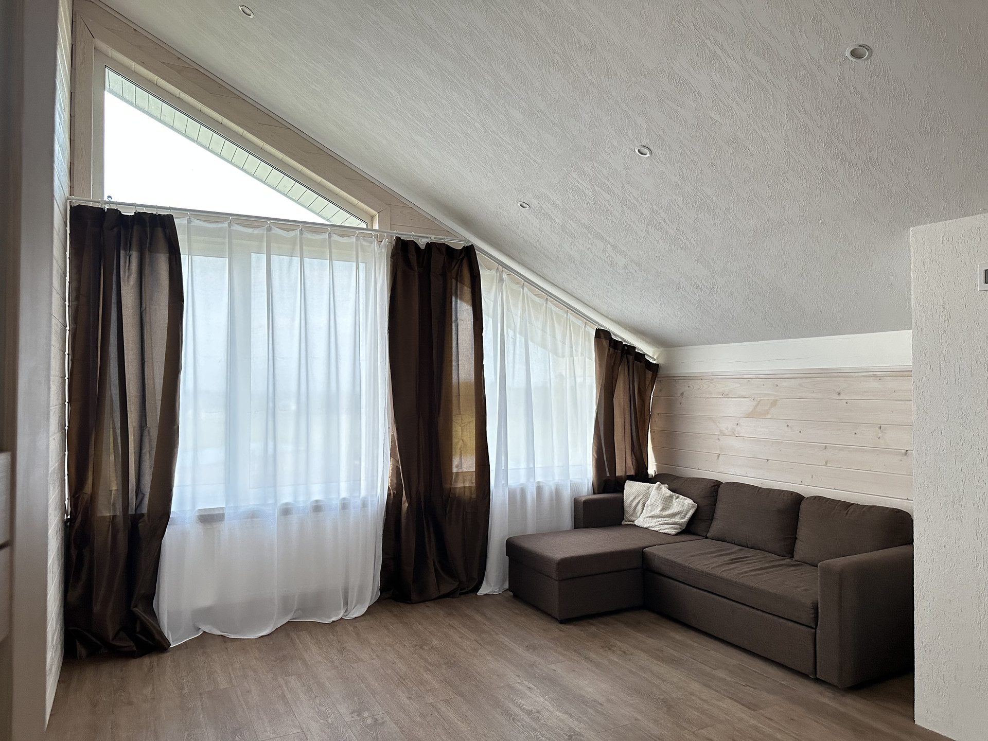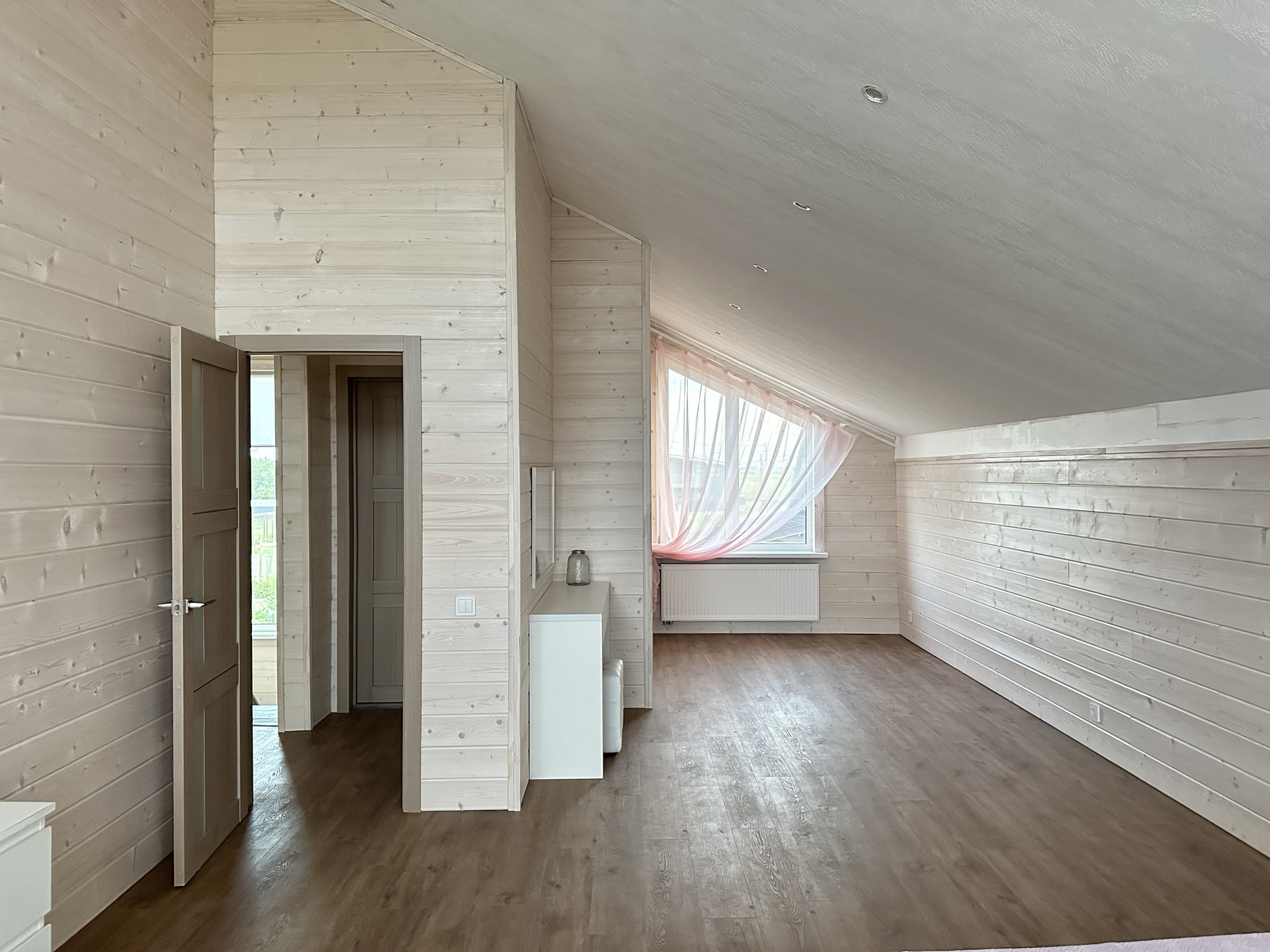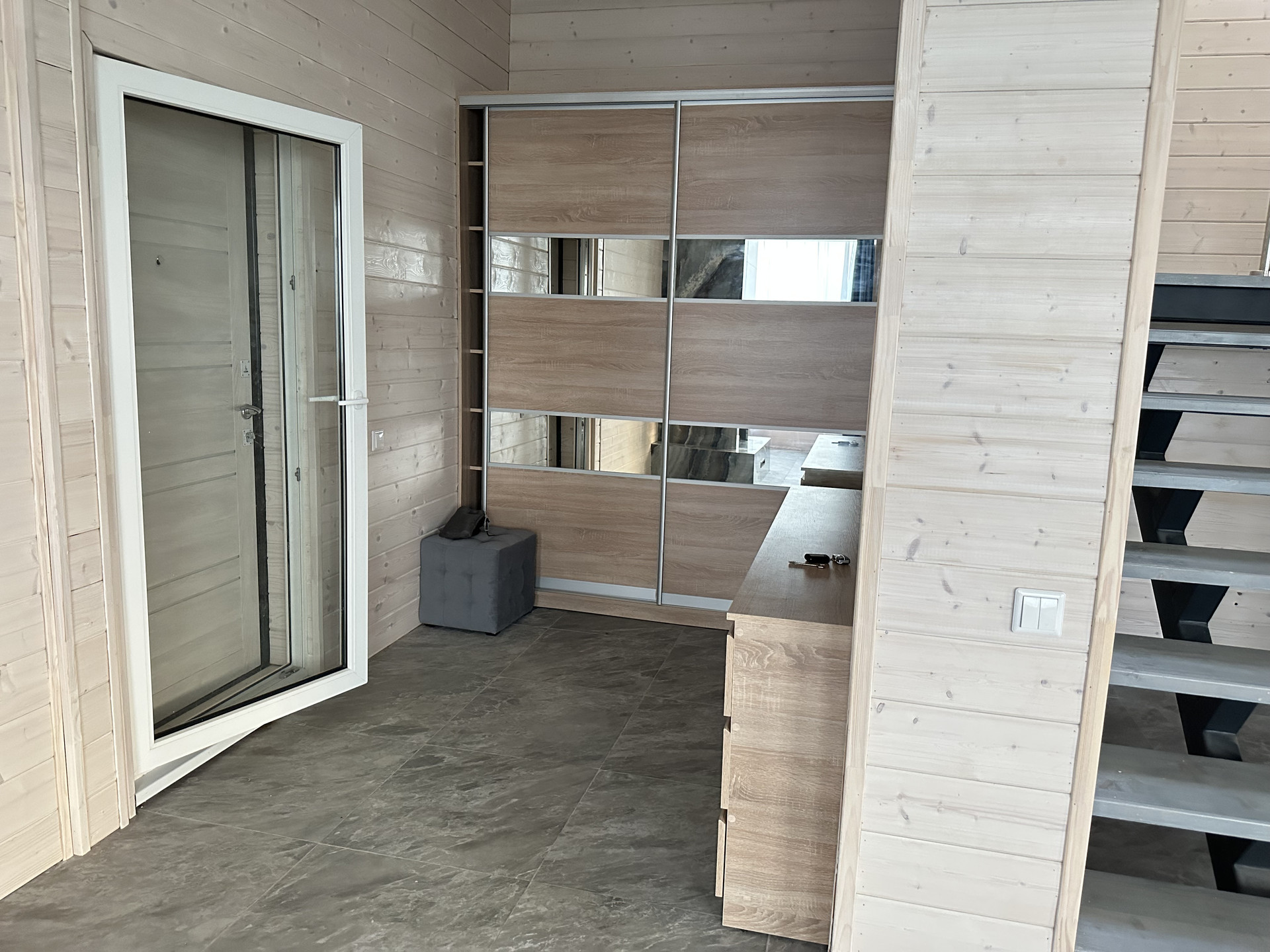 Дом выполнен из качественных материалов, создавая внешний вид имитации бруса, покрытого финским воском. Ванные комнаты оформлены с использованием крупноформатного керамогранита высокого качества, полы на первом этаже керамогранитом, а на втором этаже – кварцевым ламинатом, подчеркивающим элегантность интерьера.