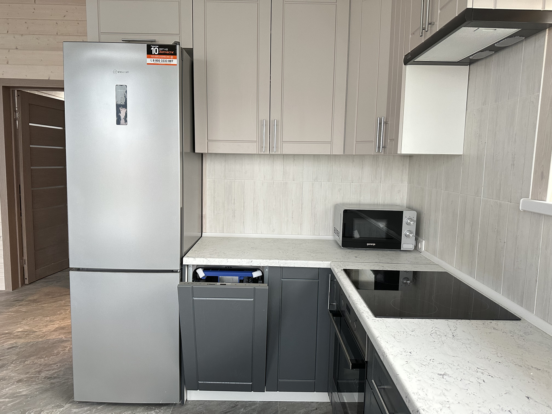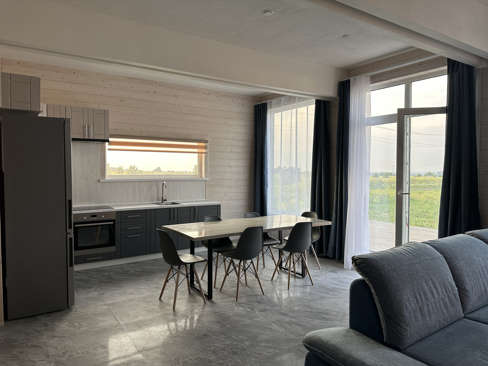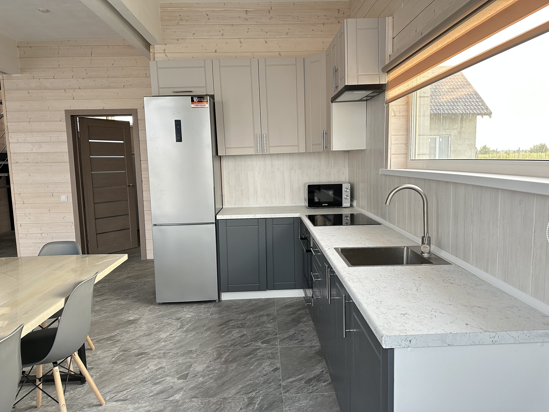 Кухня, укомплектованная встроенной мебелью и современной бытовой техникой (варочная панель, духовой шкаф, посудомоечная машина, СВЧ), будет радовать вас каждый день. А окно, расположенное вдоль кухни, открывает великолепный вид на будущий сад, чтобы вы могли наслаждаться красотой природы прямо из вашего дома.
