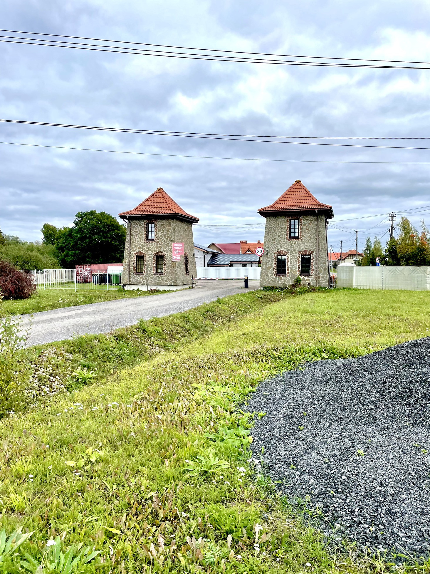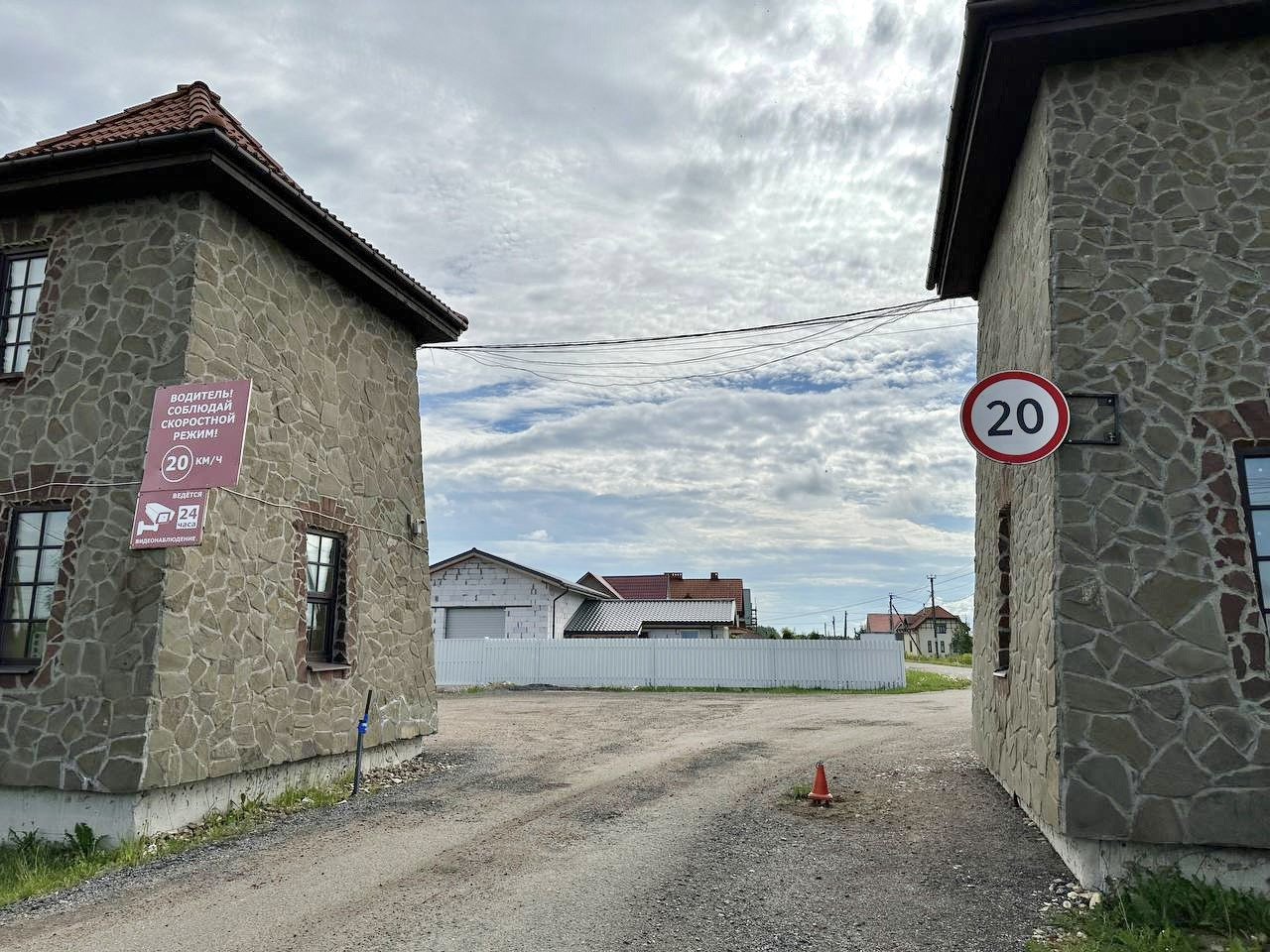 - поселок по периметру огорожен забором , въезд через шлагбаум.