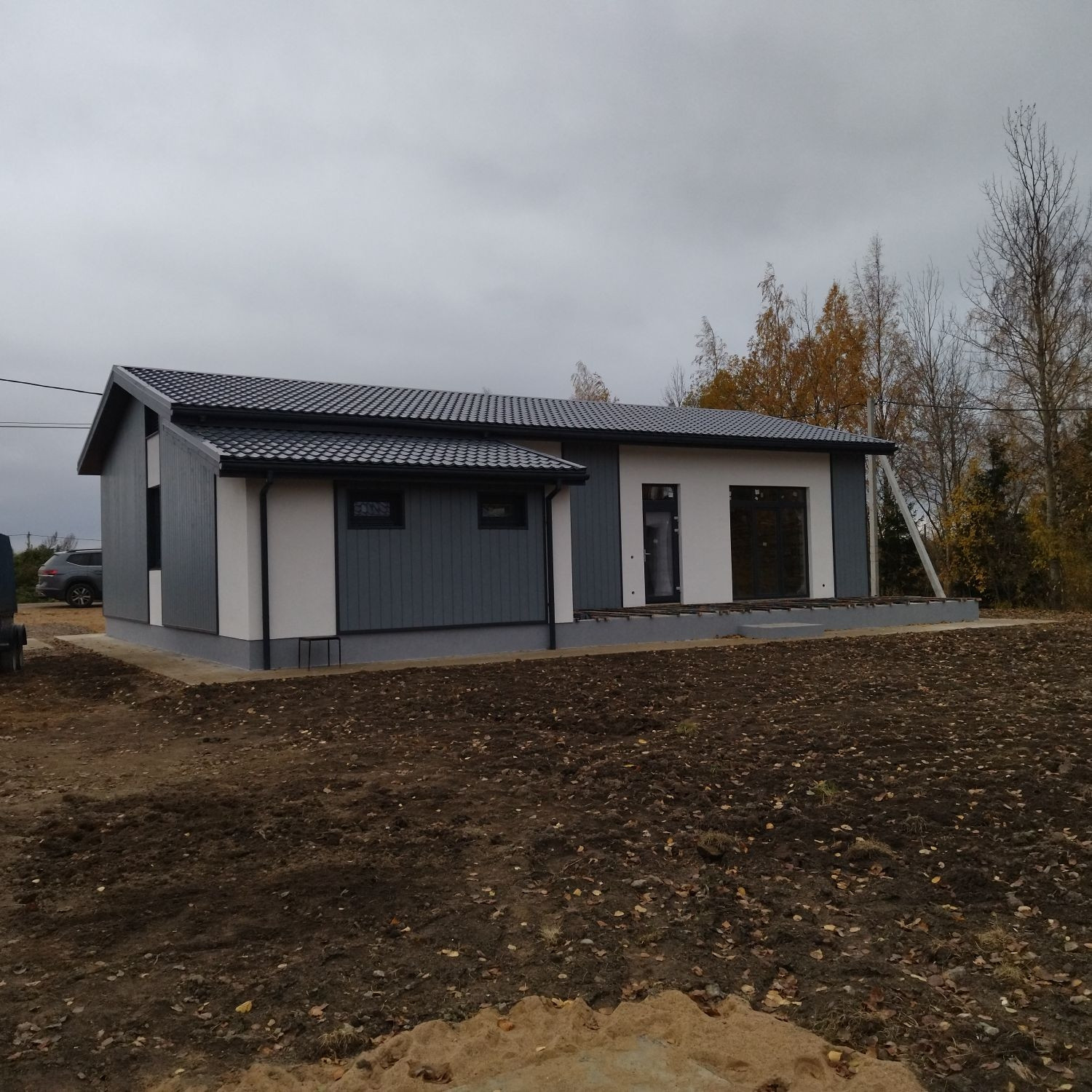 Участок отсыпан и спланирован относительно дороги. Выполнен дренаж. Подготовлена отмостка и место под парковку.