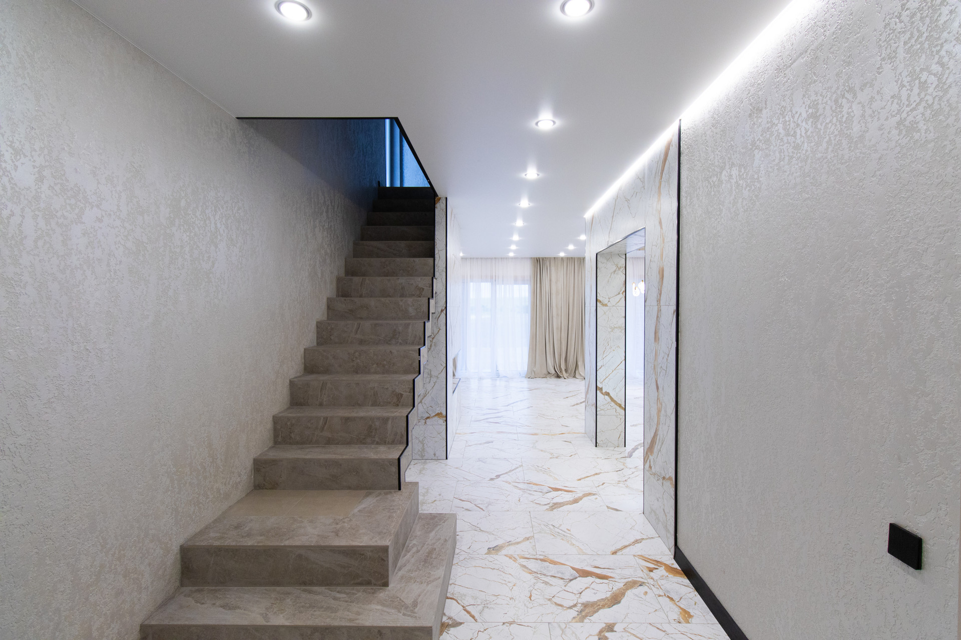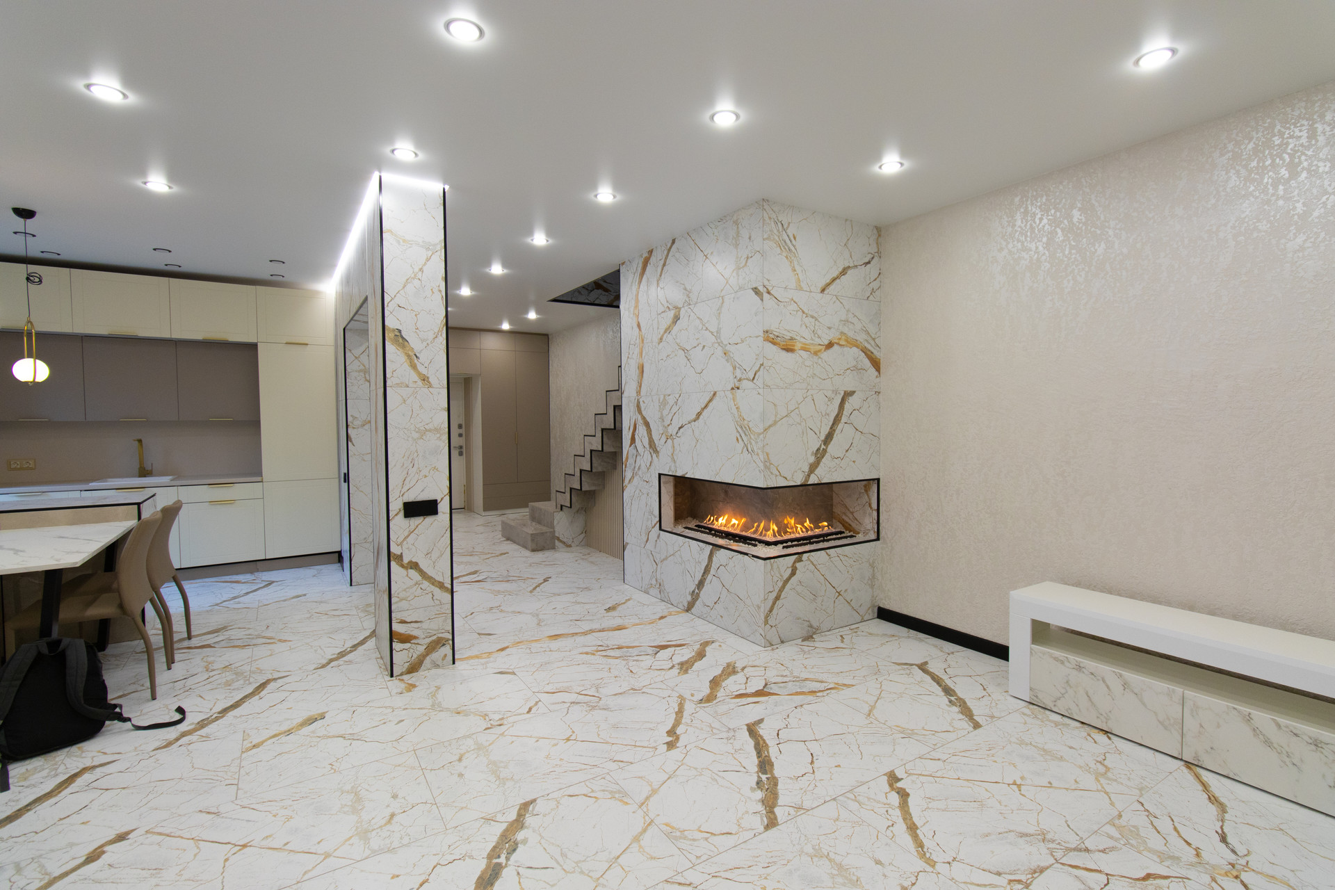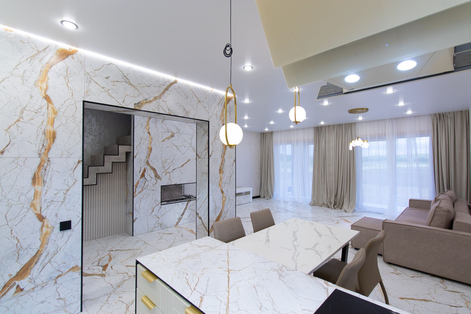 Первый этаж: кухня гостиная 55 м2 +пpиxожая +гocтeвoй санузeл/бoйлерная.