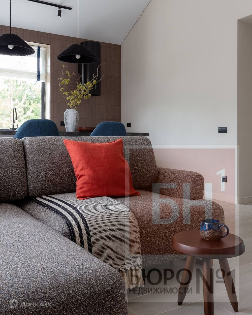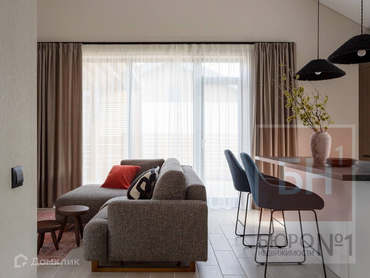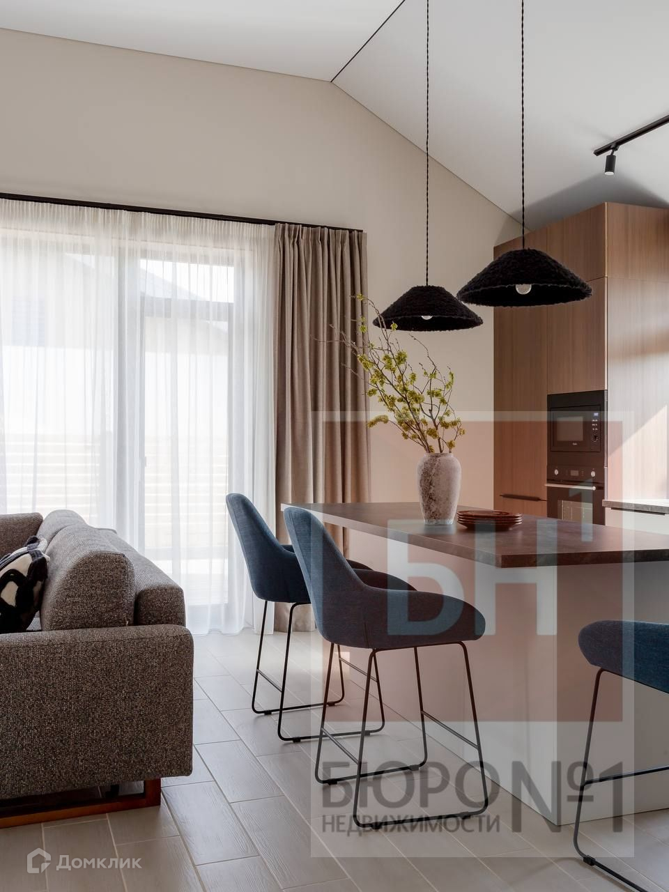 Светлая кухня-гостиная 35 кв м с панорамными окнами и выходом на террасу