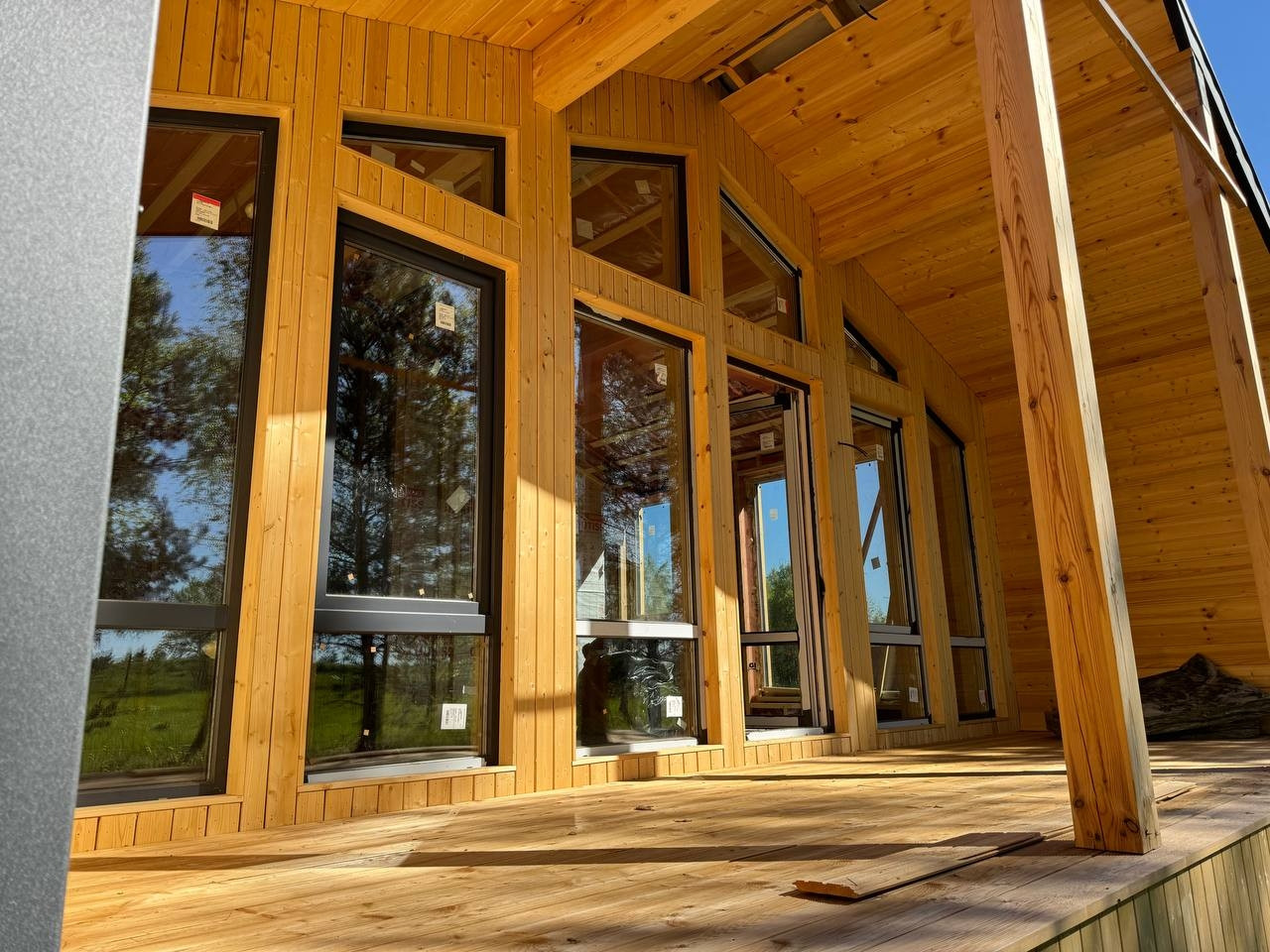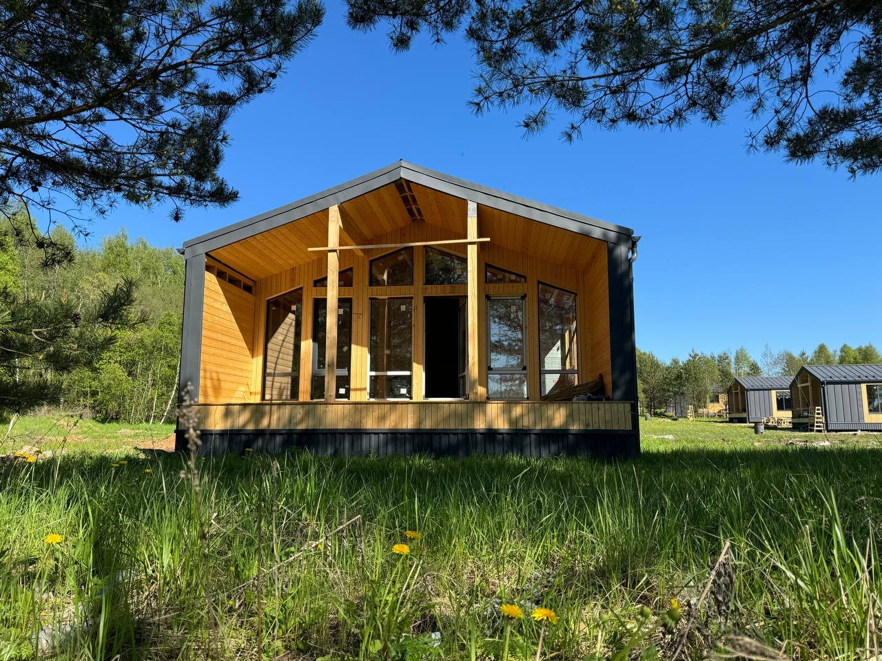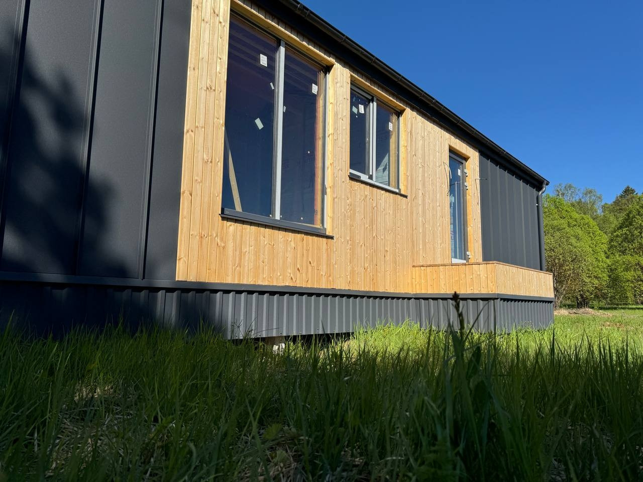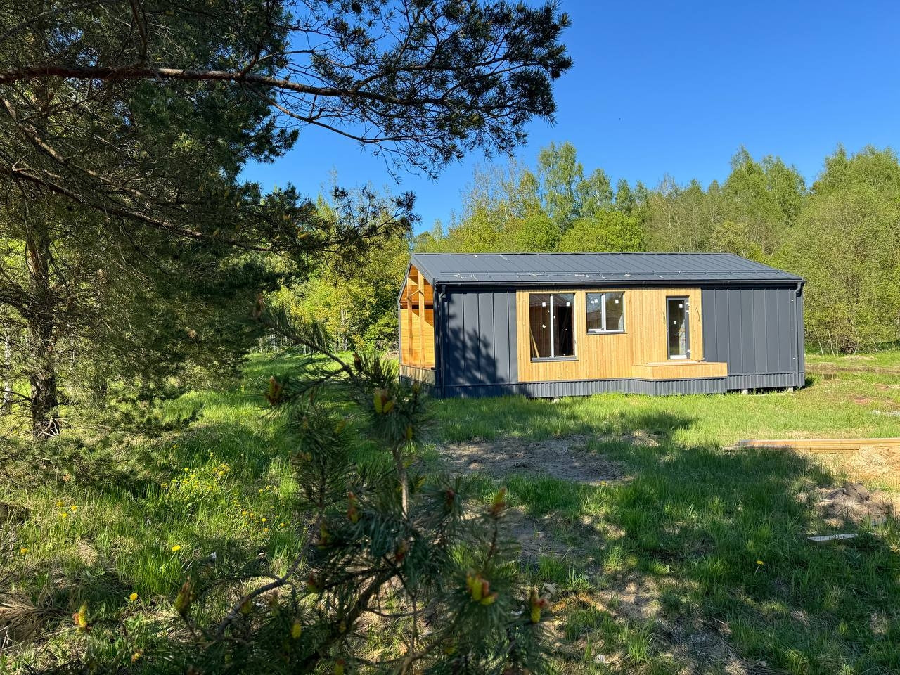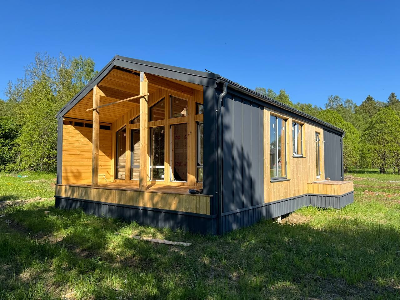 Фундамент из ЖБИ свай.  1 этаж. 2 большие спальни . Студия зона для кухни и гостиной. Панорамные окна для ЭКОНОМИИ энергии из двухкамерного стеклопакета. Теплые полы!