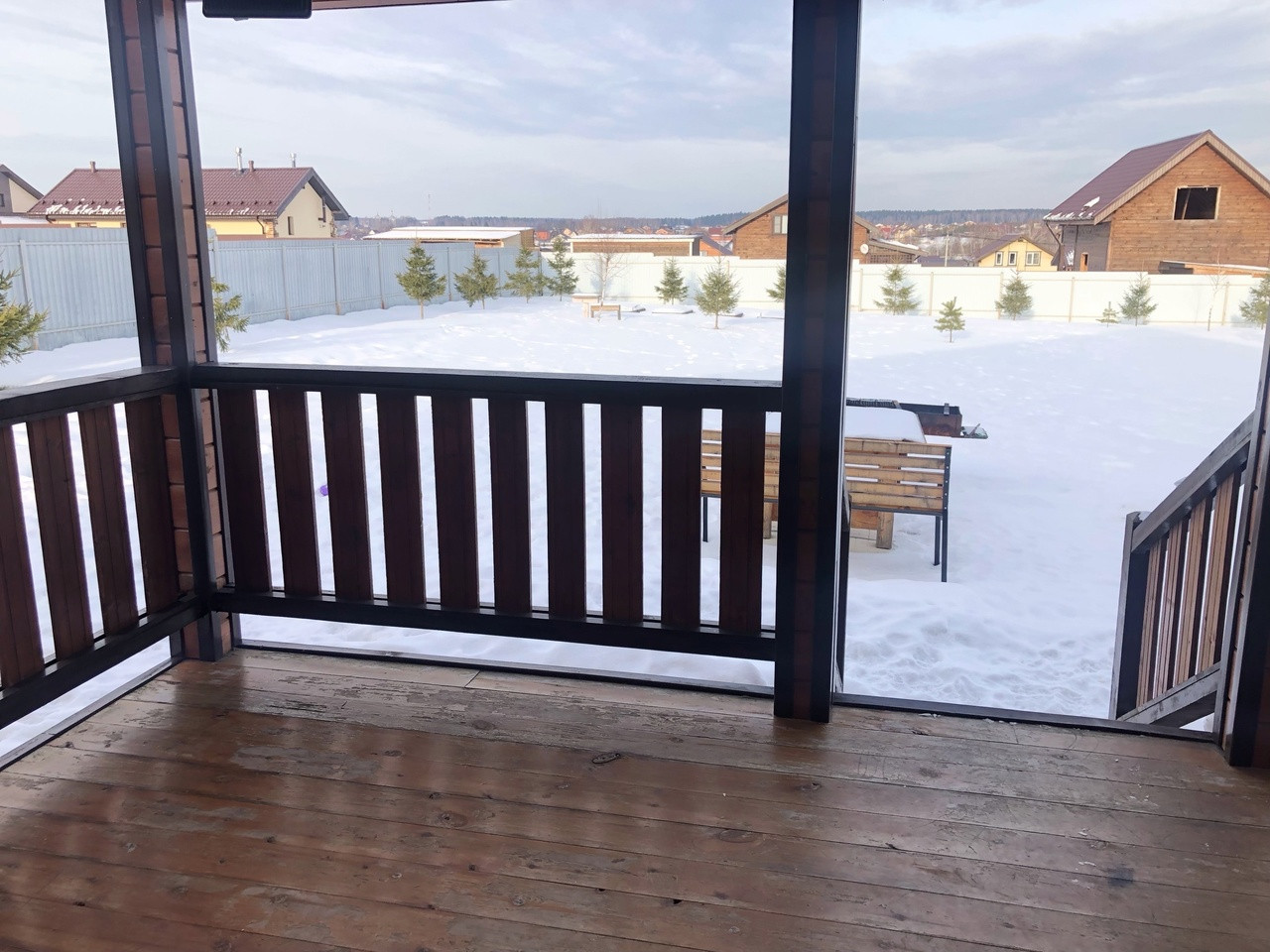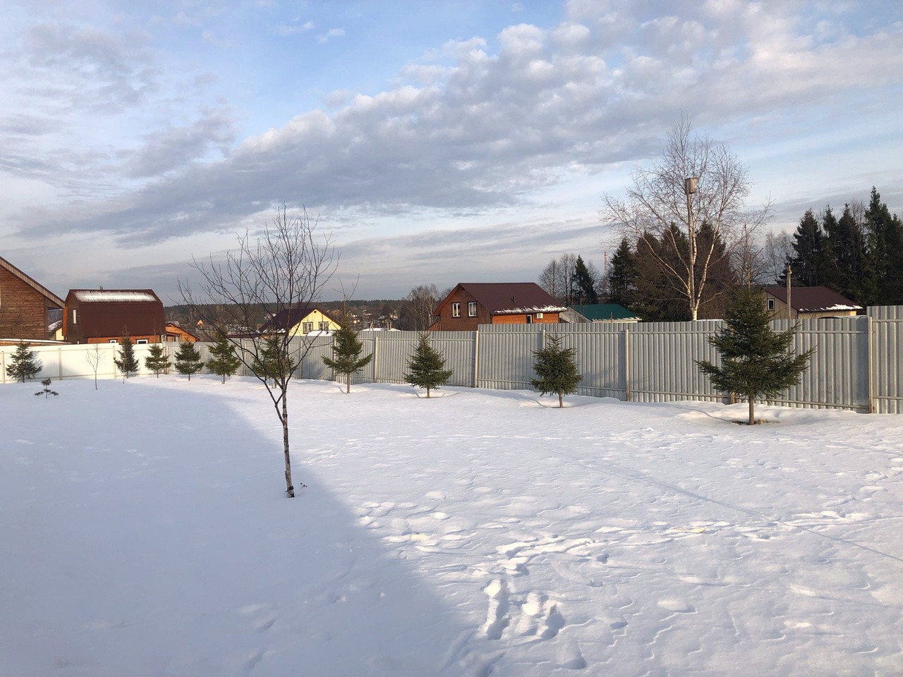Участок ровный, прямоугольной формы, по всему периметру огорожен забором, посажен газон и елочки , есть плодовые деревья. Вокруг дома выложена плитка