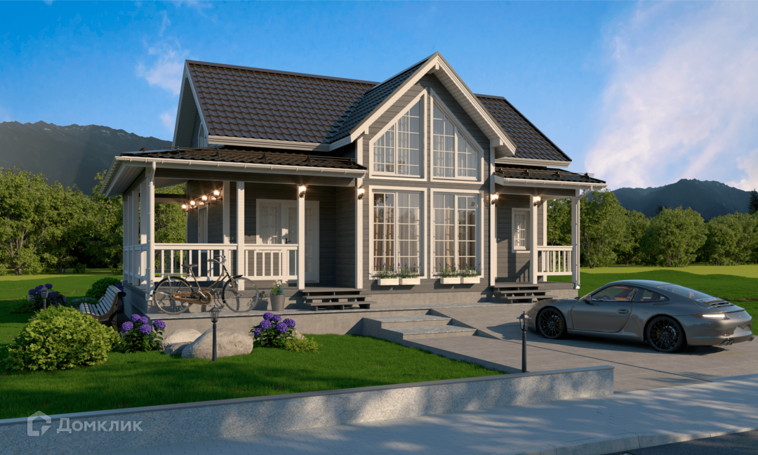 По-настоящему большой дом с угловой террасой — подойдет для нескольких поколений. В проекте — кухня, четыре отдельных спальни, два санузла и гостиная с большими окнами, откуда вы сможете любоваться окружающими пейзажами.