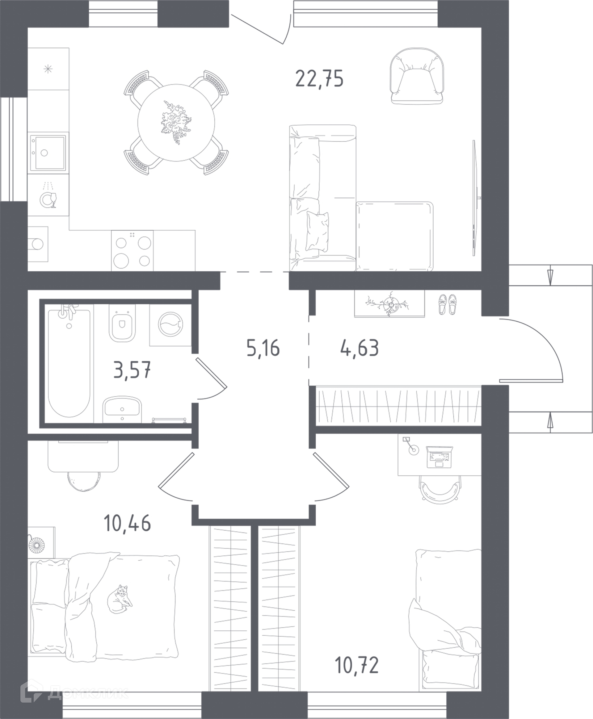 2 спальни (10,4 и 10,7 кв.м.),