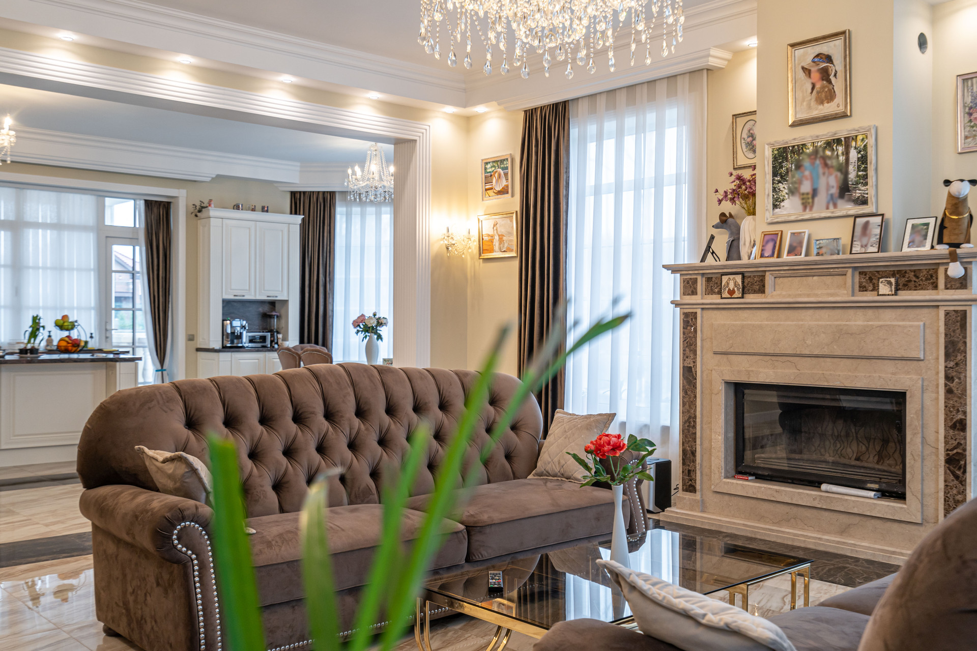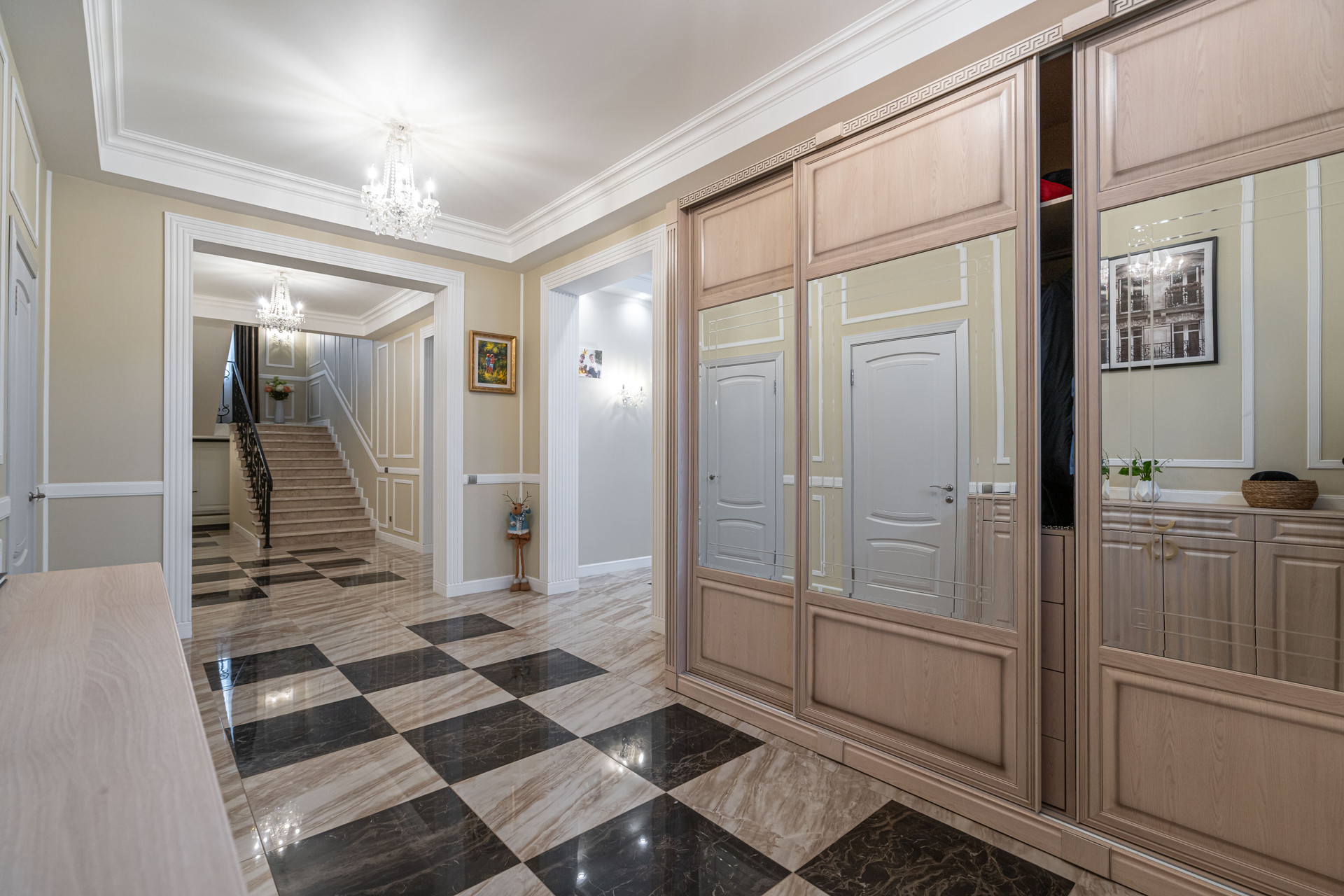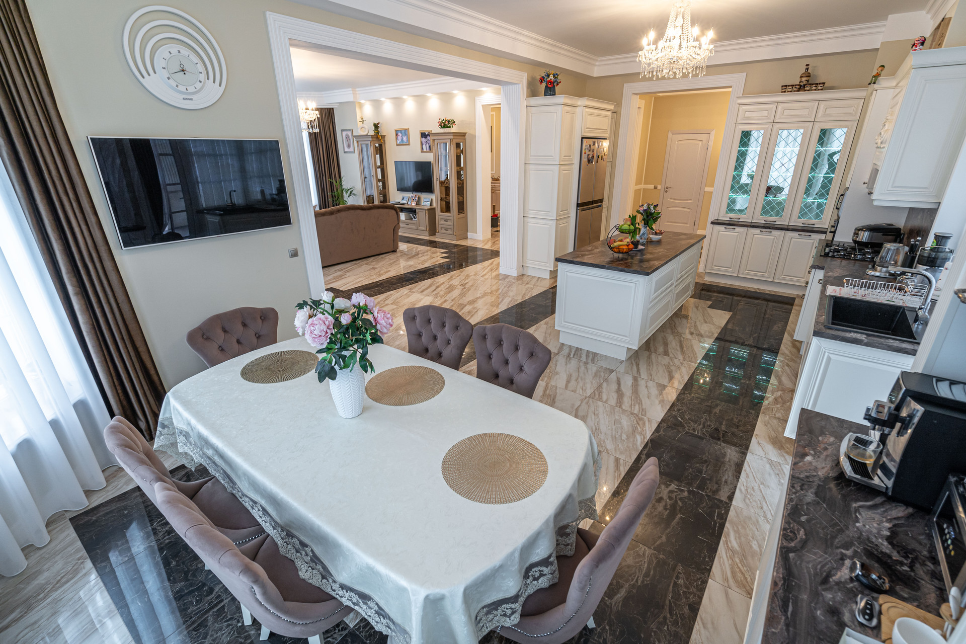 Площадь дома 592 кв м расположен на участке 1467 кв. м. Дом построен в стиле неоклассицизма.