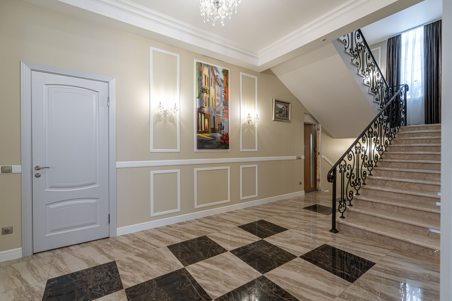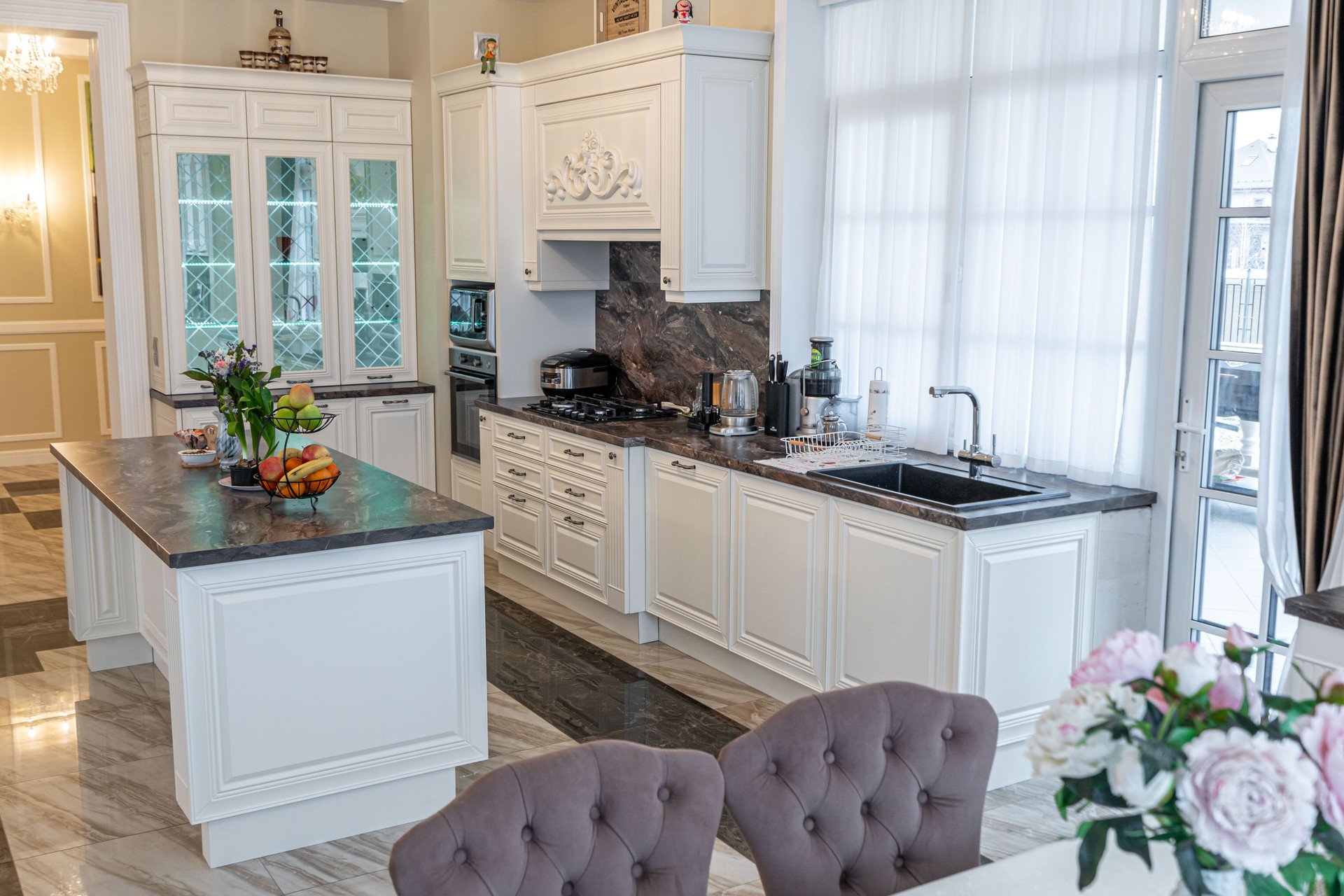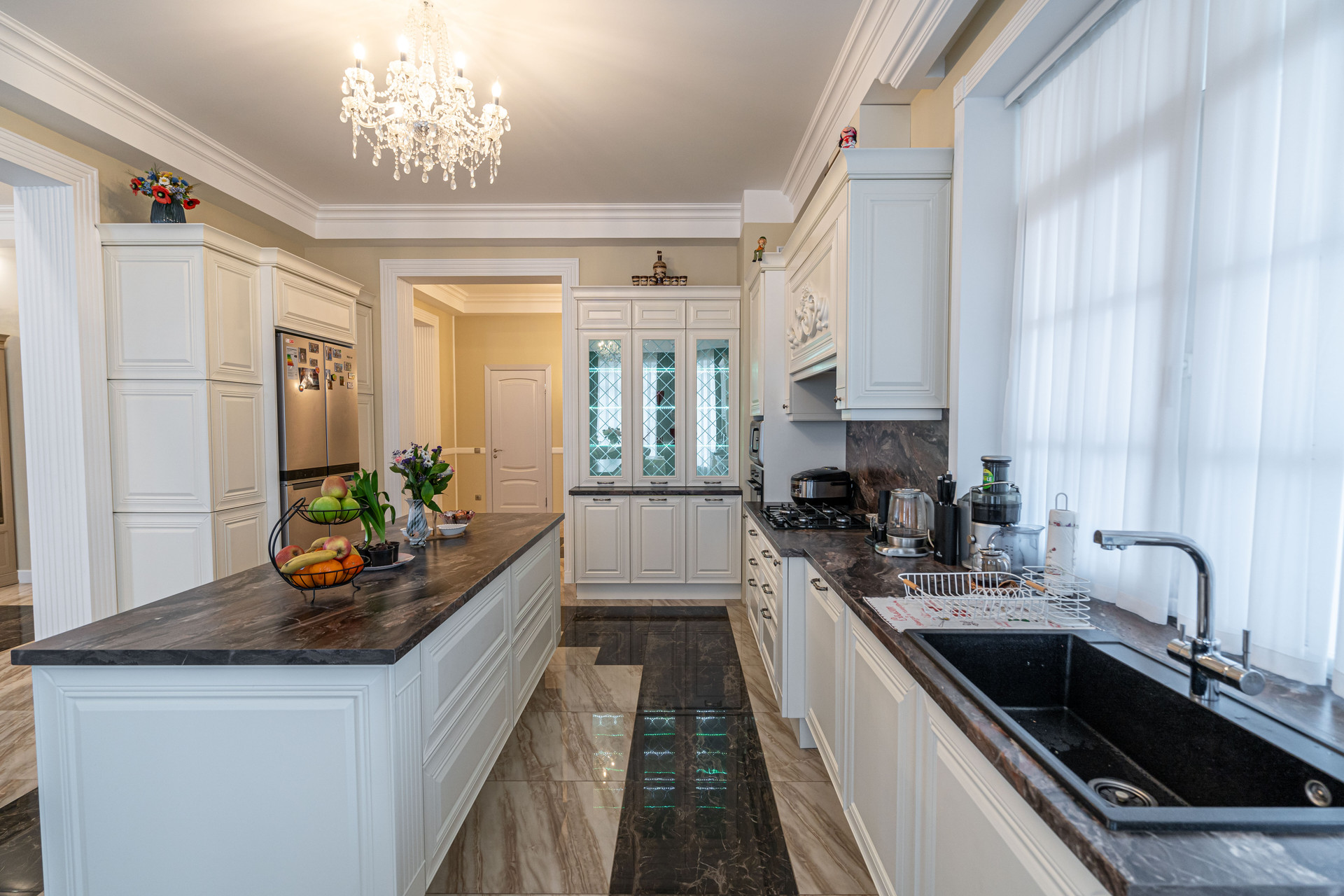 Площадь дома 592 кв м расположен на участке 1467 кв. м. Дом построен в стиле неоклассицизма.