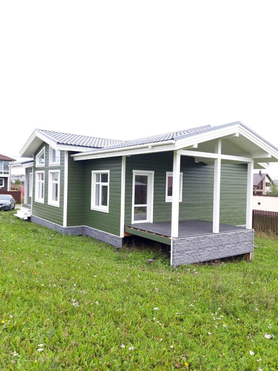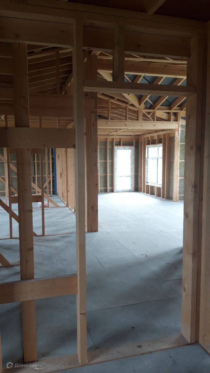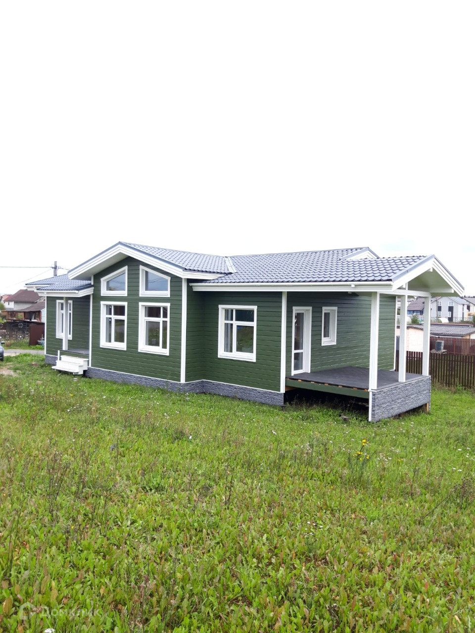 свайный фундамент, кровля металлическая черепица, панорамное остекление, двухкамерные стеклопакеты. Без внутренней отделки. Внешняя отделка - имитация бруса.