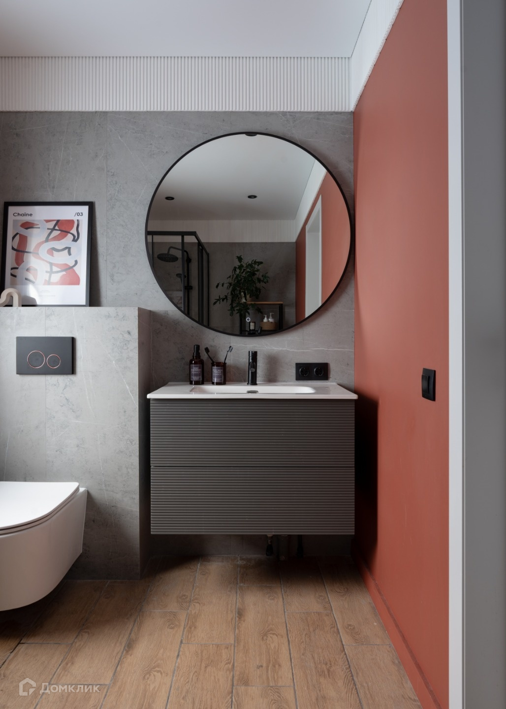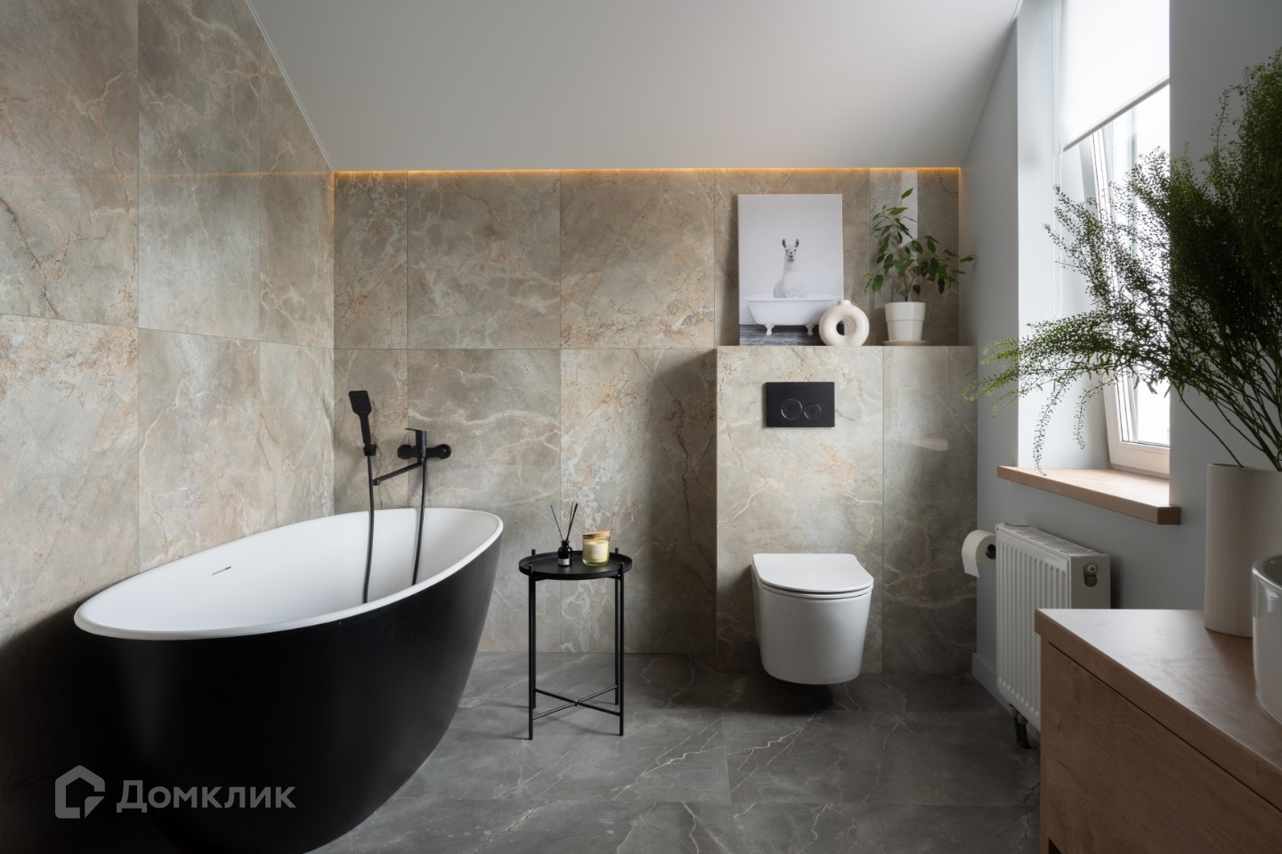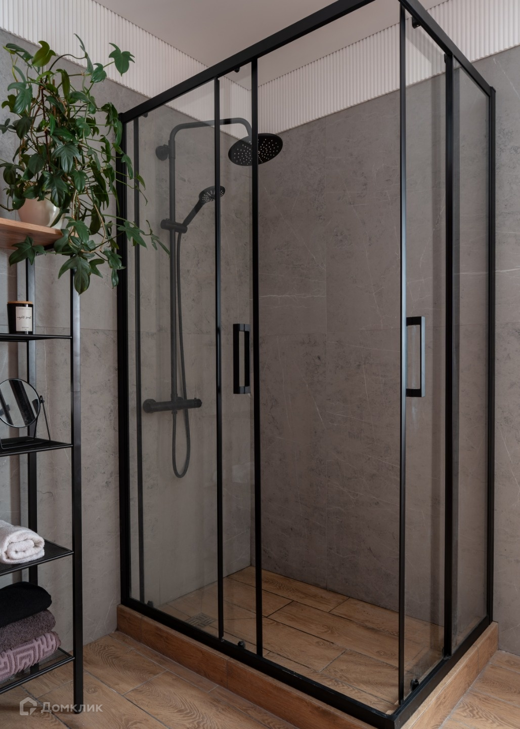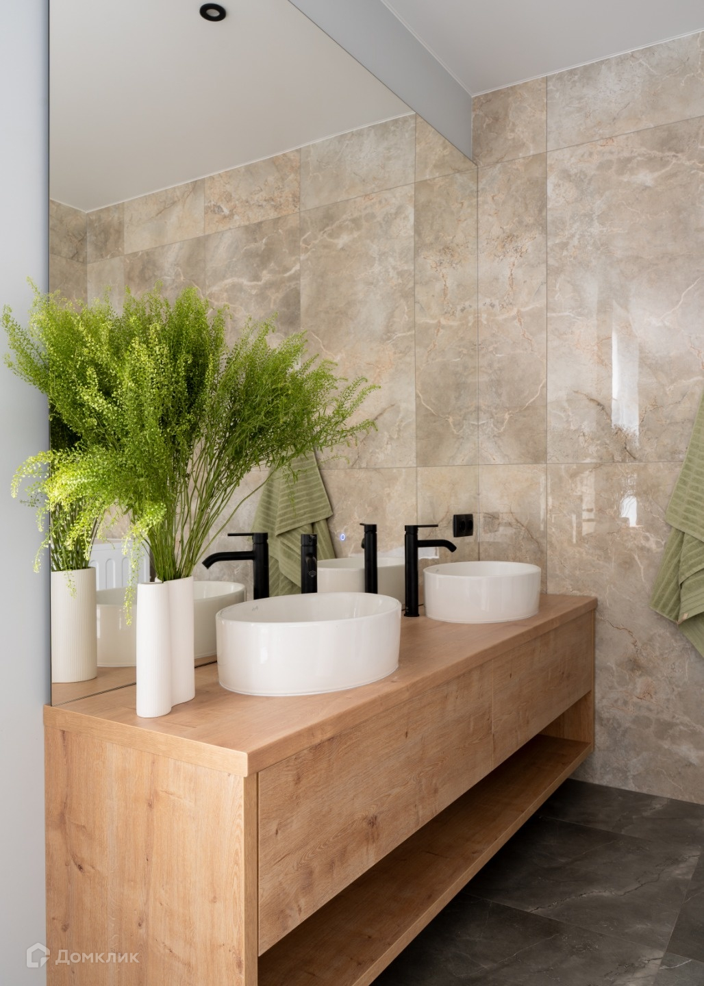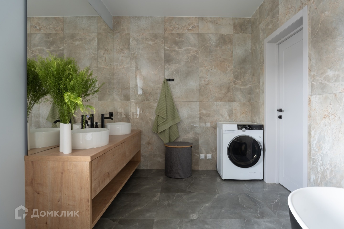 Отделка выполнена в современном стиле из качественных строительных материалов: пол первого этажа теплый, отделан керамогранитом, выполнена полусухая стяжка, утепление 100 мм; стены оштукатурены, выровнены и ошпаклеваны, окрашены в приятные оттенки. Потолок натяжной со встроенным освещением и грамотным зонированием подсветки разных зон. Санузел первого этажа совмещен, отделан керамогранитом, установлена душевая кабина с тропическим душем, подготовлен вывод труб под стиральную машину. Теплая стена для сушки полотенец. Есть дополнительное ночное освещение.