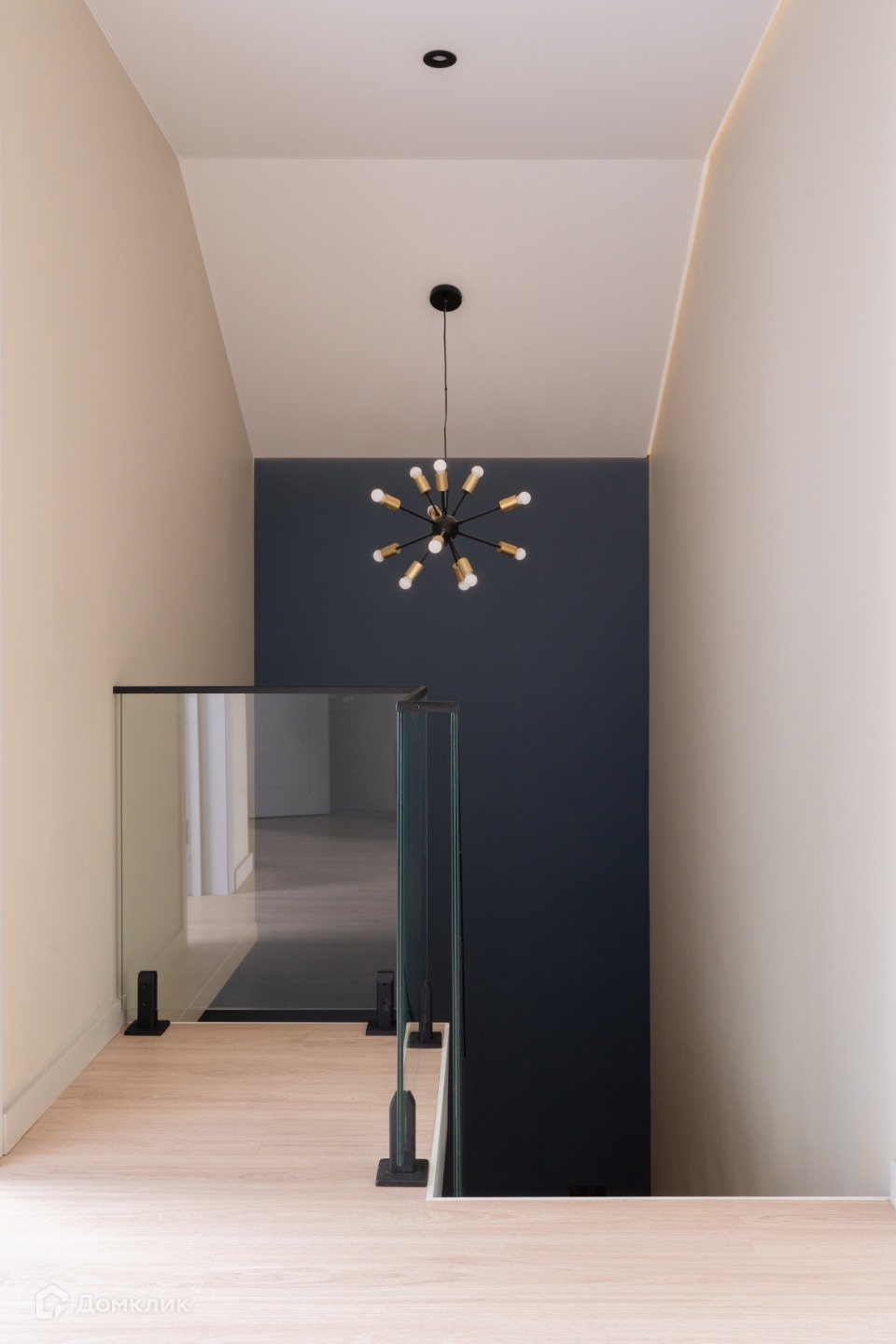 Соединяет первый и второй этаж красивая парящая лестница из железа со стеклянным ограждением. Ступени выполнены из бука.