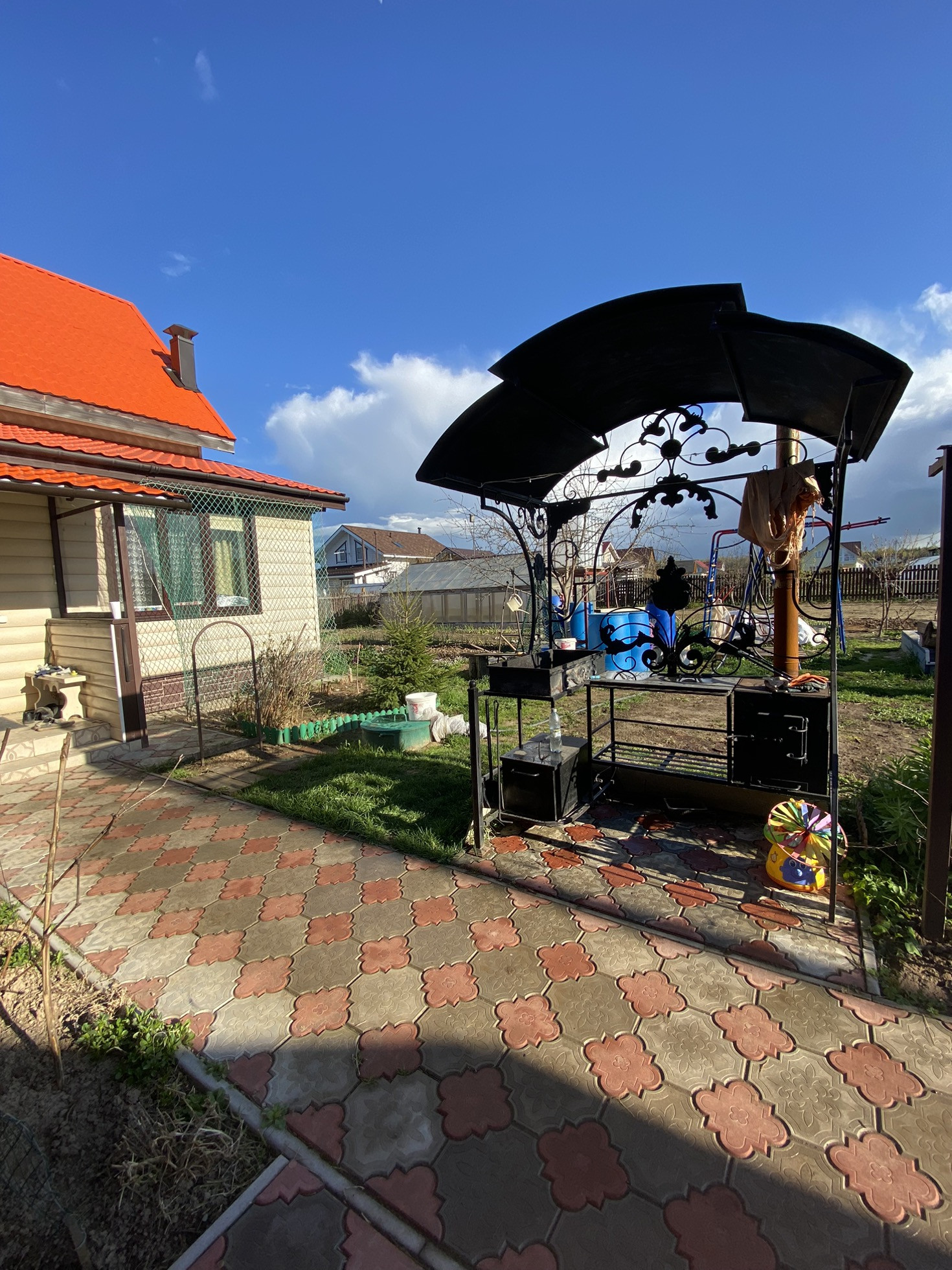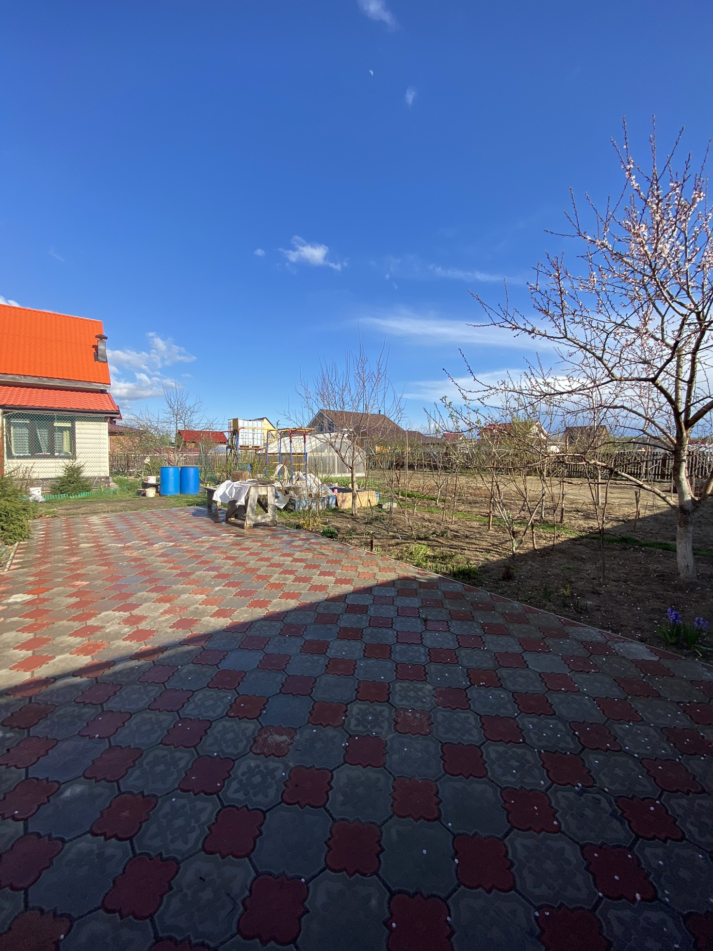 Есть детский уголок, песочница и спортивный комплекс, летом ставим большой батут, есть место под большой каркасный бассейн.