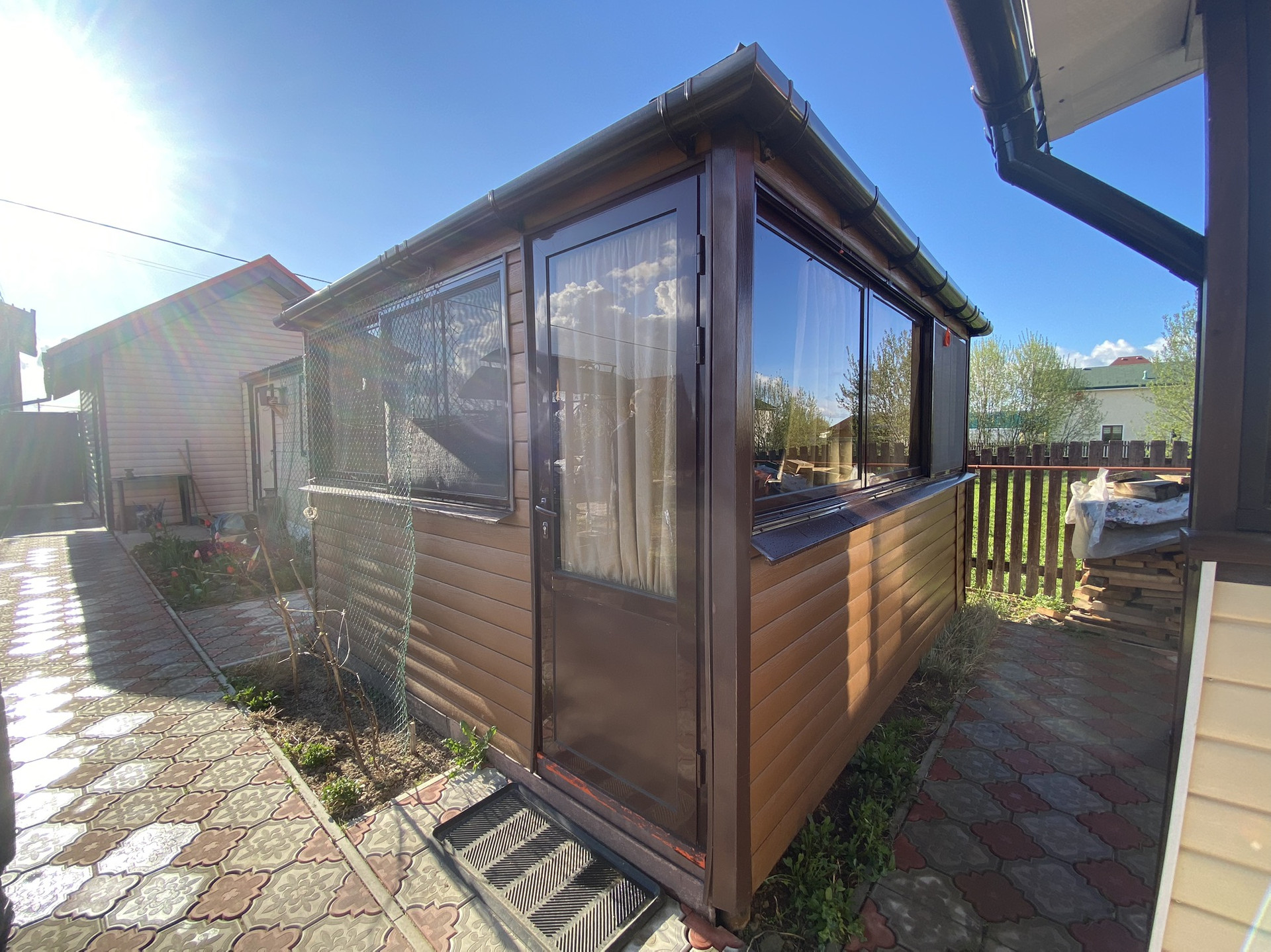 Беседка с большими откатными окнами. Напротив стоит хороший мангал.