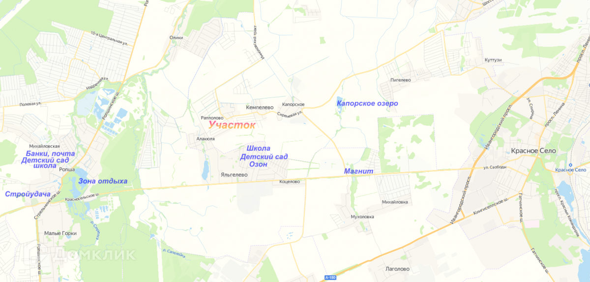 Участок находится в 7 км. от п. Аннино и г. Красного Села, где имеется вся необходимая инфраструктура: образовательные учреждения, гипермаркеты, продуктовые магазины, бассейн, фитнес, почта, рестораны, парки.