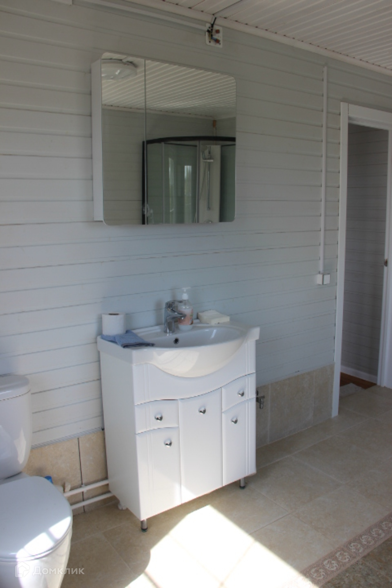 Потолок и стены обшиты деревянной вагонкой, полы - доска лиственница, в санузлах полы-плитка. Окна ПВХ 2х-камерные. Планировка дома уютная и просторная с широкой удобной лестницей на второй этаж.