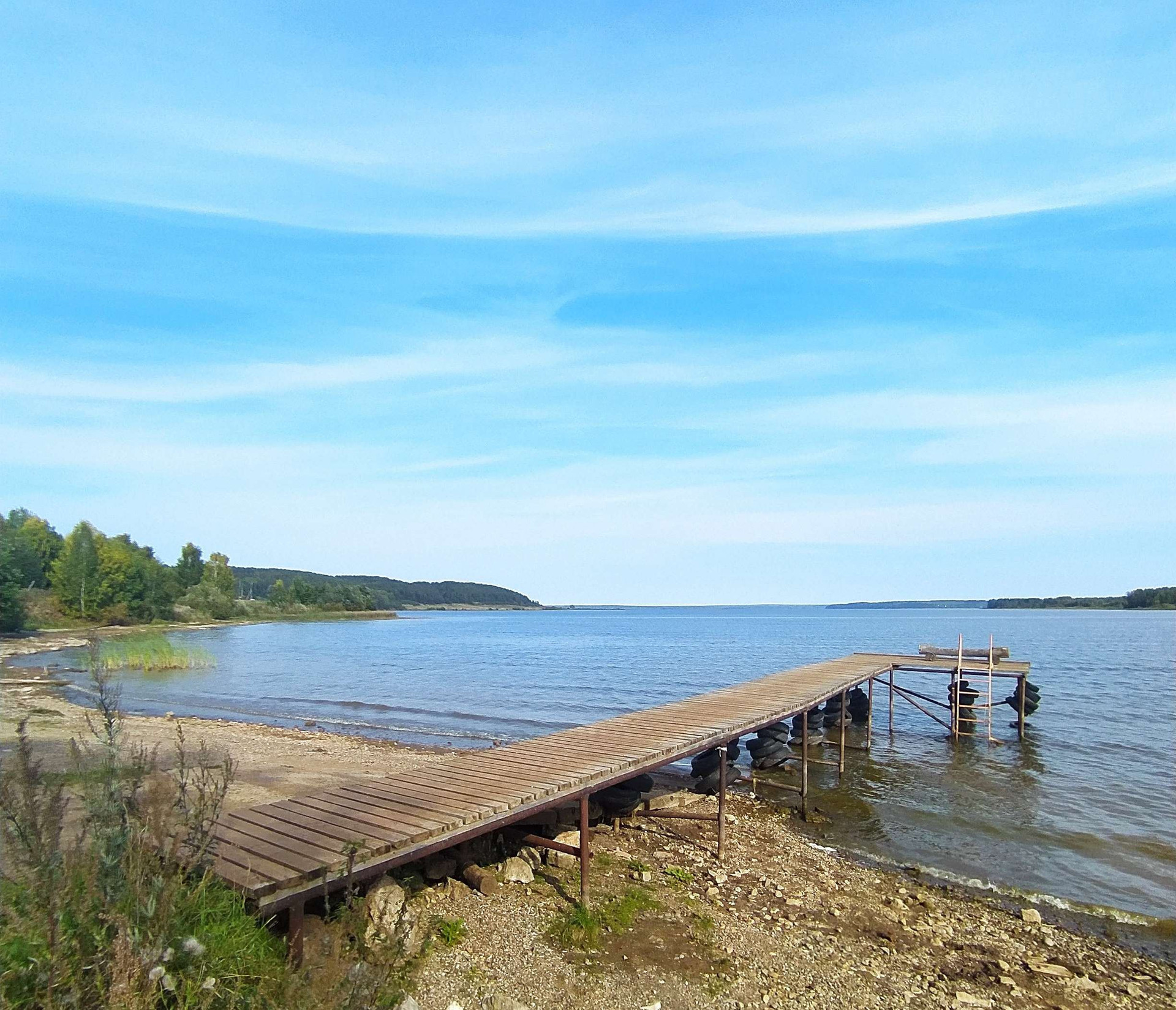 Оборудован пляж, пирс и спуск для лодок.