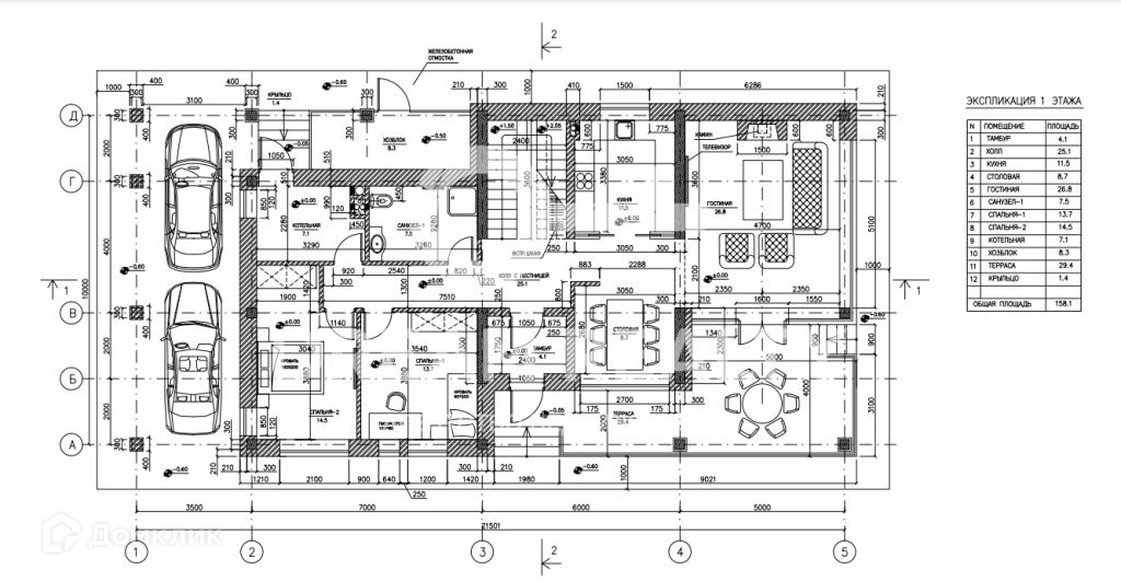 1 этаж: прихожая, холл, гостиная, кухня, столовая, каминный зал с действующим камином, две спальни, просторная незастекленная терраса, санузел, котельная (оборудована по государственным стандартам), хозяйственная комната с отдельным выходом на улицу.