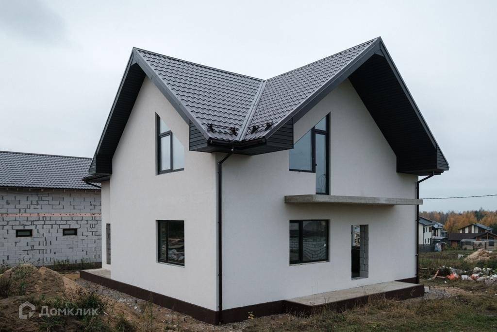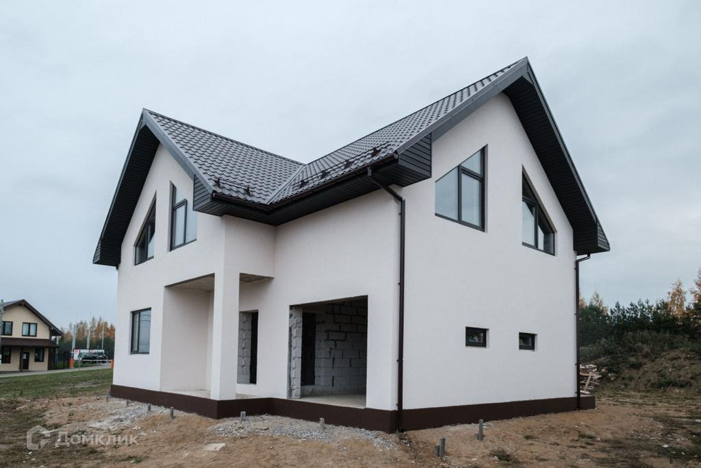 На участке выполнены необходимые работы по дренажу и монтажу ливневой канализации.Фундамент монолит(плита). Внешняя отделка дома декоративная штукатурка, без внутренней отделки. На первом этаже расположены кухня 20 кв.м. гостинная 28,9 кв.м, спальня 15,3 кв.м, совмещенный санузел, помещение под котельную. На втором этаже 4 комнаты:24,4,14,8, 12,1, 12,1 и совмещенный санузел. В продаже есть другие планировки коттеджей.