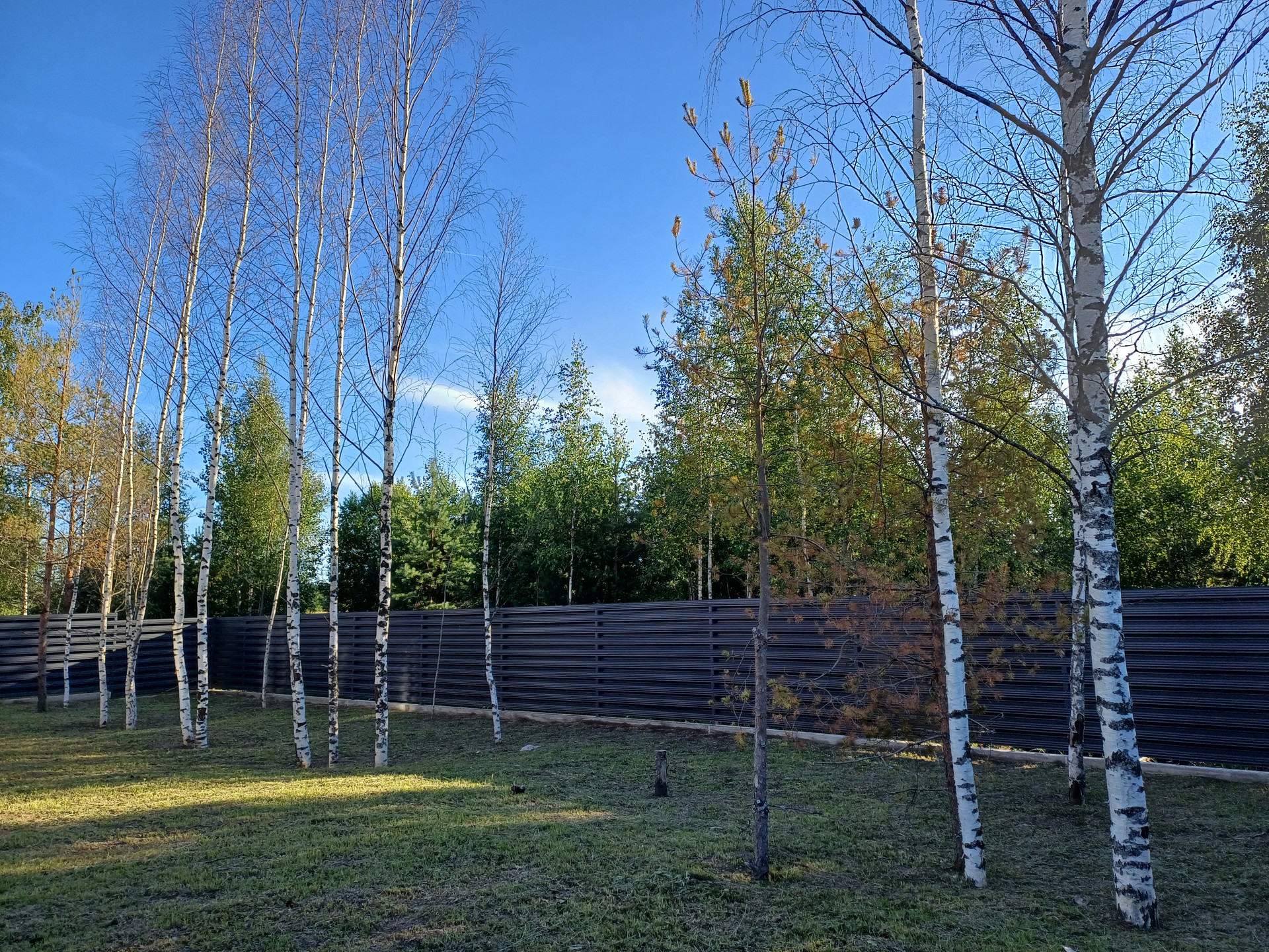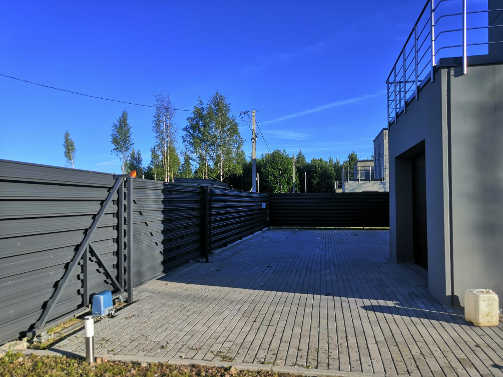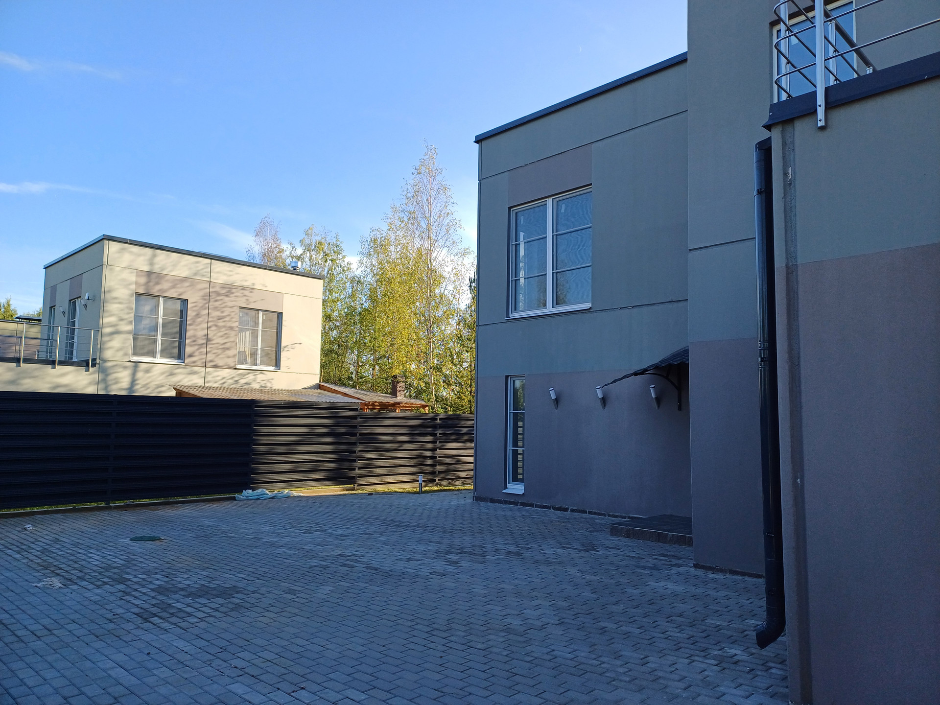 Участок благоустроен, огорожен хорошим забором с автоматическими воротами, во дворе брусчатка, есть деревья, газон.