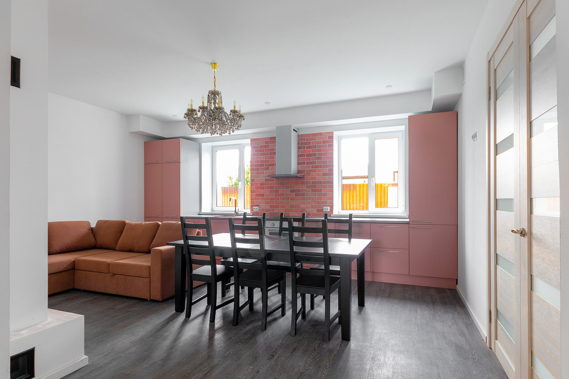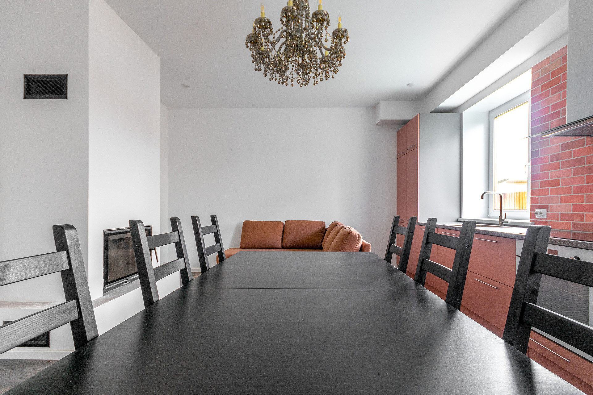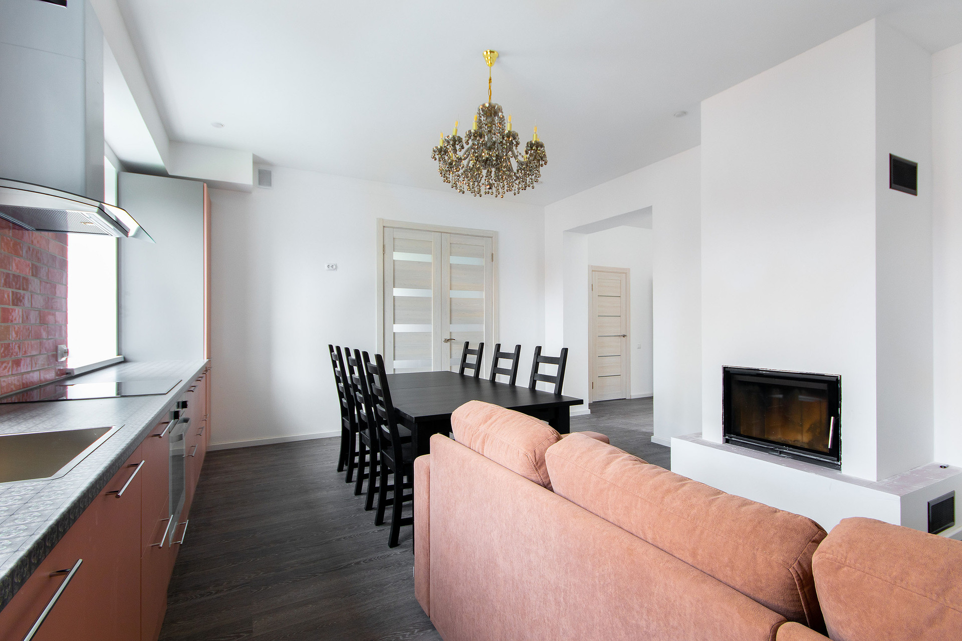 - кухню-гостиную со встроенной мебелью, техникой и с дровяным камином