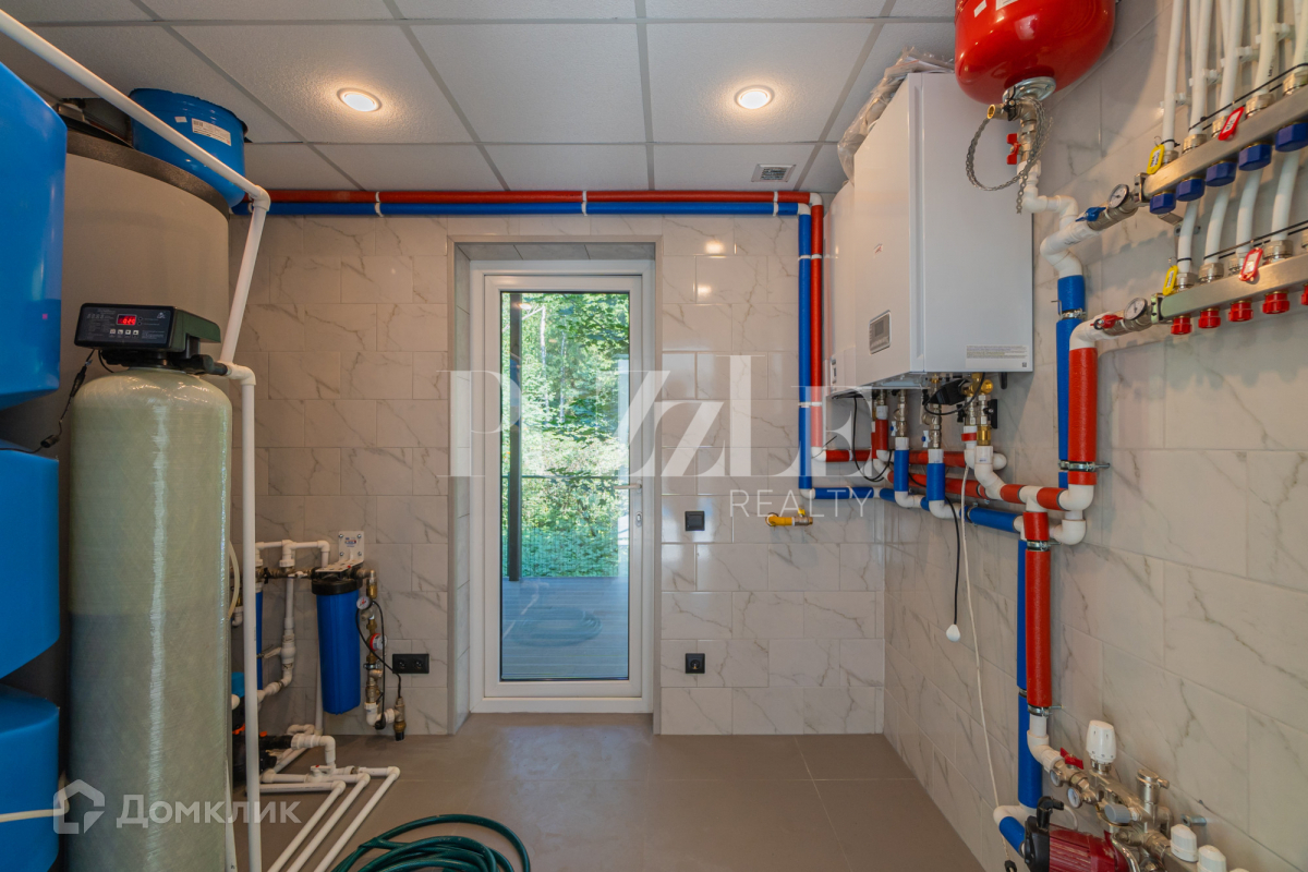 Внутреннее коммуникационное обеспечение дома: отопление обеспечено магистральным газом. Дополнительно есть электрокотел. Бойлер на 300 литров. Смонтированы теплые водяные полы. Установлены сплит системы с возможностью регулирования температуры в каждой комнате. По индивидуальному проекту смонтирована принудительная вентиляция. Собственная скважина с системой водоочистки.