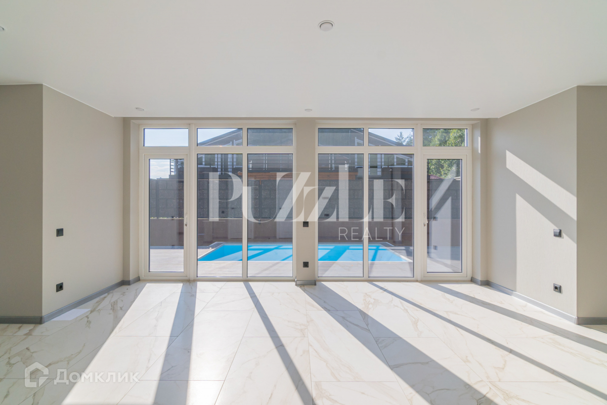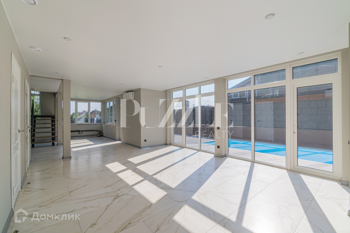 Первый этаж занимает большая кухня-гостиная 100м2 с высокими потолками , которая  имеет большие панорамные окна выходящие на бассейн.