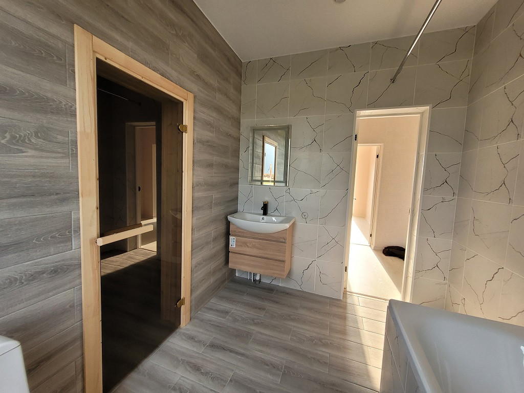На втором этаже- 3 спальни, гардеробная, балкон и также сан.узел с ванной, сауной и теплыми полами.