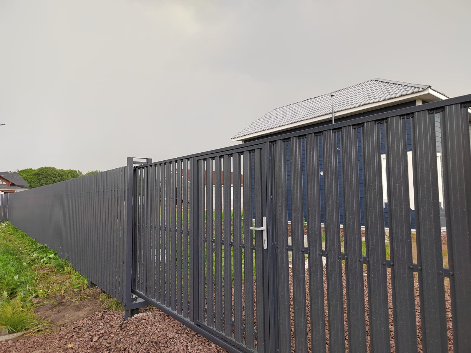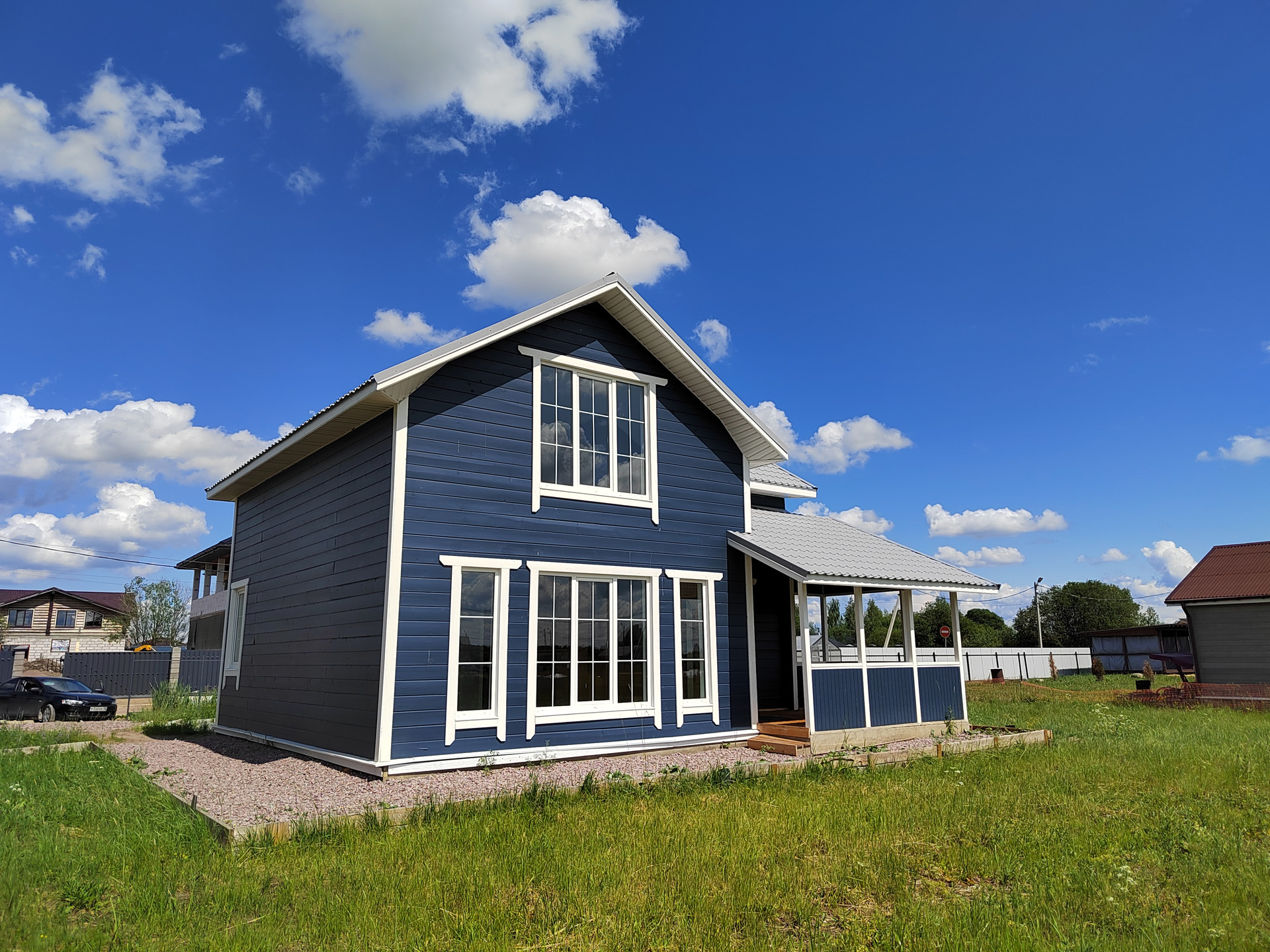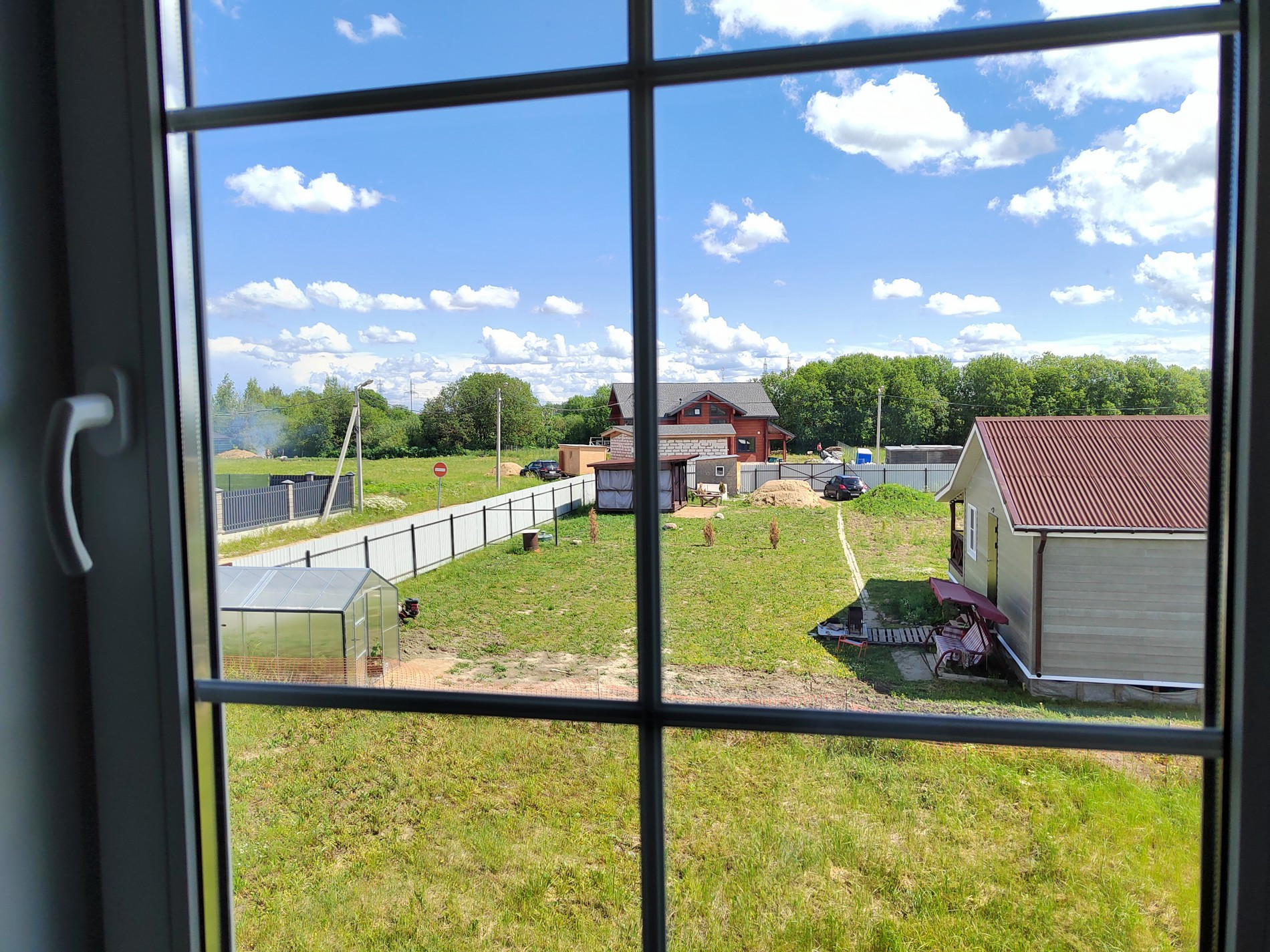 Участок хорошего размера- 12 соток, правильной прямоугольной формы, ландшафт-ровный, весной сухой. Покрытие - газонные, полевые травы. Вокруг дома щебеночная подготовка под плитку для дорожек и парковки с барбекю. Сделан красивый фасадный забор с откатными воротами.