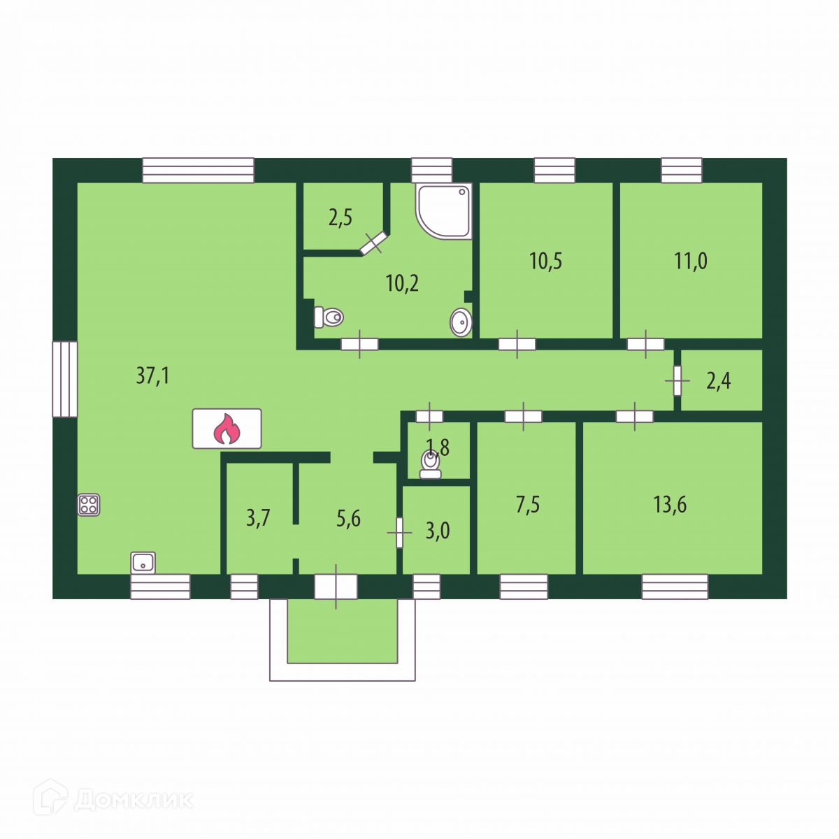 Планировка: просторная кухня-гостиная - 37,1 кв.м с выходом на террасу, четыре комнаты 10.5, 11.0, 13.6 и 7.5 кв.м , прихожая, две гардеробных, санузел, ванная комната с сауной, котельная.