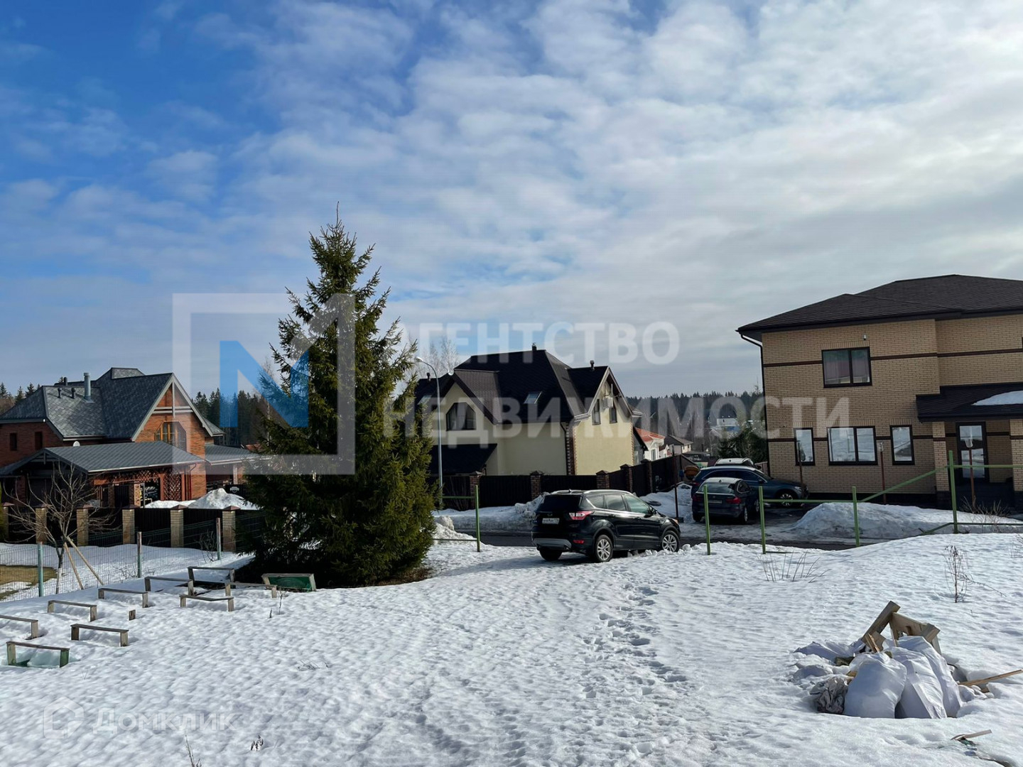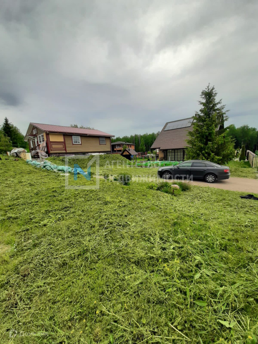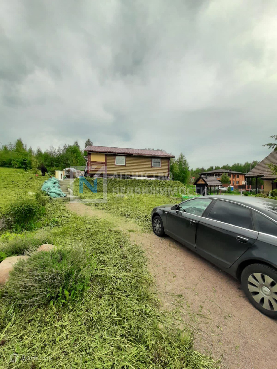 Участок размежёван, с наклоном, сухой, с множеством декоративных цветов, кустов и деревьев. Дом стоит на высокой точке, благодаря чему из окон открывается красивый вид на поселок.