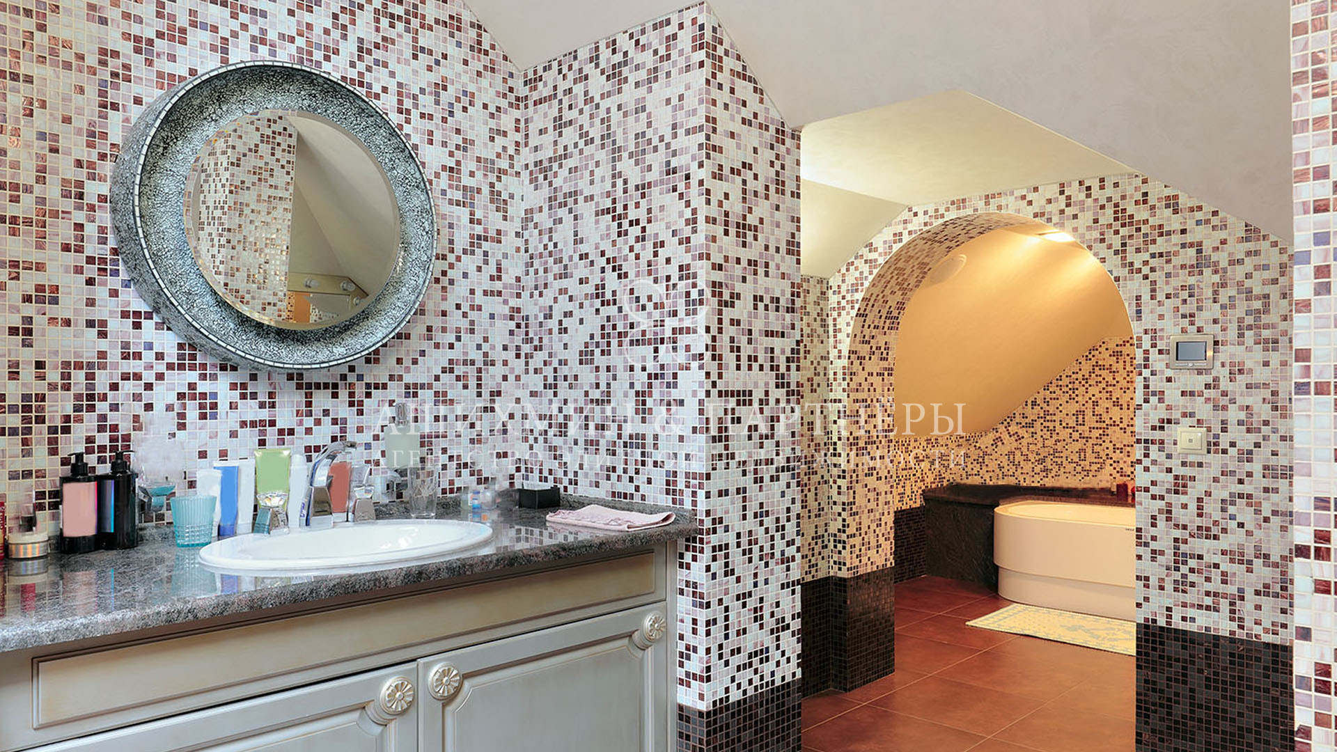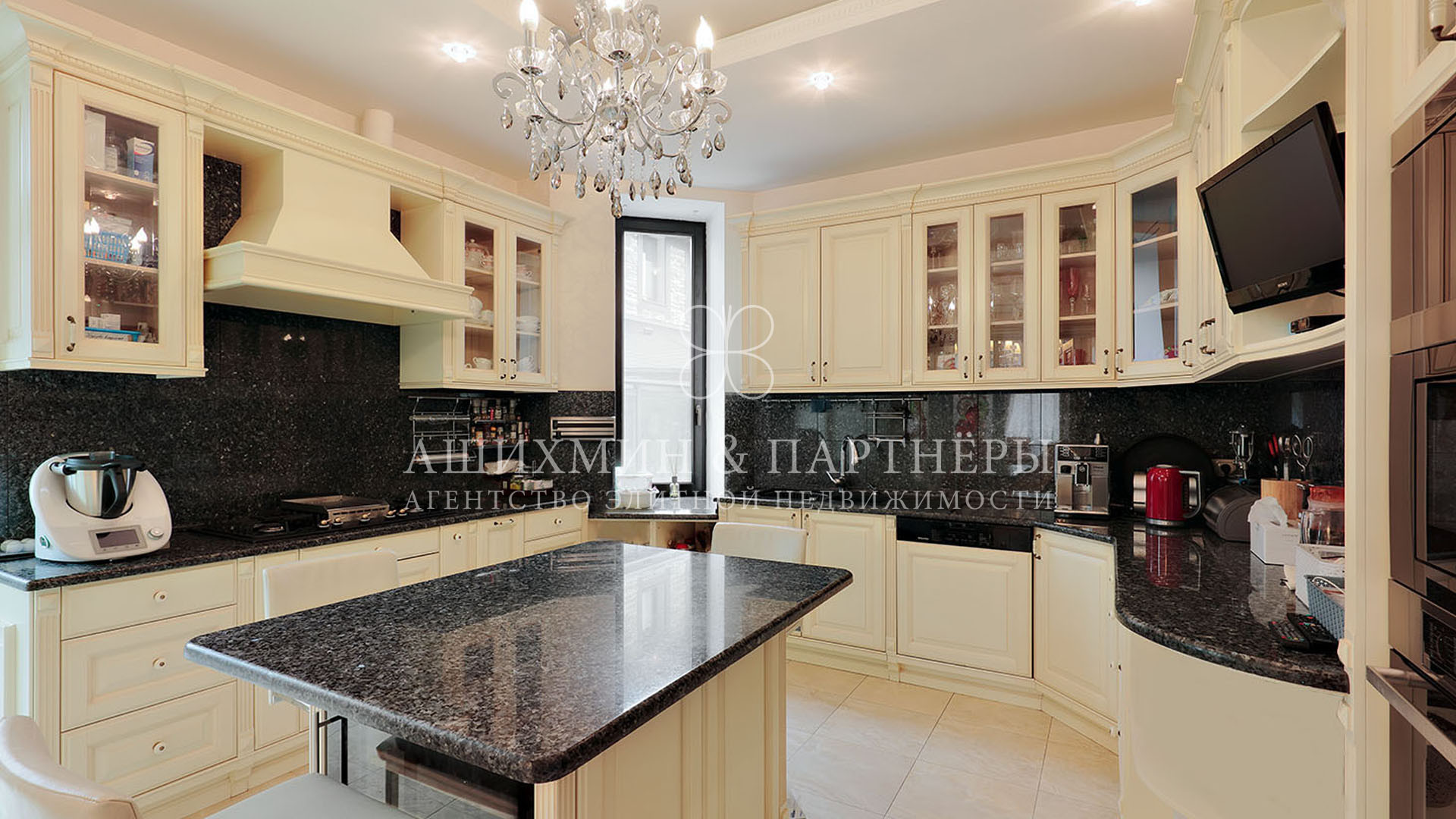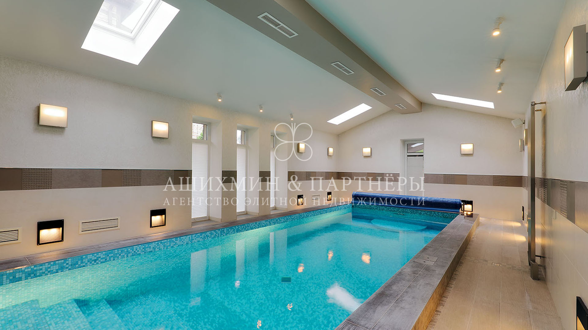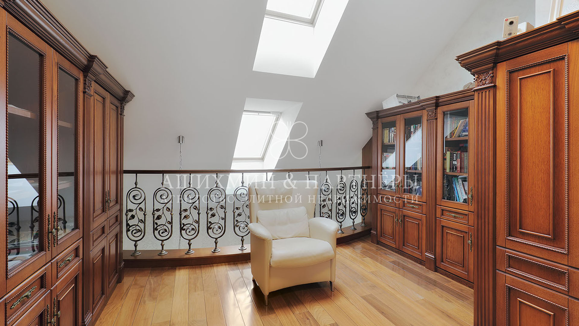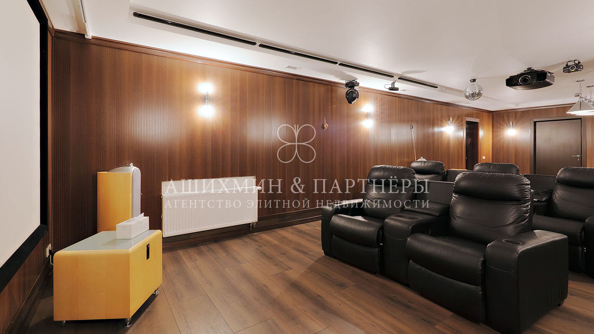 На первом этаже спланирована гостиная с выходом на крытую террасу, кухня, столовая, две ванные комнаты и комната свободного назначения. На втором этаже три спальни с ванными комнатами и гардеробными, кабинет. На мансарде спальня с ванной комнатой и гардеробной. На цокольном этаже кинотеатр, детская игровая комната, технические помещения.