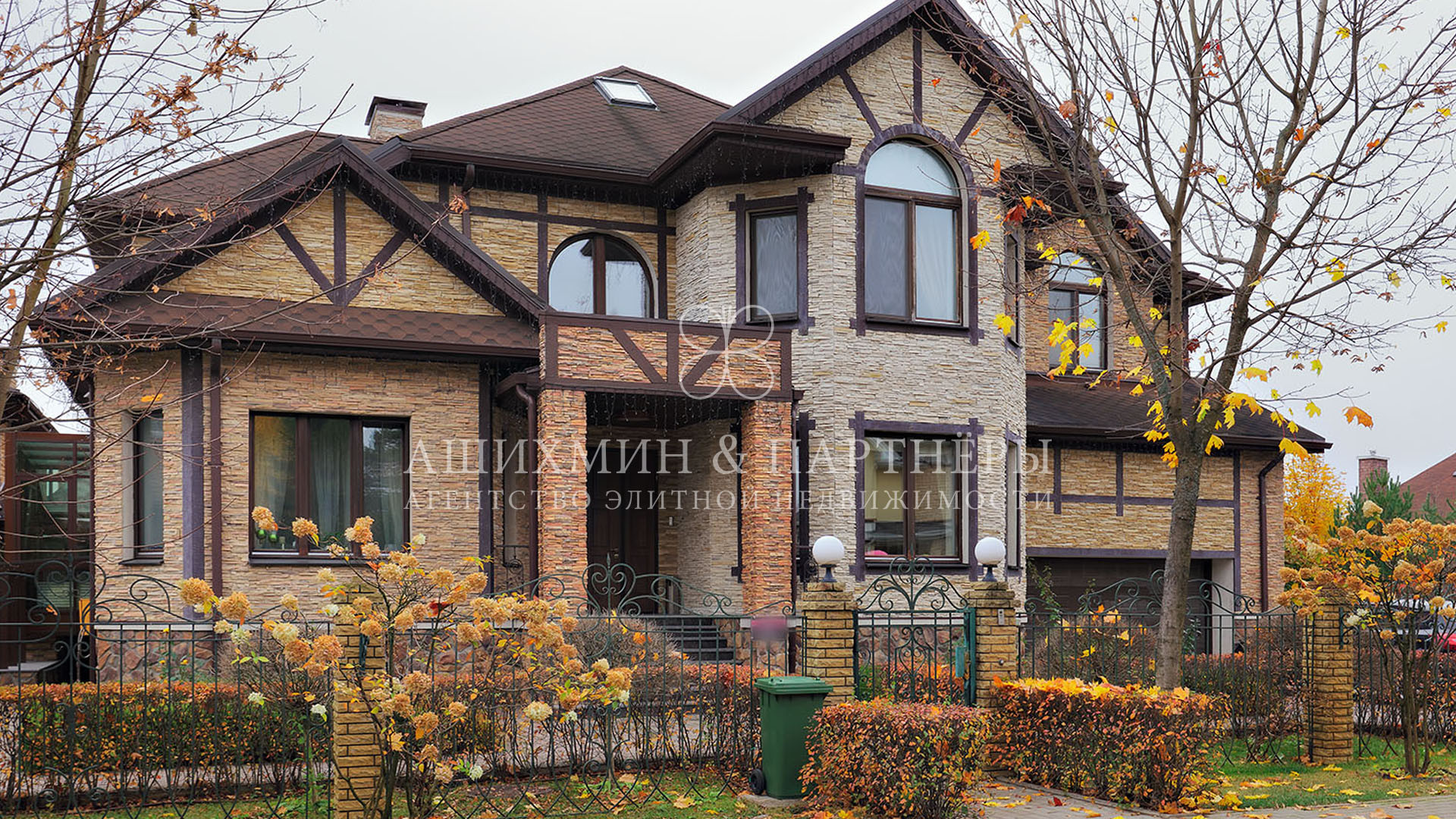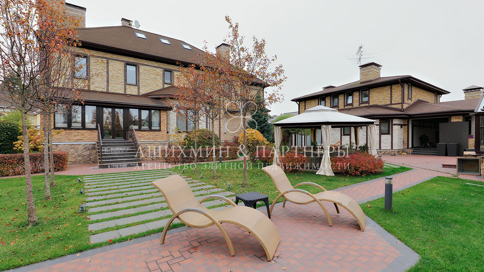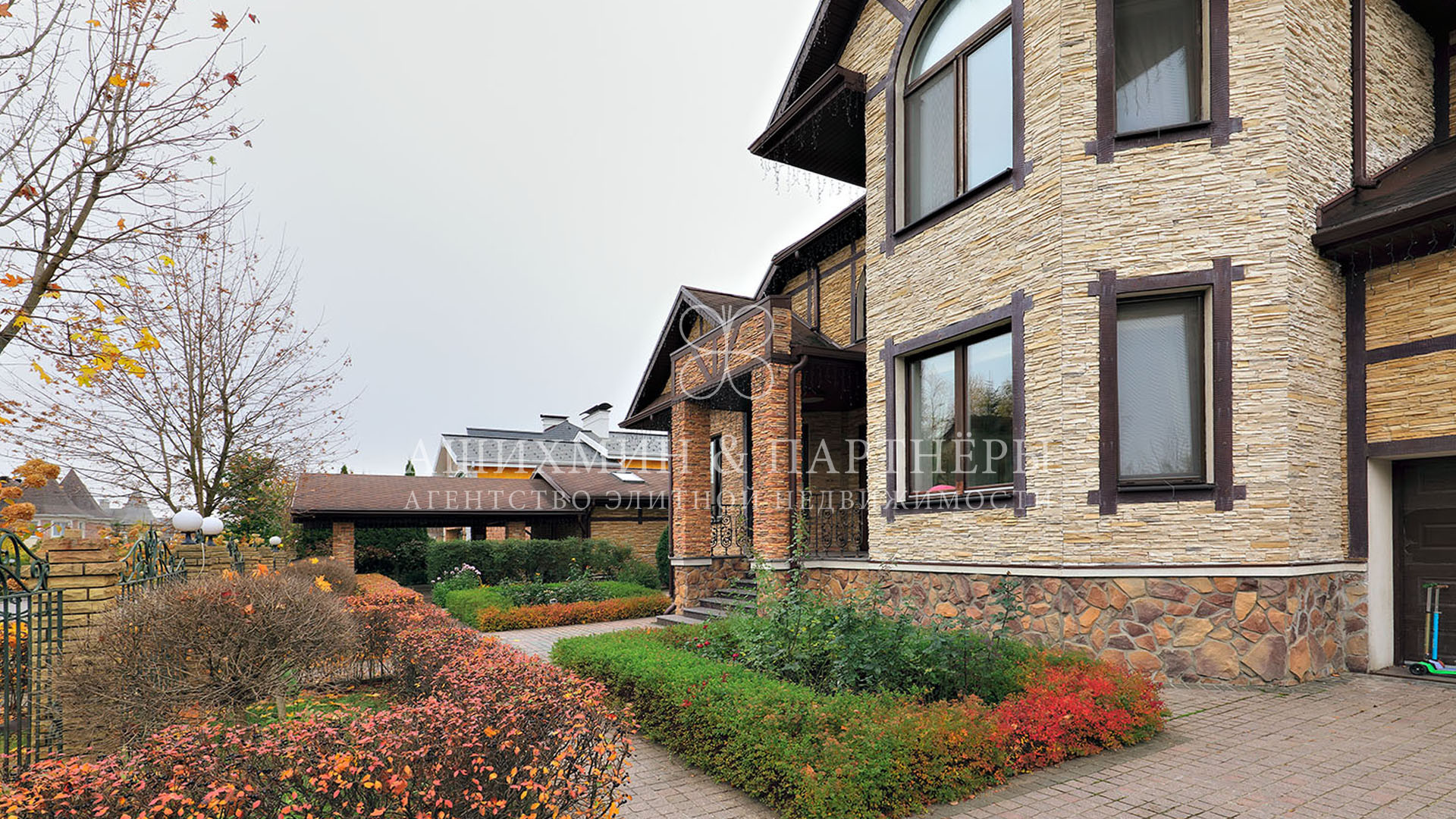 На придомовом участке выполнен ландшафтный дизайн: ухоженные газоны с автоматическим поливом, освещение, летняя беседка и зона отдыха с барбекю. Предусмотрены машиноместа в крытом гараже, под навесом и на открытой территории.