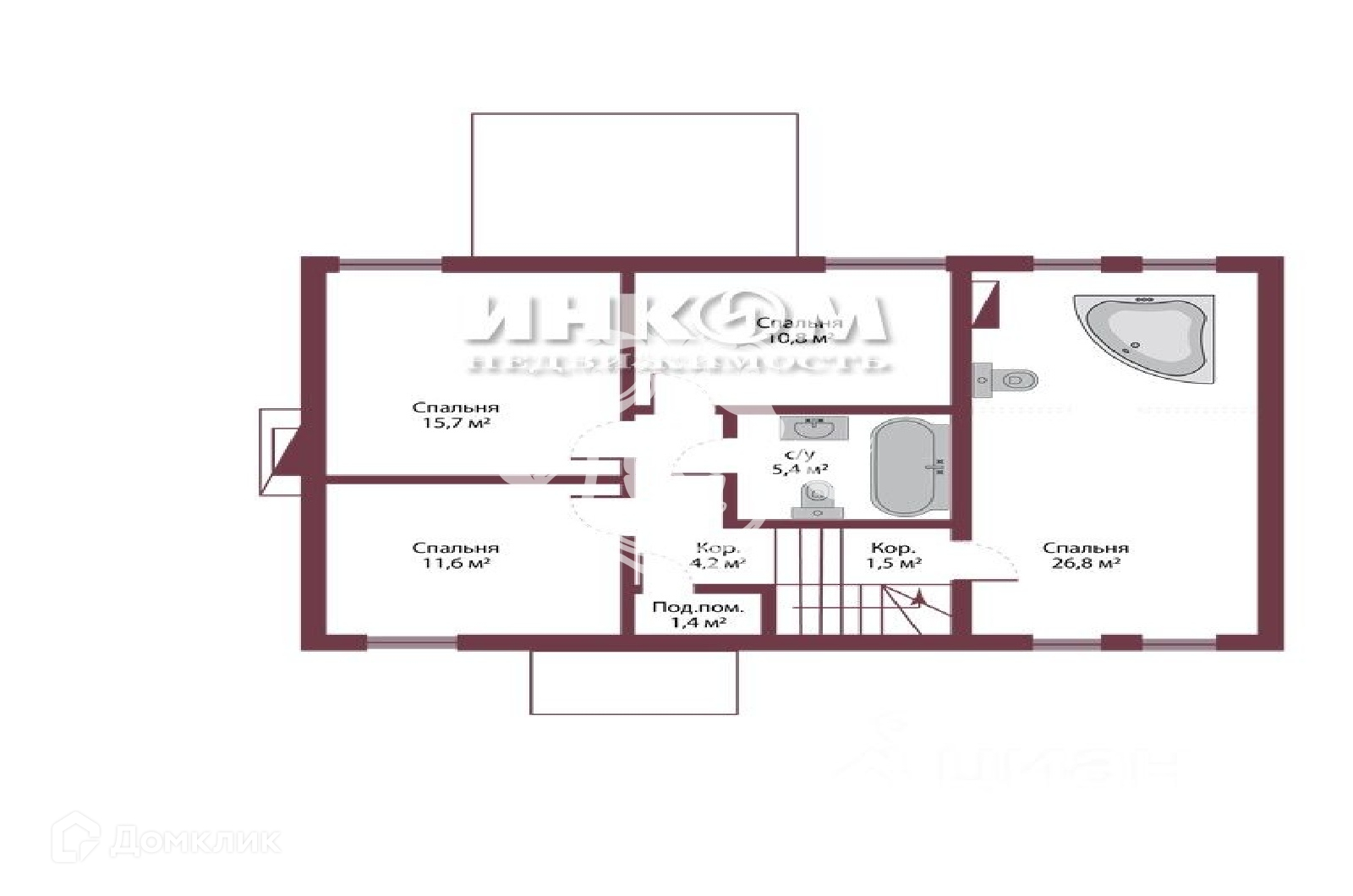 1,5 этаж — мастер-спальня с гардеробной и с/у2 этаж — 3 спальни, с/у.