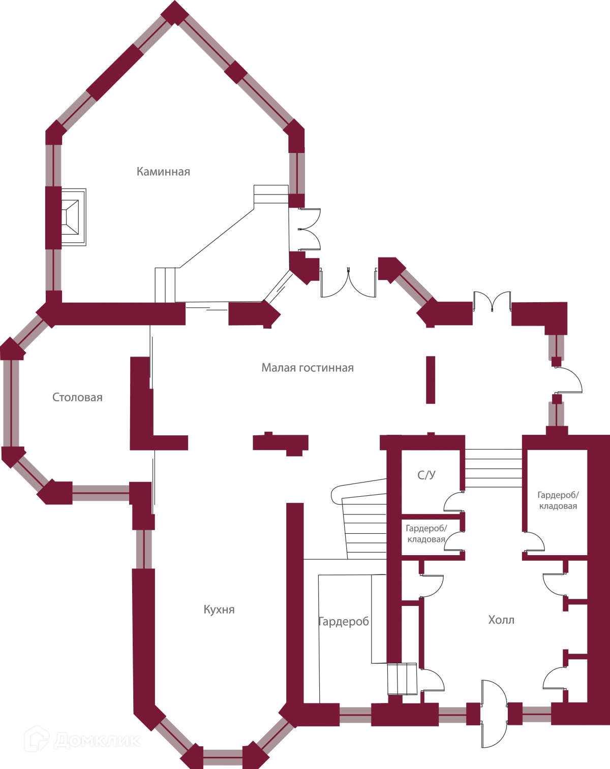 1 этаж: холл, гардеробная, кладовая, гостинная, кухня, столовая, каминная, санузел;
