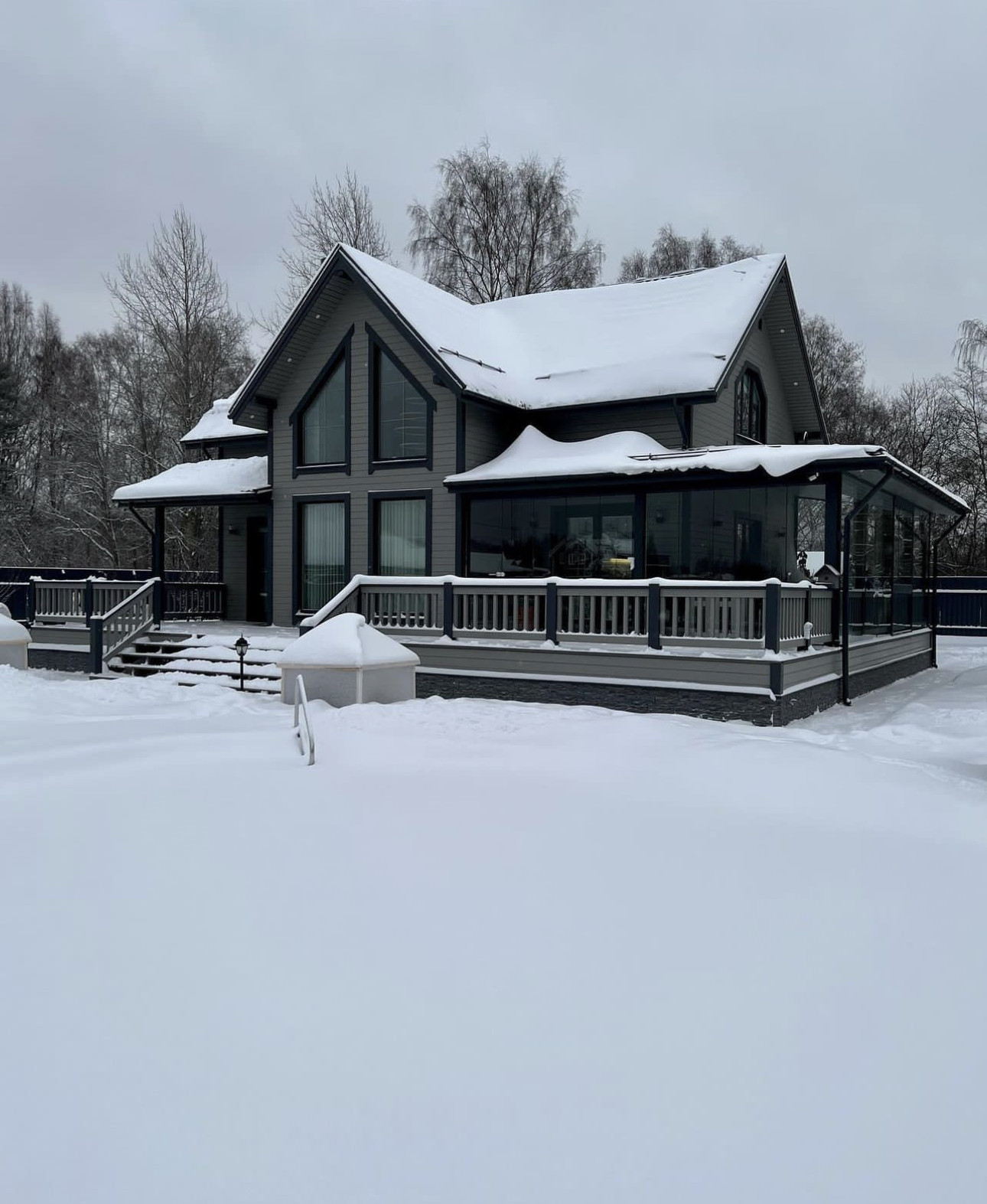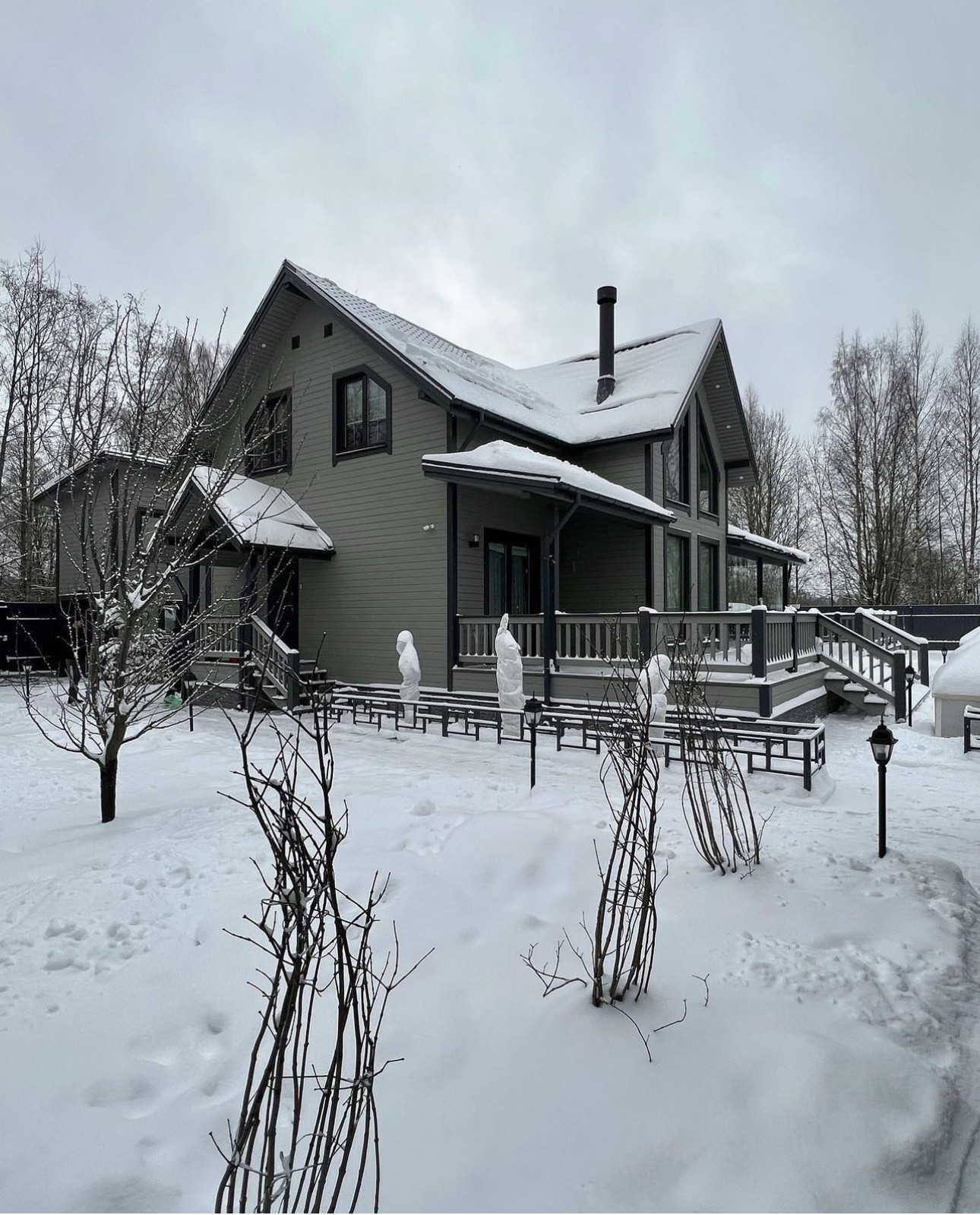 Дом построен по каркасной технологии. На большом участке в 15 соток разместились основной дом 250 квадратов, гостевой дом-баня 90 квадратов, хоз блок. На участке ландшафтный дизайн с хвойными и плодовыми деревьями и кустарниками, дорожки, пруд, освещение по периметру всего участка.