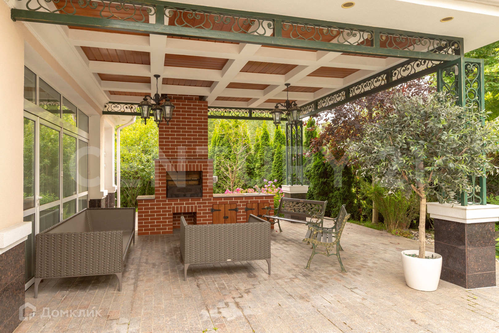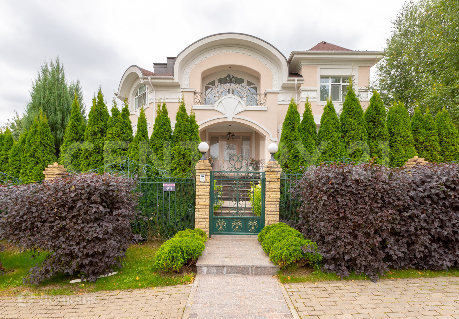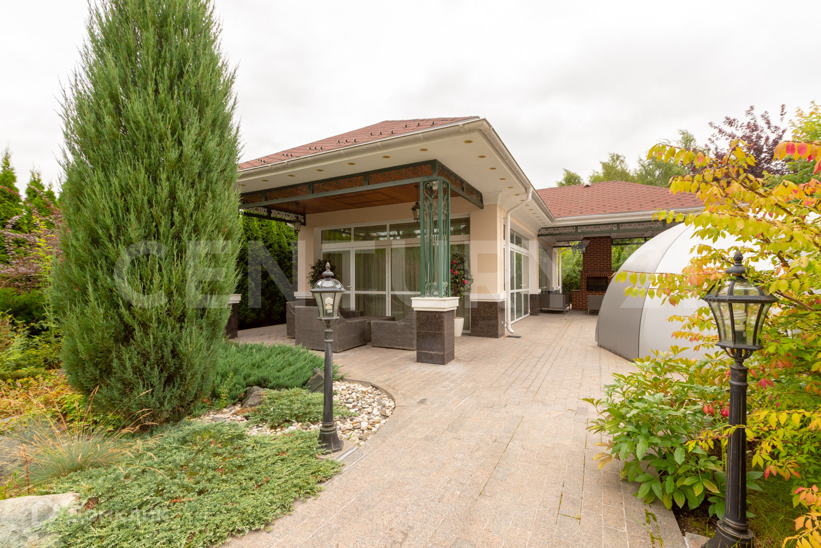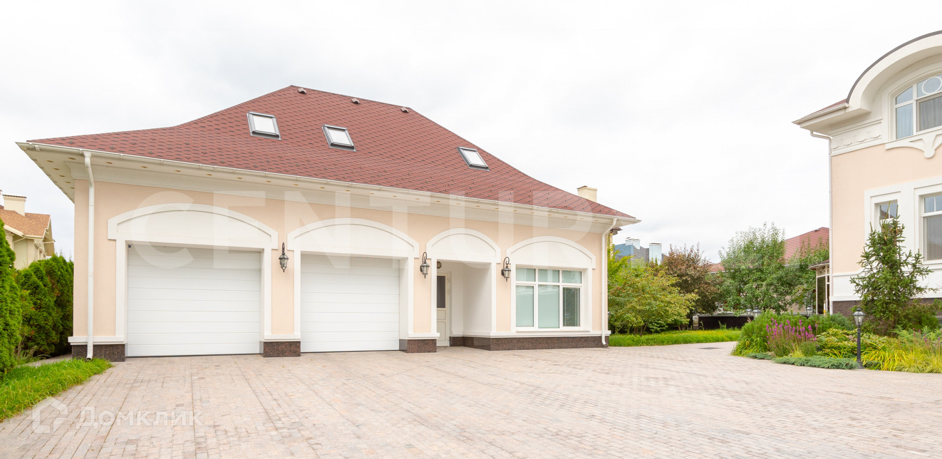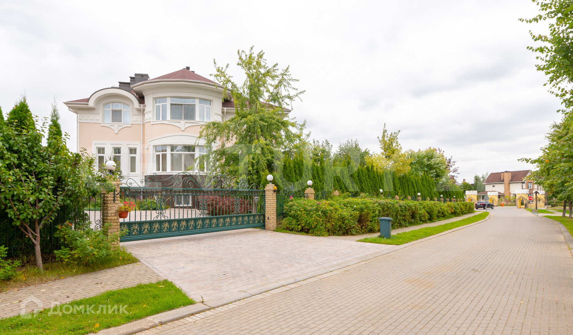 На участке расположены: гостевой дом 64 кв.м с зоной для барбекю, гараж с домом охраны 208 кв.м, гараж с навесом 102 кв.м., фонтан. Расположение объектов на участке грамотно спланировано, выполнен ландшафтный дизайн с множеством декоративных растений и деревьев. Все здания построены из дорогих и качественных материалов и оснащены современным инженерно-техническим оборудованием.