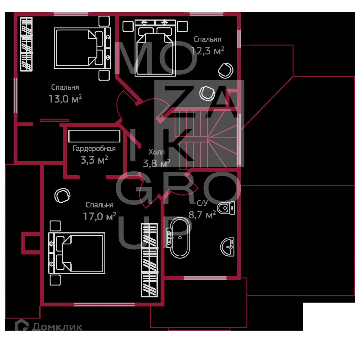 2 этаж: мастер-спальня с гардеробной, две спальни, ванная комната.