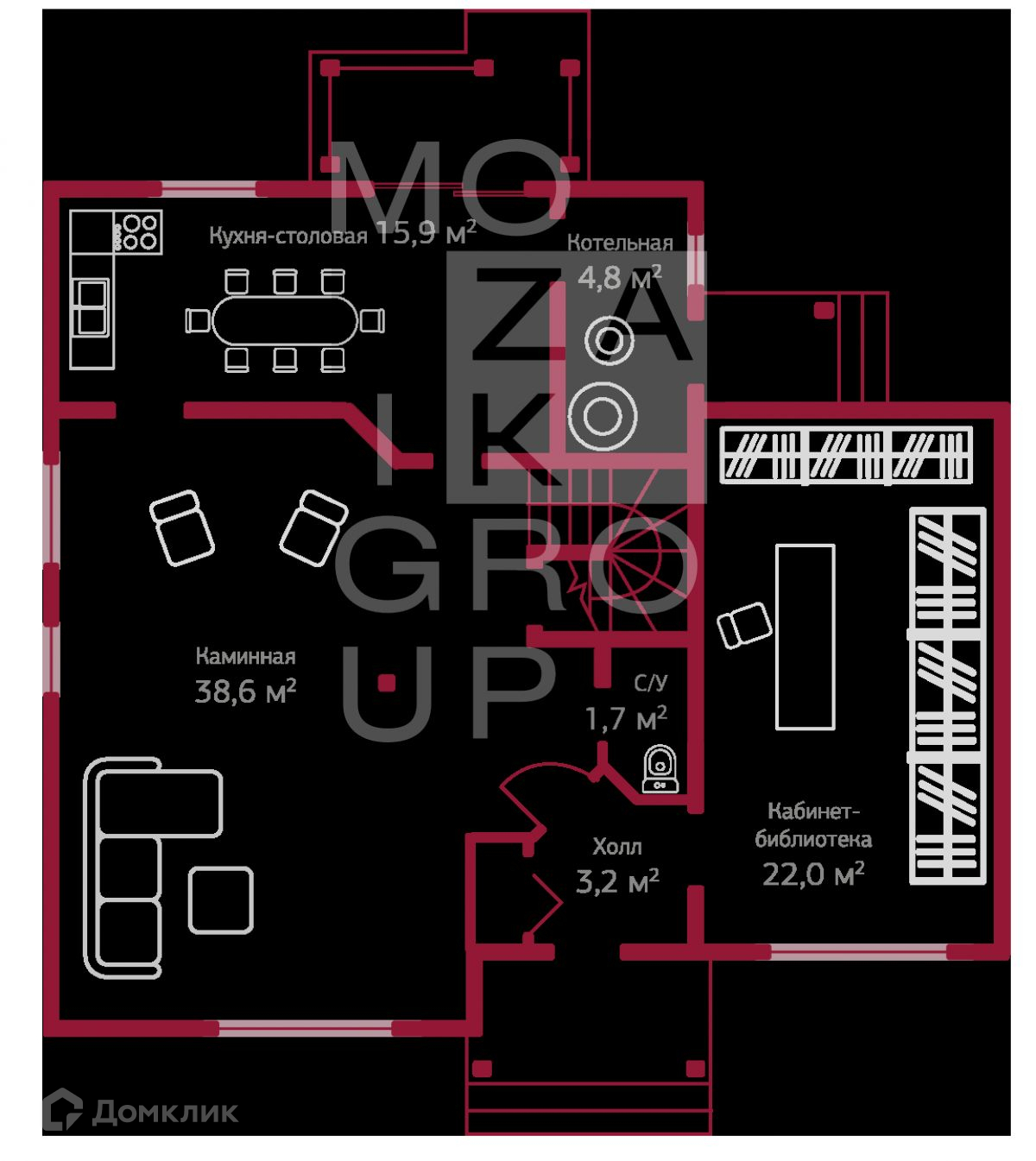 1 этаж: холл, каминная, кухня-столовая, кабинет-библиотека, санузел, котельная;
