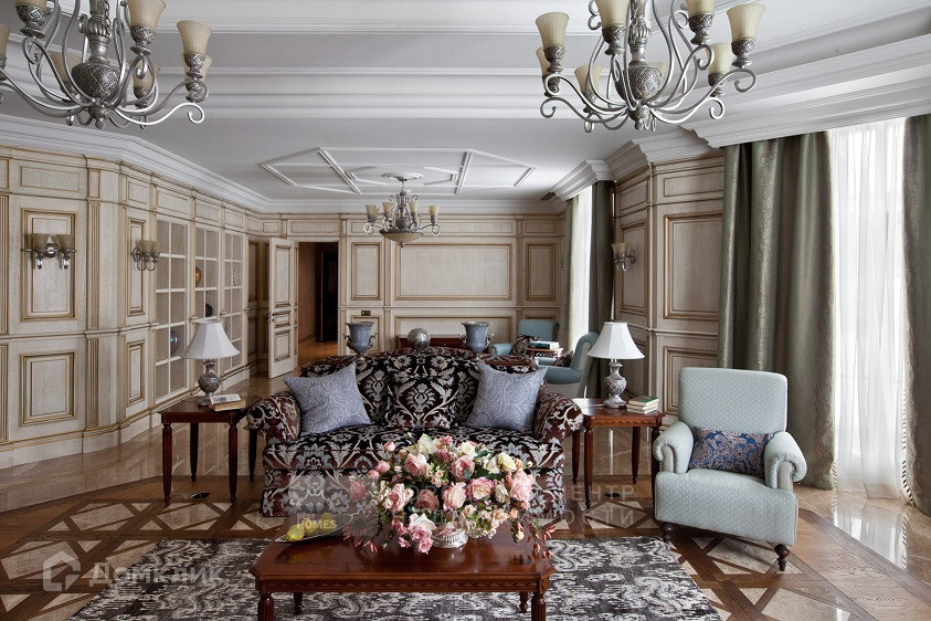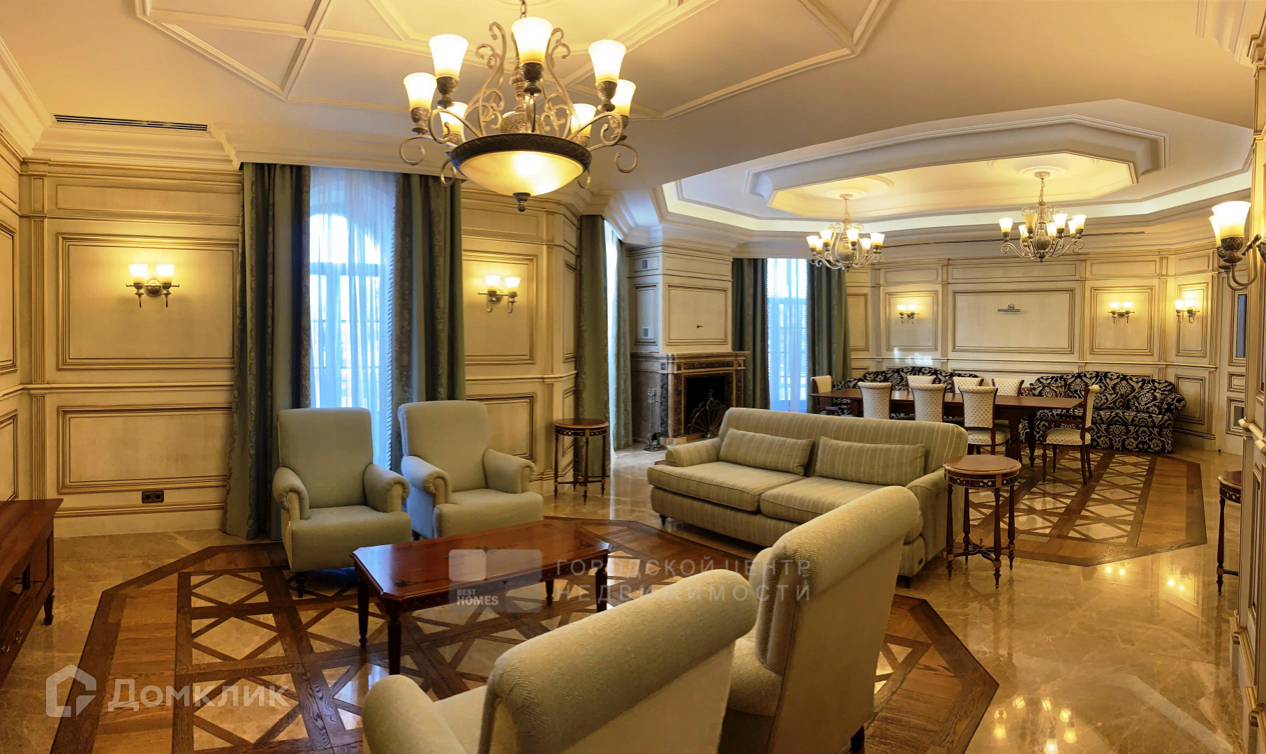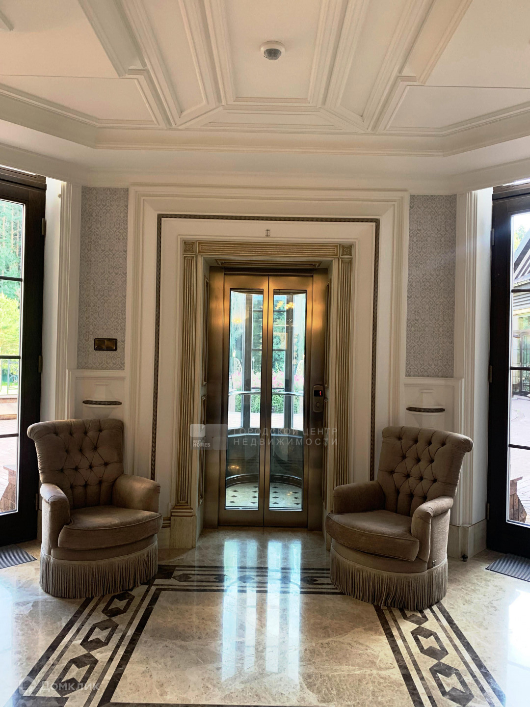 Дом Вас встречает только самыми лучшими материалами, в отделке использованы итальянский мрамор, наборный дубовый паркет с уникальным индивидуальным рисунком, витражи, тяжелые деревянные двери, вся мебель выполнена на заказ в Италии, так же как и текстиль и светильники. Но главная фишка – это свой индивидуальный лифт.
