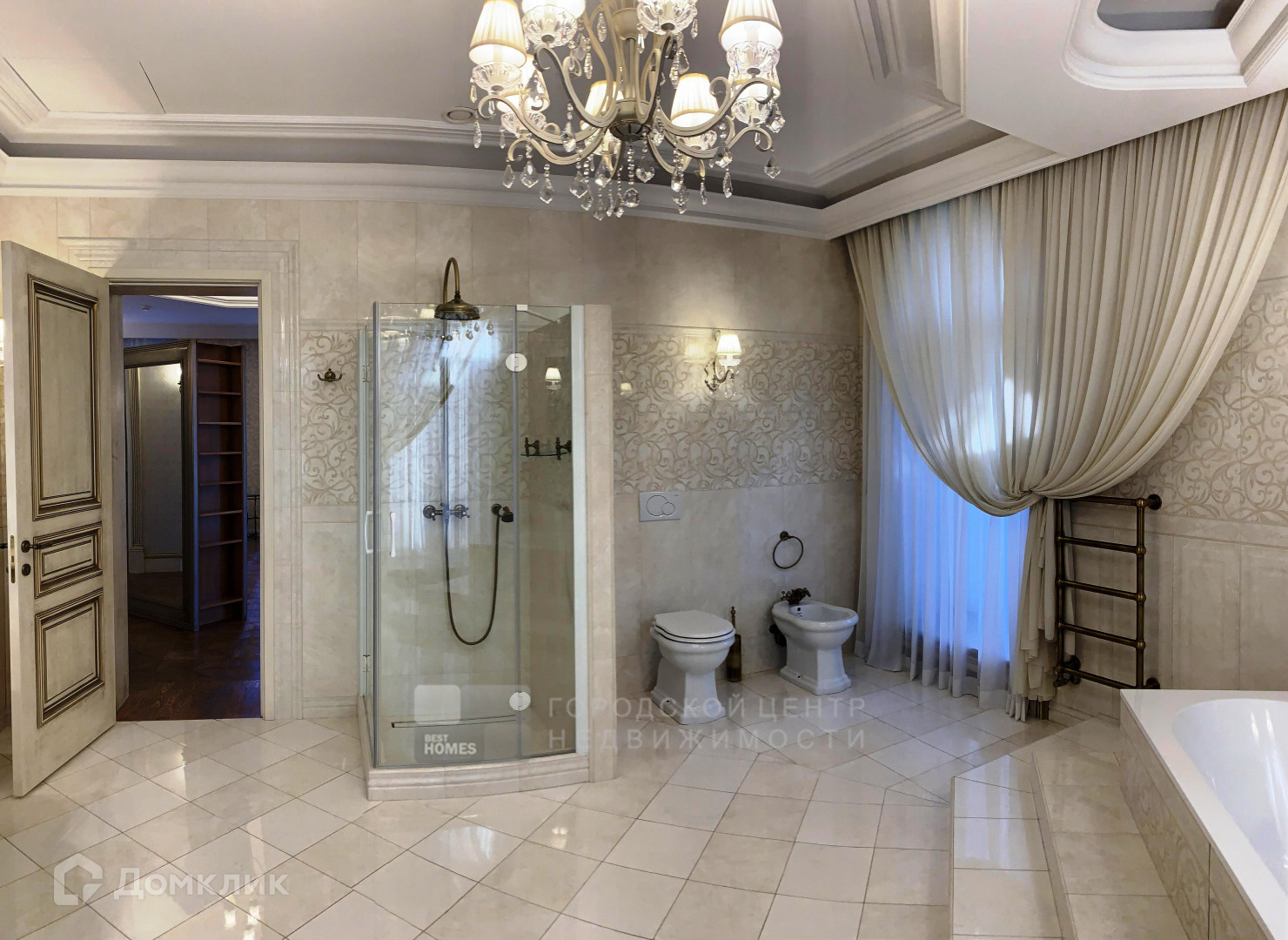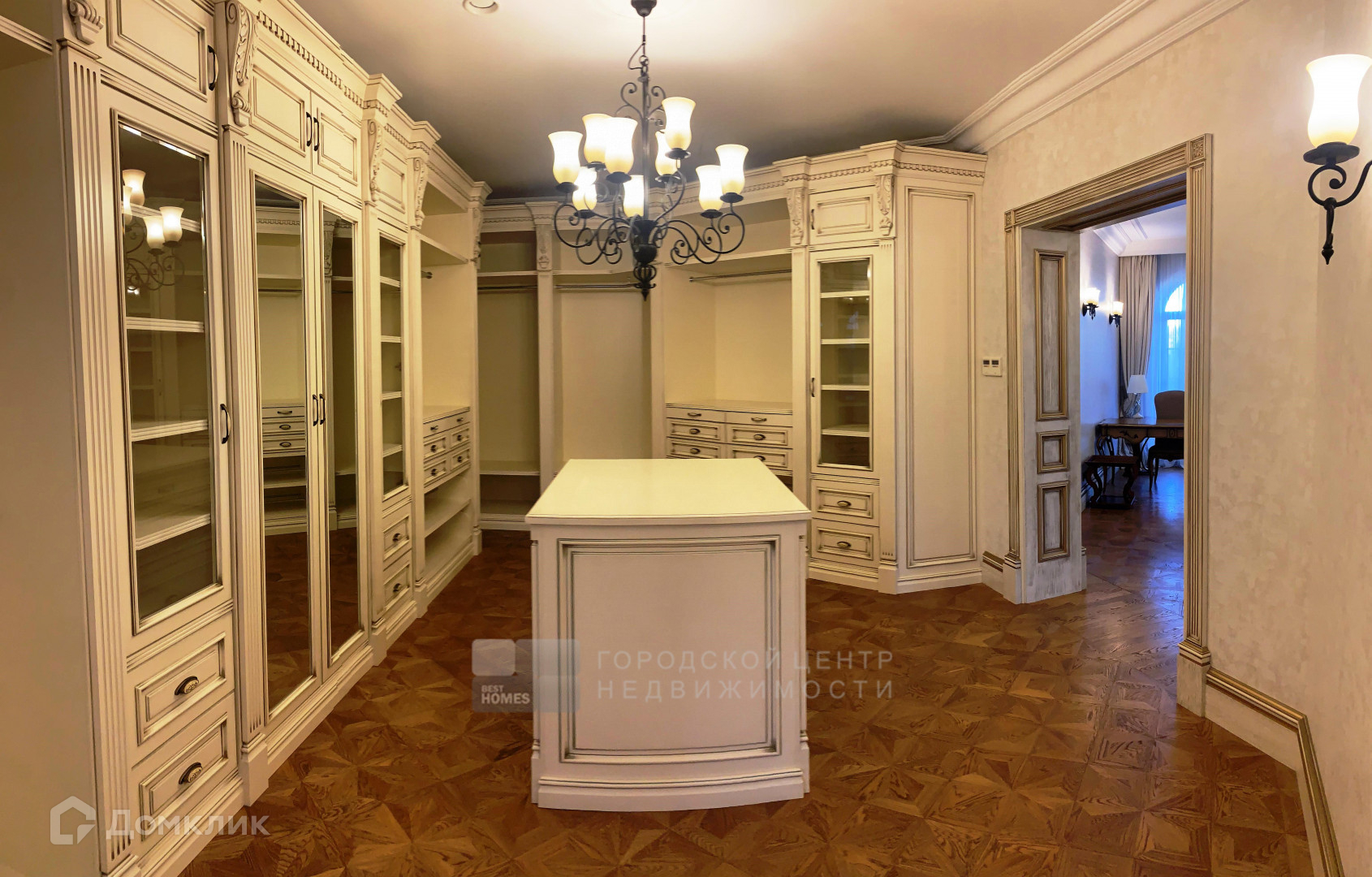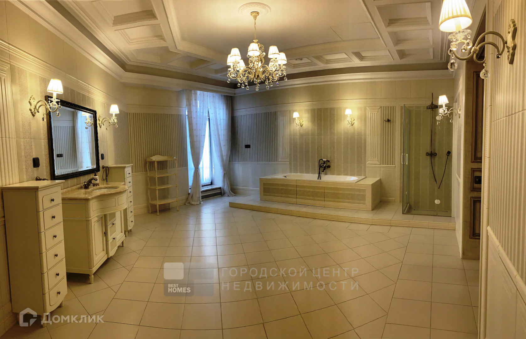 Дом Вас встречает только самыми лучшими материалами, в отделке использованы итальянский мрамор, наборный дубовый паркет с уникальным индивидуальным рисунком, витражи, тяжелые деревянные двери, вся мебель выполнена на заказ в Италии, так же как и текстиль и светильники. Но главная фишка – это свой индивидуальный лифт.