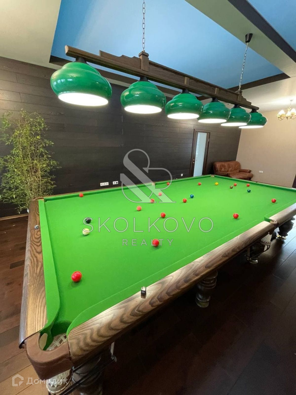 зал-бильярдная со столом 12 футов (снукер) с выходом на мансарду с видом на поселок.