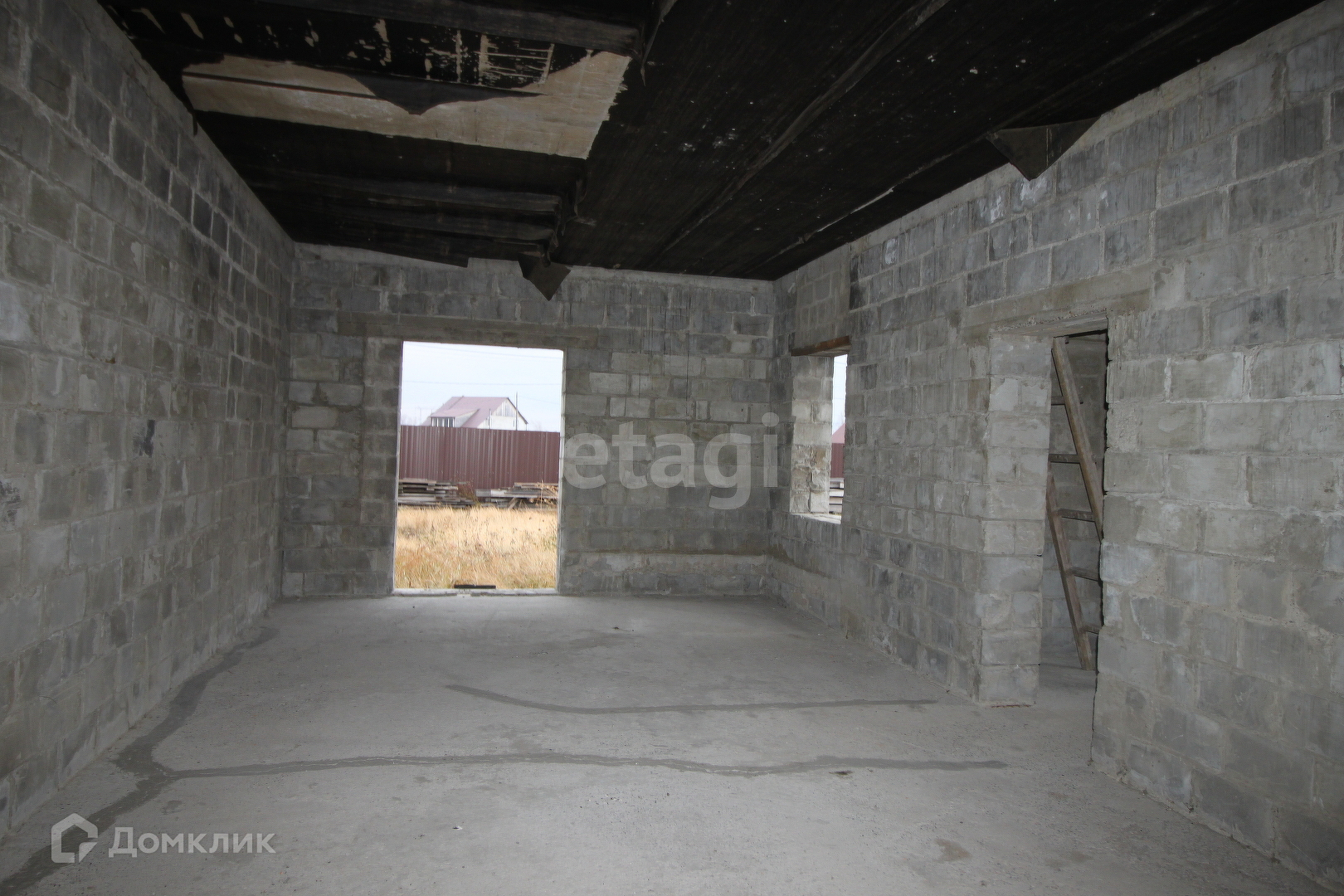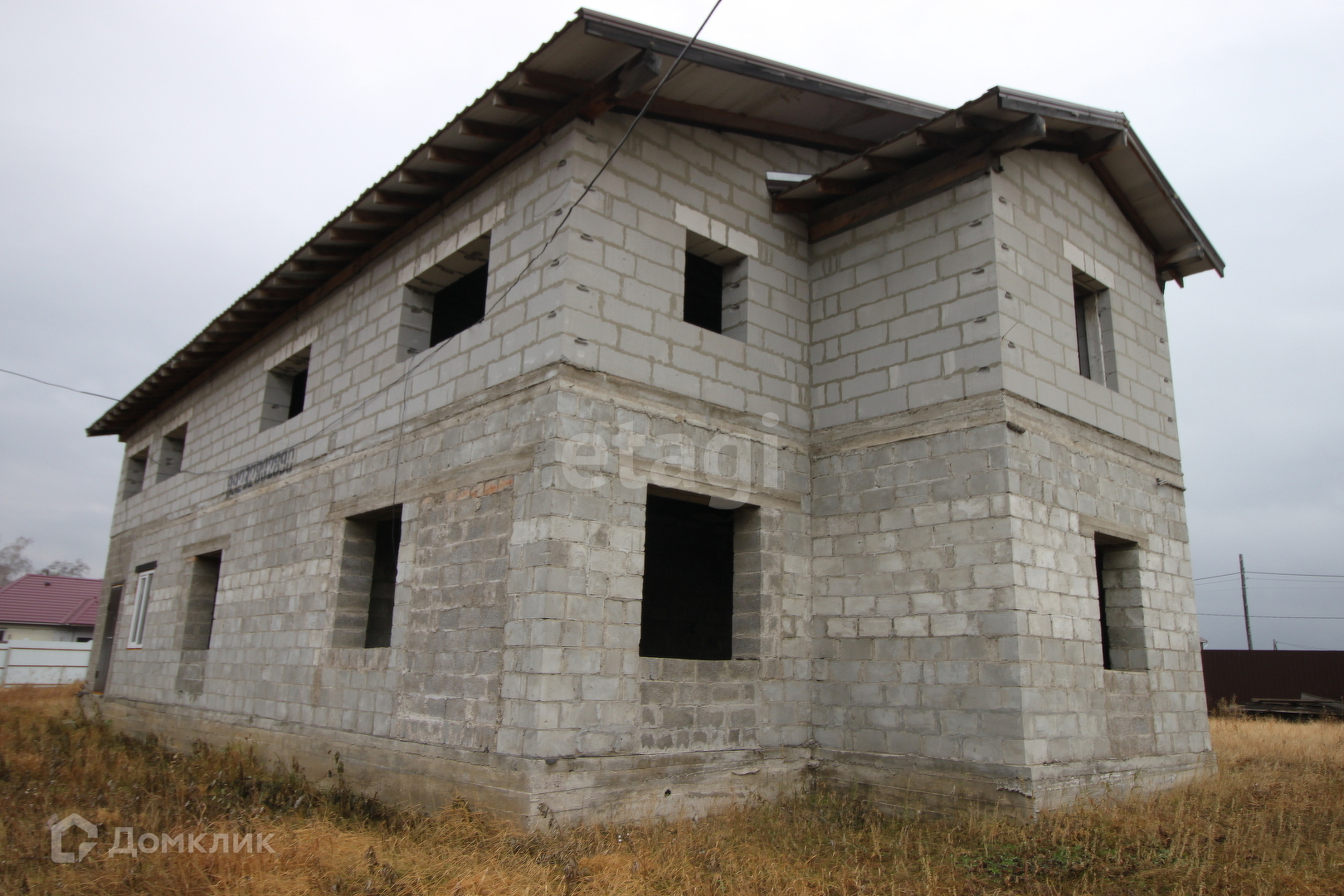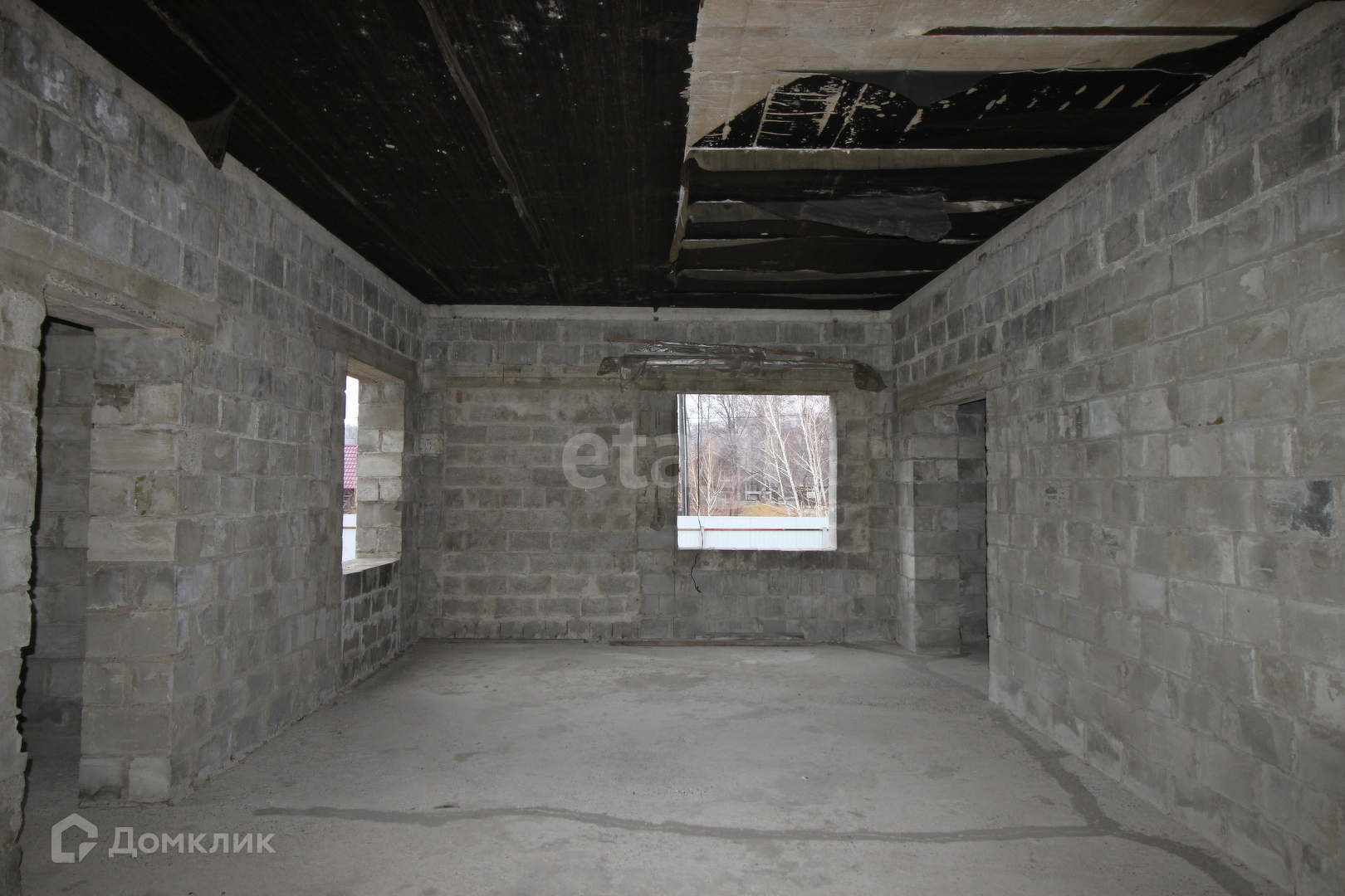 Дом без отделочных работ, окна не установлены.