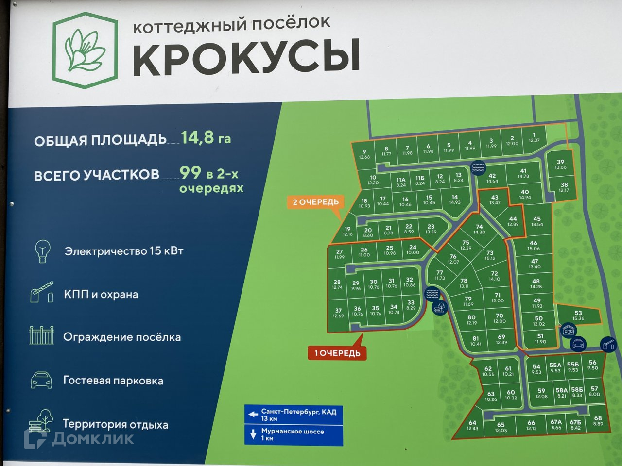 №314376 Ленинградская область, Всеволожский район, посёлок Крокусы, продаётся земельный участок 12,39 соток, отмежёван, в собственности, для дачного строительства, разработан, сделаны проезды внутри посёлка,  электрические столбы вдоль дороги. Коттеджный посёлок для комфортной жизни и отдыха на Коркинском озере. Расположен в 13 км от Санкт-Петербурга, 1,3 км до Мурманского шоссе и в 900 метрах до Коркинского озера. Набор коммуникаций: 15 кВт электричества, дороги из асфальтной крошки, возможно подключение к водопроводу по целевой программе. Отдых в посёлке безопасен благодаря единому ограждению территории, пропускному режиму и охране. Благоустройство будет дополнено детской площадкой. Подъезд возможен с Мурманского шоссе и через д. Коркино. Возможна оплата ипотекой, субсидией.